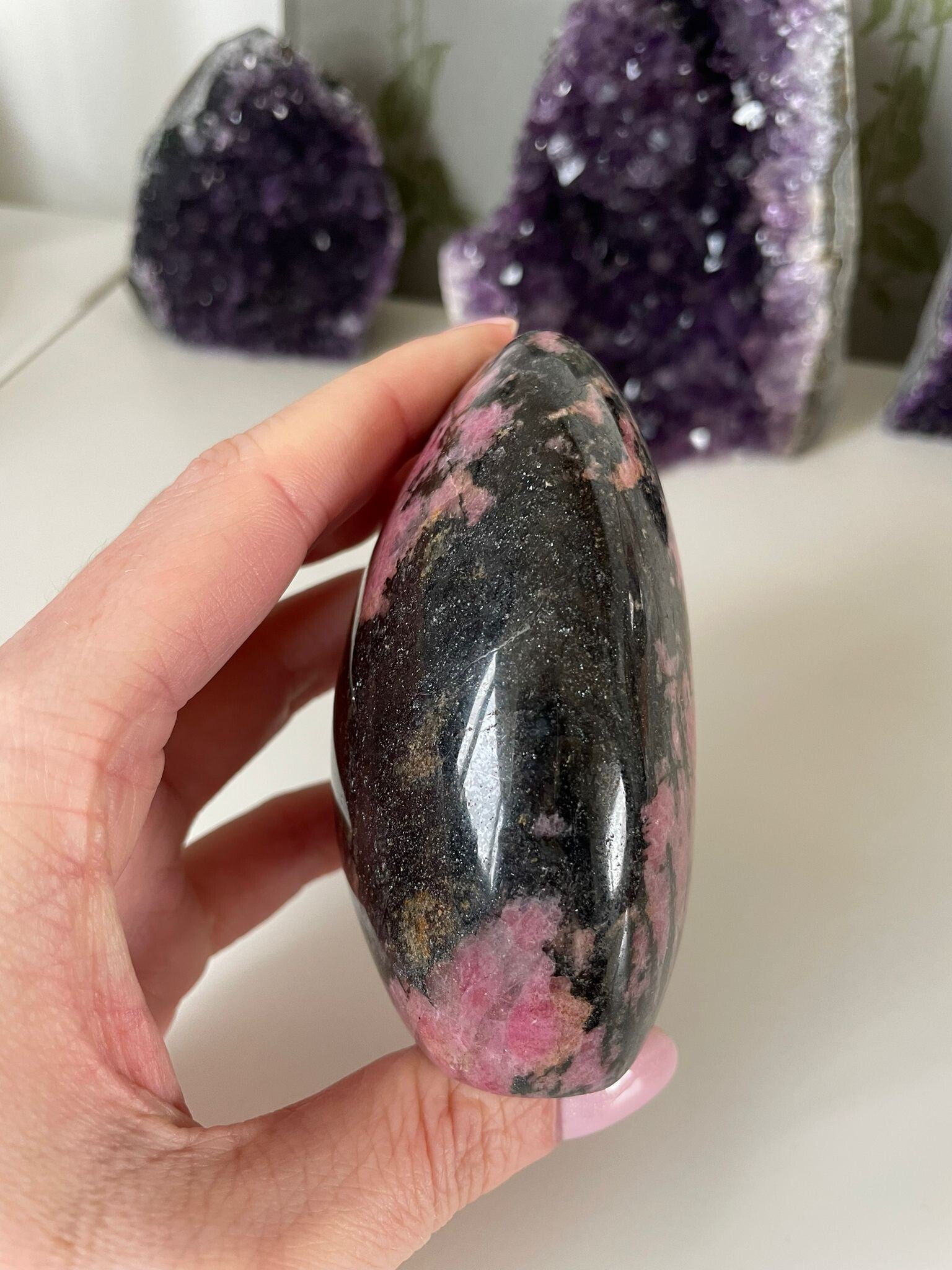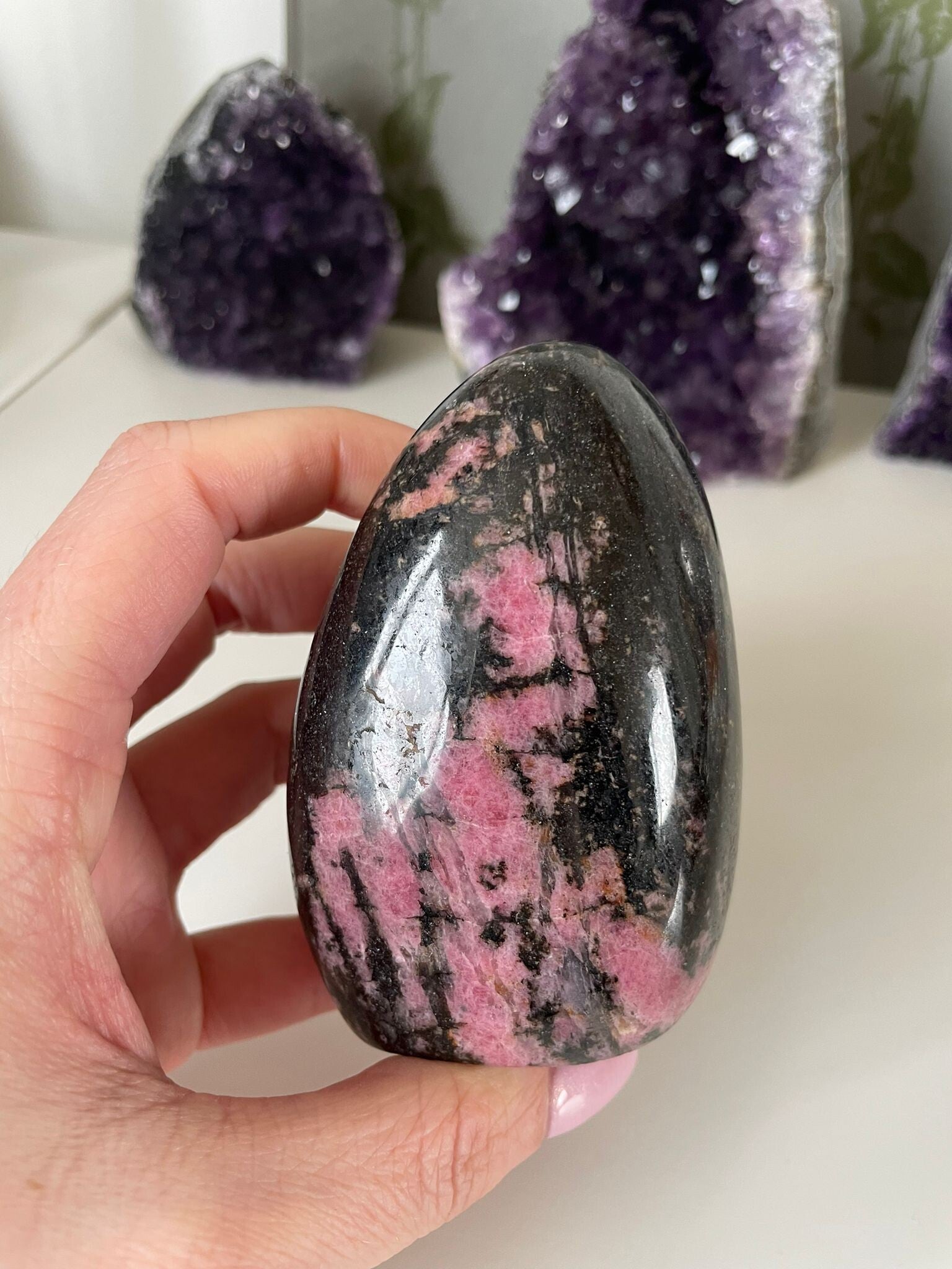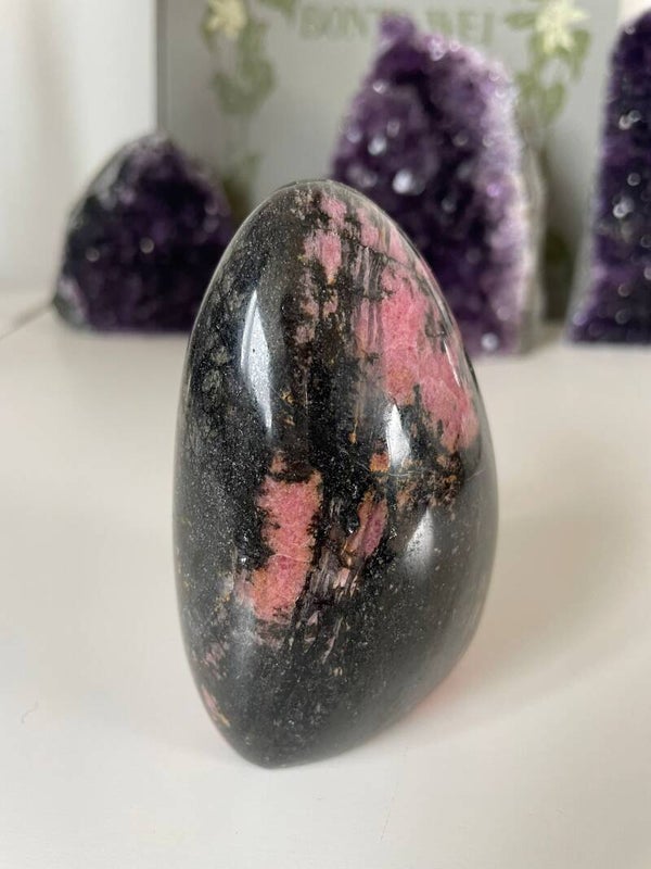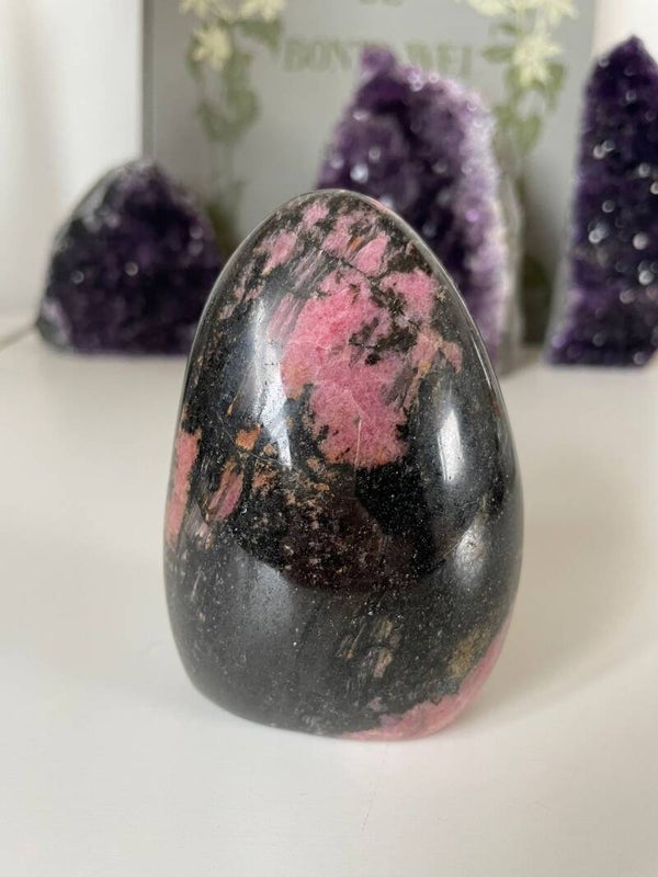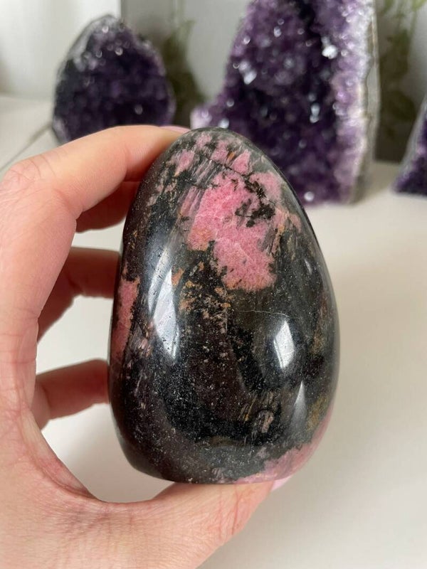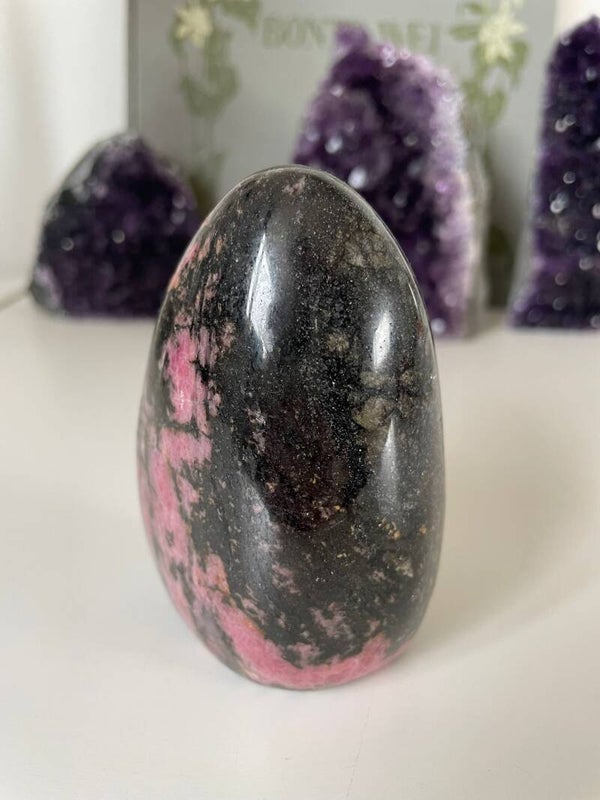 Leuk weetje: De zwarte aders in Rhodoniet zijn vaak mangaanhoudende mineralen. Het contrast tussen het roze en zwart maakt dat iedere steen echt een uniek kunstwerkje is van de natuur.