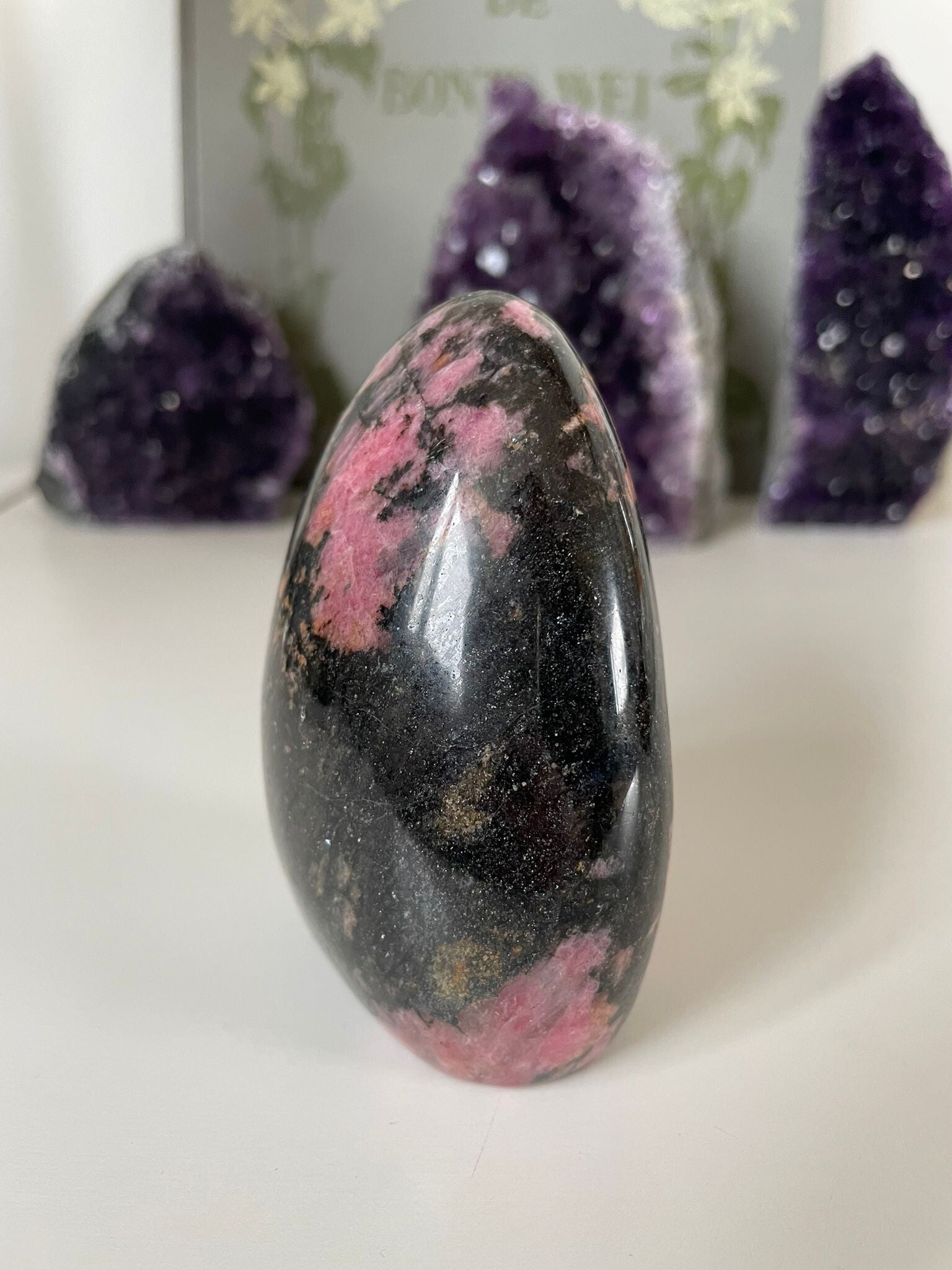 Rhodoniet is een opvallende steen met zachte tot felroze tinten, vaak dooraderd met zwarte sporen die elke steen een uniek patroon geven. Zijn naam is afgeleid van het Griekse rhodon, wat ‘roos’ betekent — een passende verwijzing naar de mooie rozetinten in de steen.