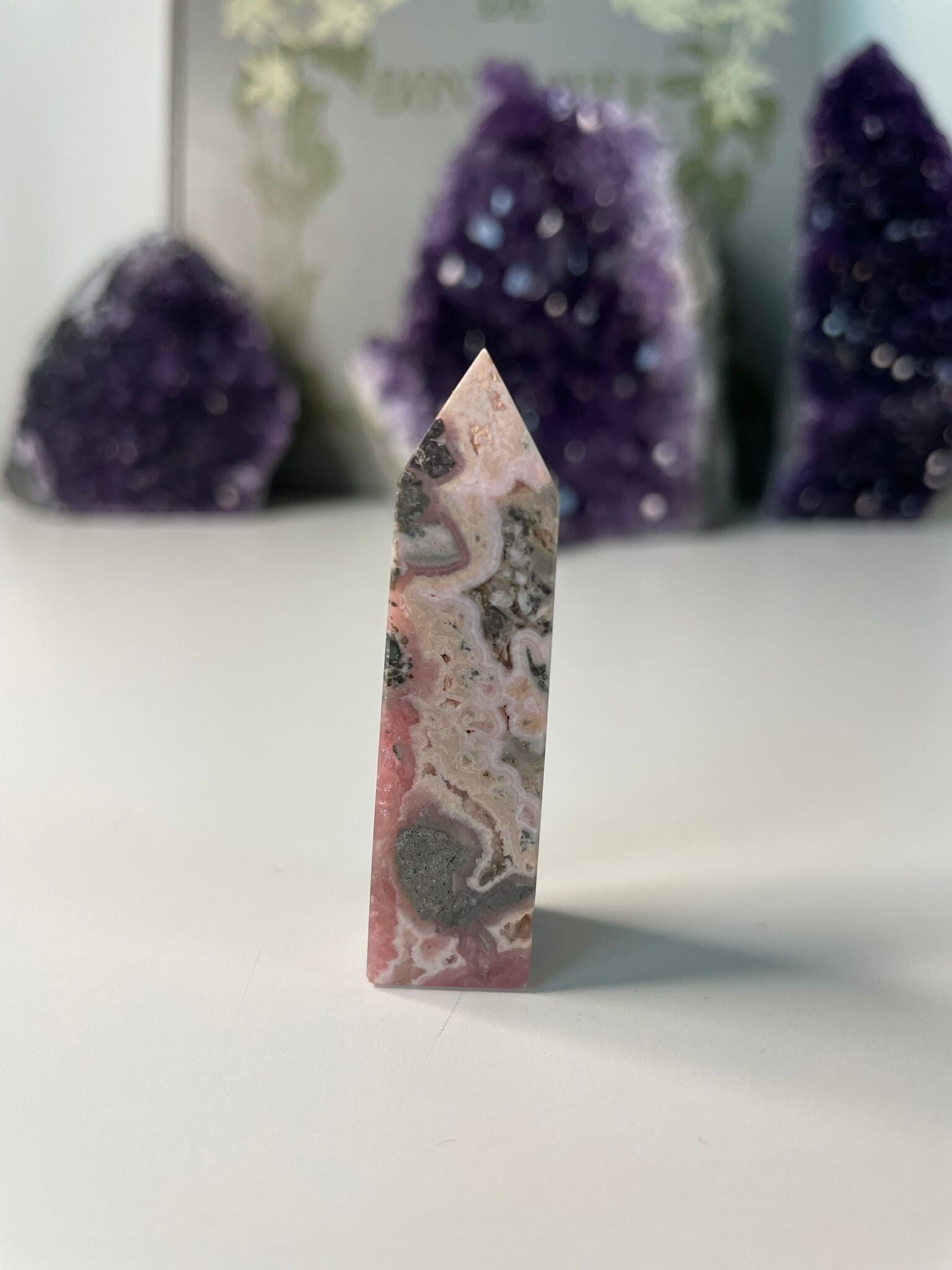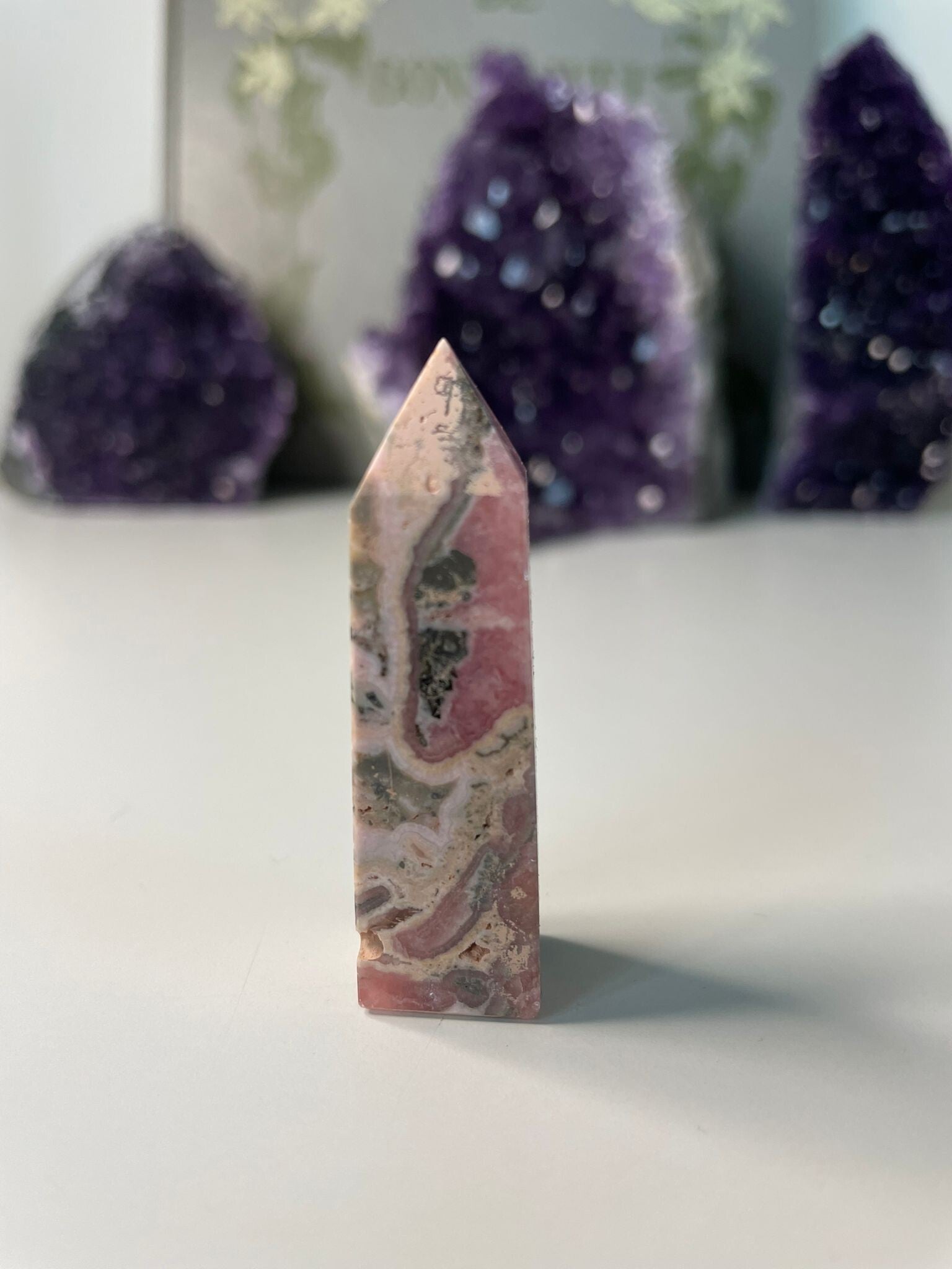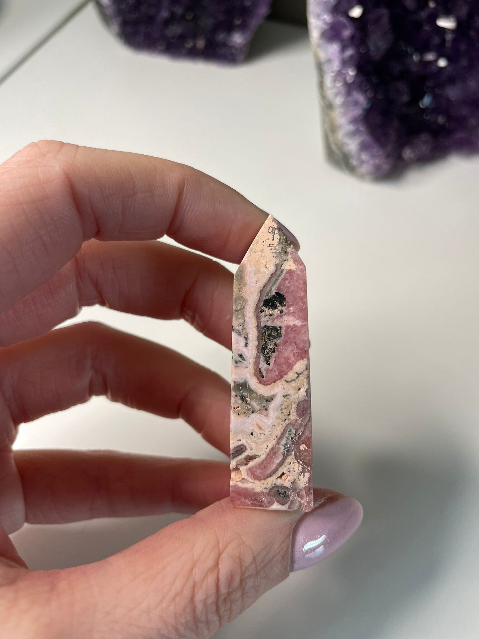 Rhodochrosiet is een steen waar je spontaan vrolijk van wordt. Met z’n roze tinten, soms licht en romig, soms helder framboosroze, en z’n kenmerkende witte bandjes, lijkt het bijna alsof iemand er voorzichtig met penseelstreken doorheen heeft geverfd. Geen twee stukken zijn hetzelfde, iedere steen heeft z’n eigen unieke ‘patronen’.