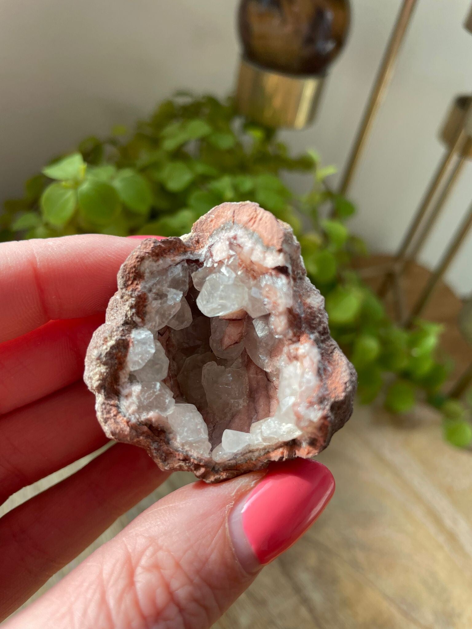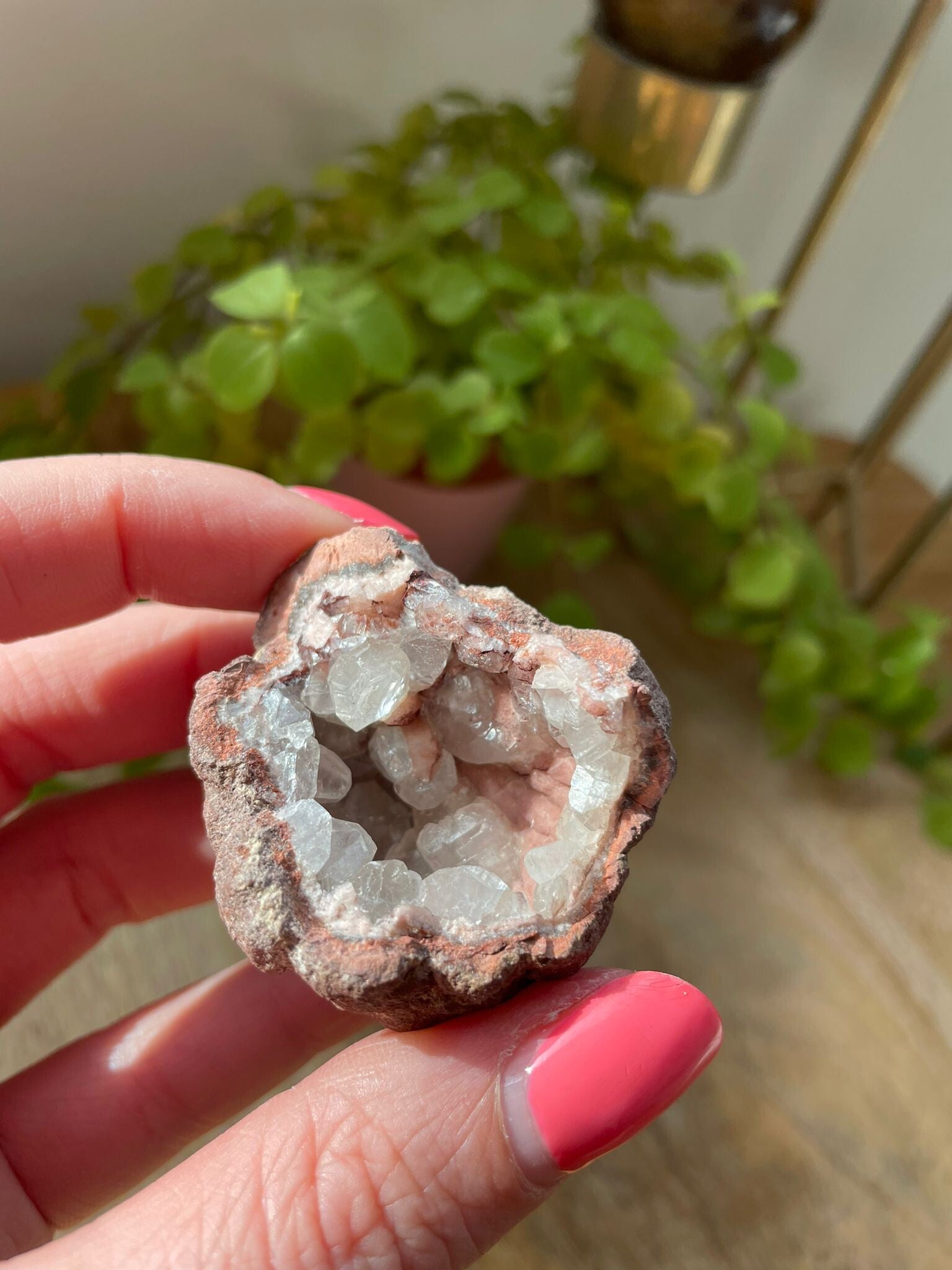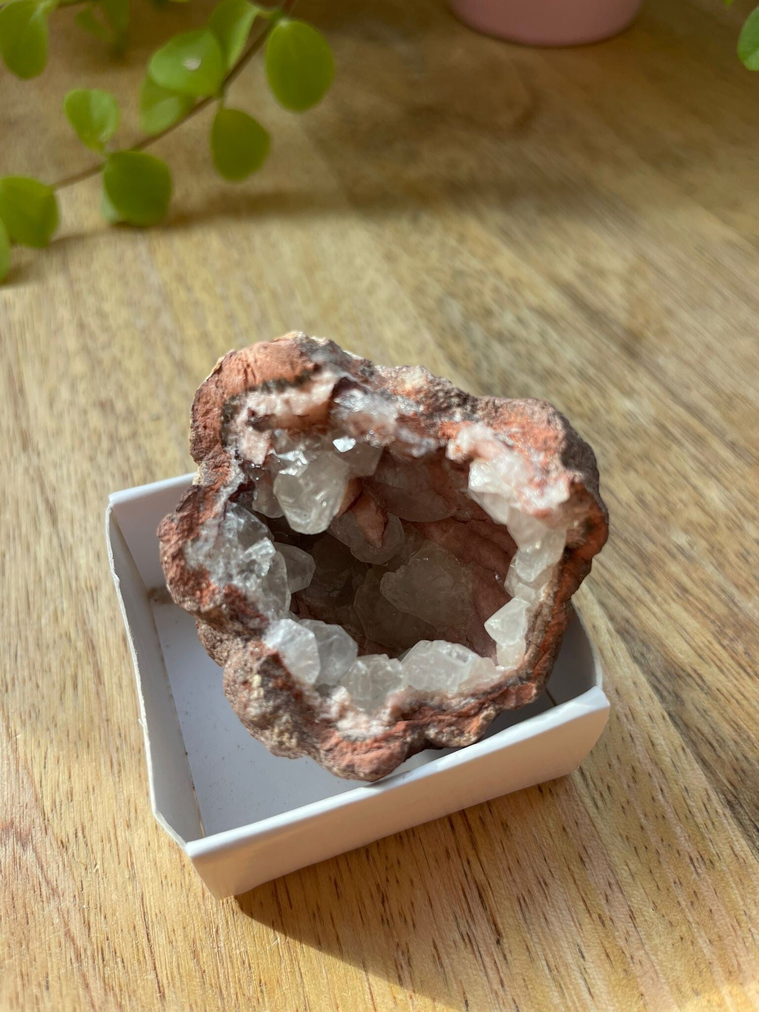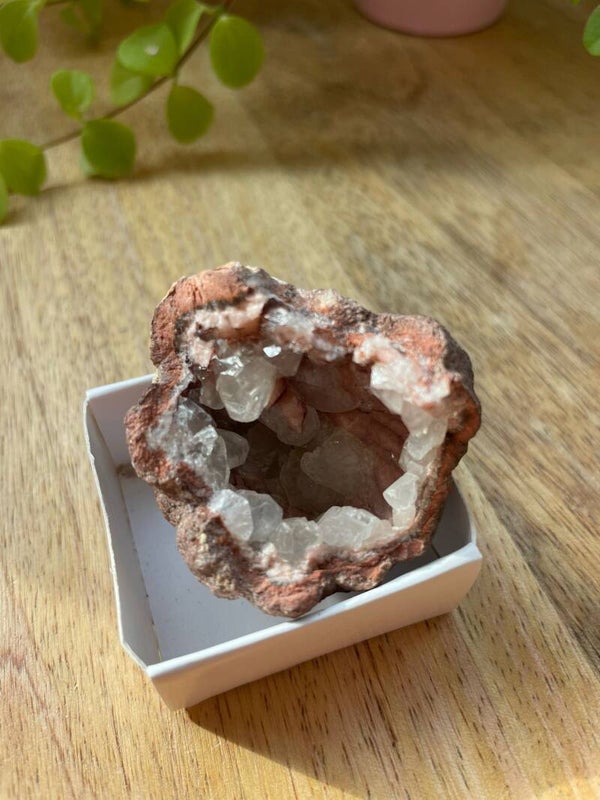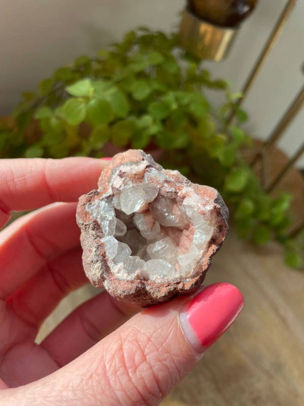 Deze schoonheid wordt vooral gevonden in Brazilië en Uruguay, waar hij in geodes groeit: holtes vol glinsterende kristalpuntjes die eruitzien alsof de aarde zelf een suikerklontje heeft laten kristalliseren. Elke geode heeft een unieke structuur, soms strak kristallijn, soms juist speels en grillig.