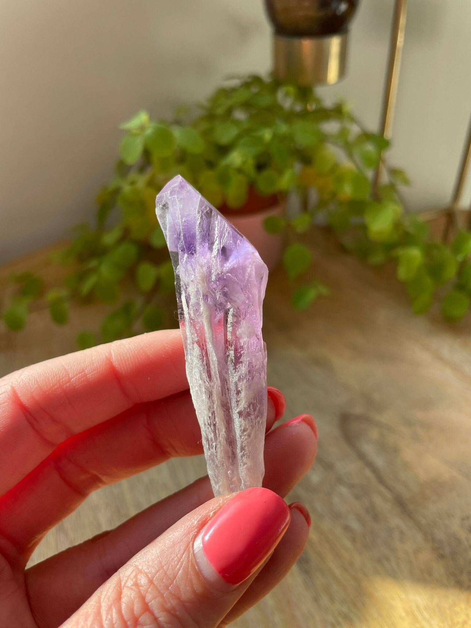 Deze krachtige variant van amethist staat bekend om zijn aardende én kalmerende werking. Hij helpt bij het loslaten van onrust en stimuleert innerlijke rust, helderheid en focus. Perfect voor mensen die houden van authentieke, onbewerkte stenen met karakter.