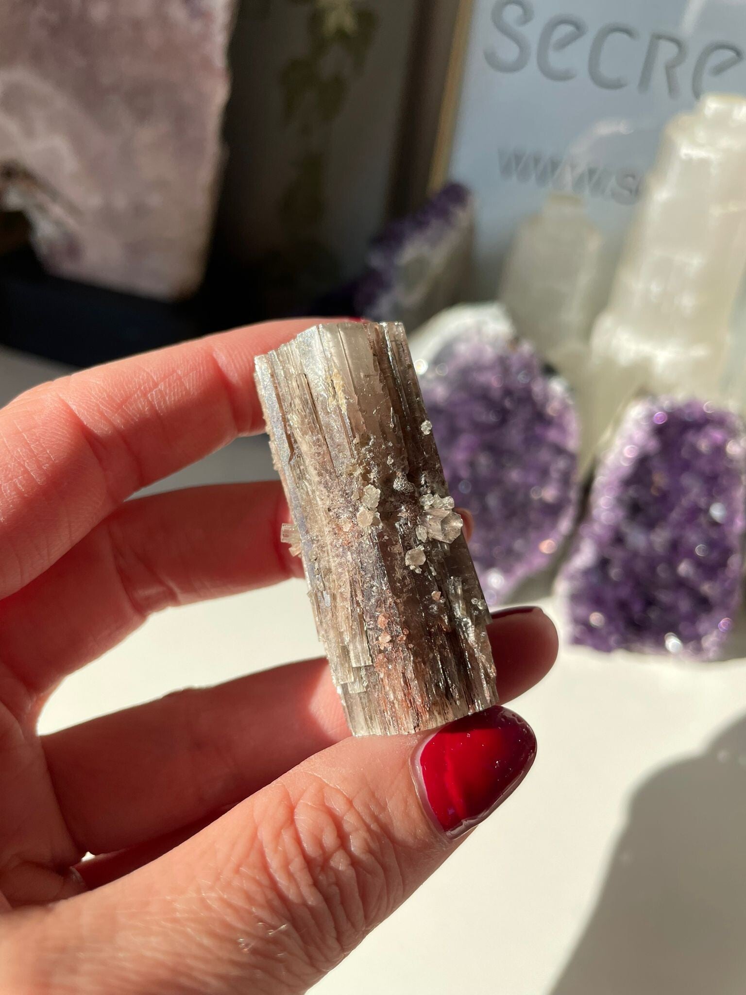 Leuk weetje: De paarse kleur van deze aragoniet ontstaat door sporen van strontium in het mineraal, een natuurlijke kleurmaker die voor die magische paarse tint zorgt!