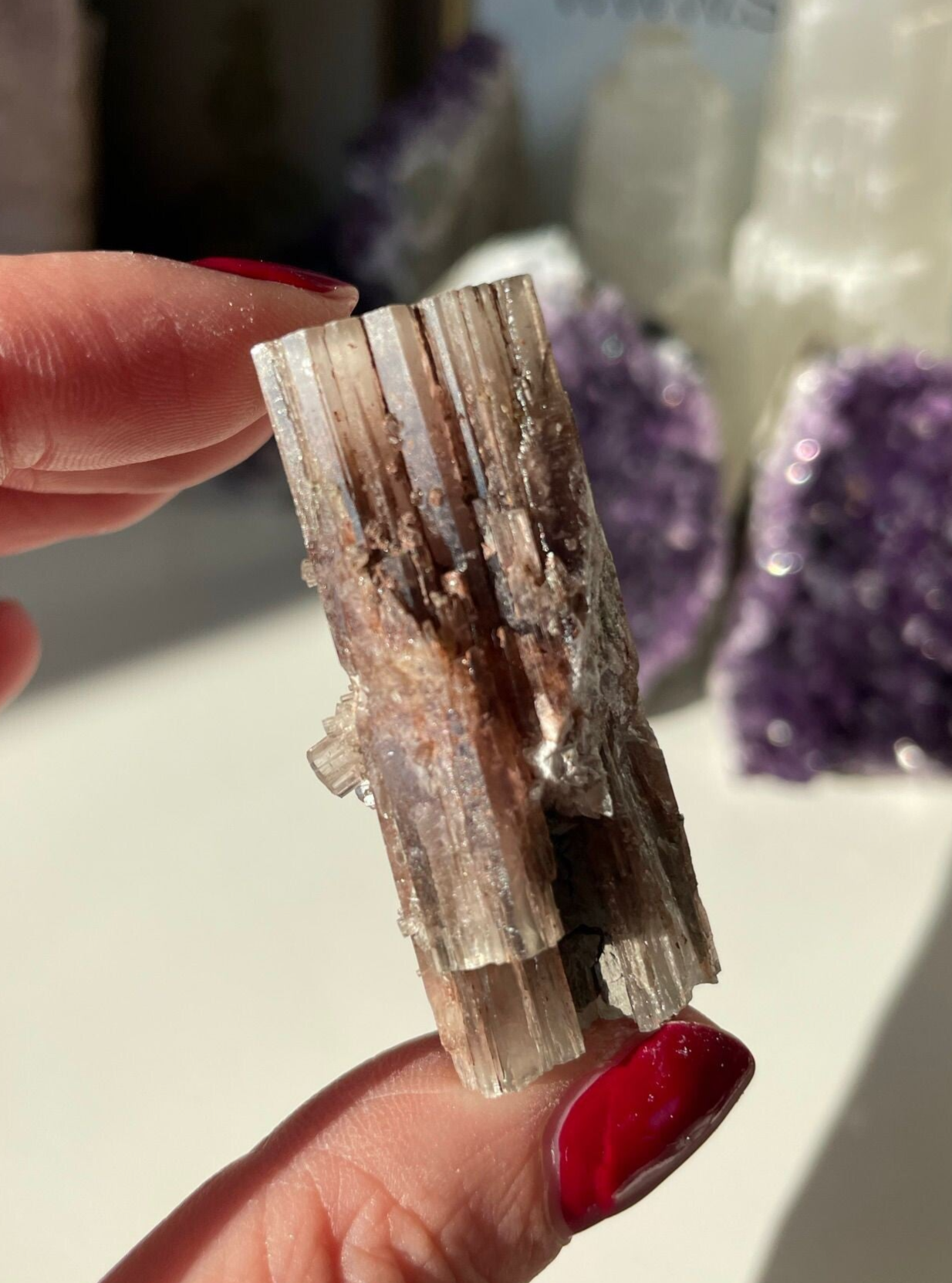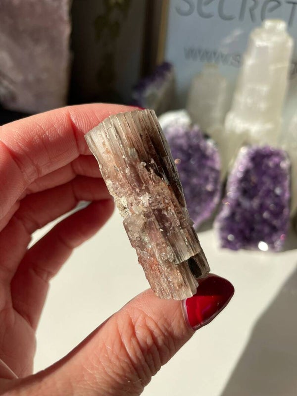 Paarse Aragoniet is zo’n steen waar je meteen even bij stil blijft staan. Met haar bijzondere kleur, variërend van lavendel tot dieper paars, straalt ze iets kalms en mysterieus uit. Deze zeldzame variant van aragoniet wordt vooral gevonden in Spanje en China, waar ze in grotten en kalkrijke gesteenten groeit.
