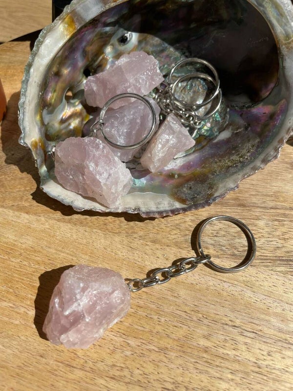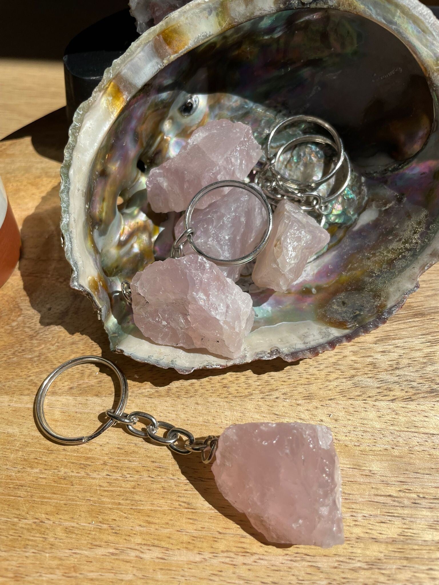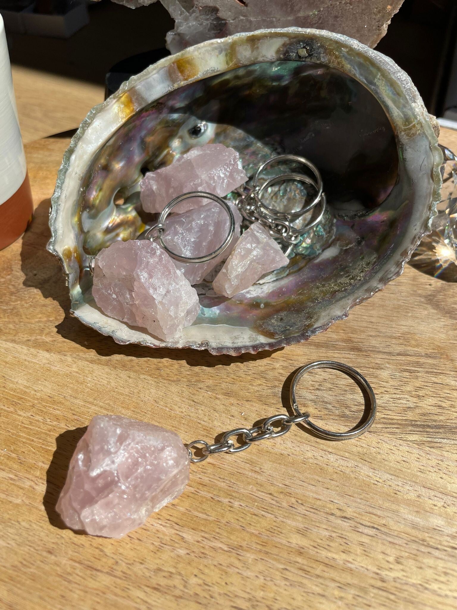 Ruwe Rozenkwarts sleutelhanger, je krijgt een willekeurige sleutelhanger. Zij zijn rond de 25 gram.
