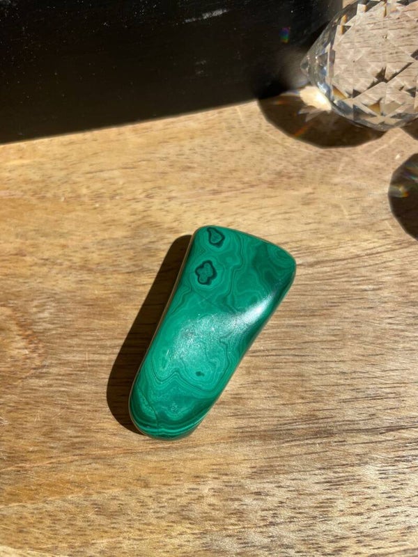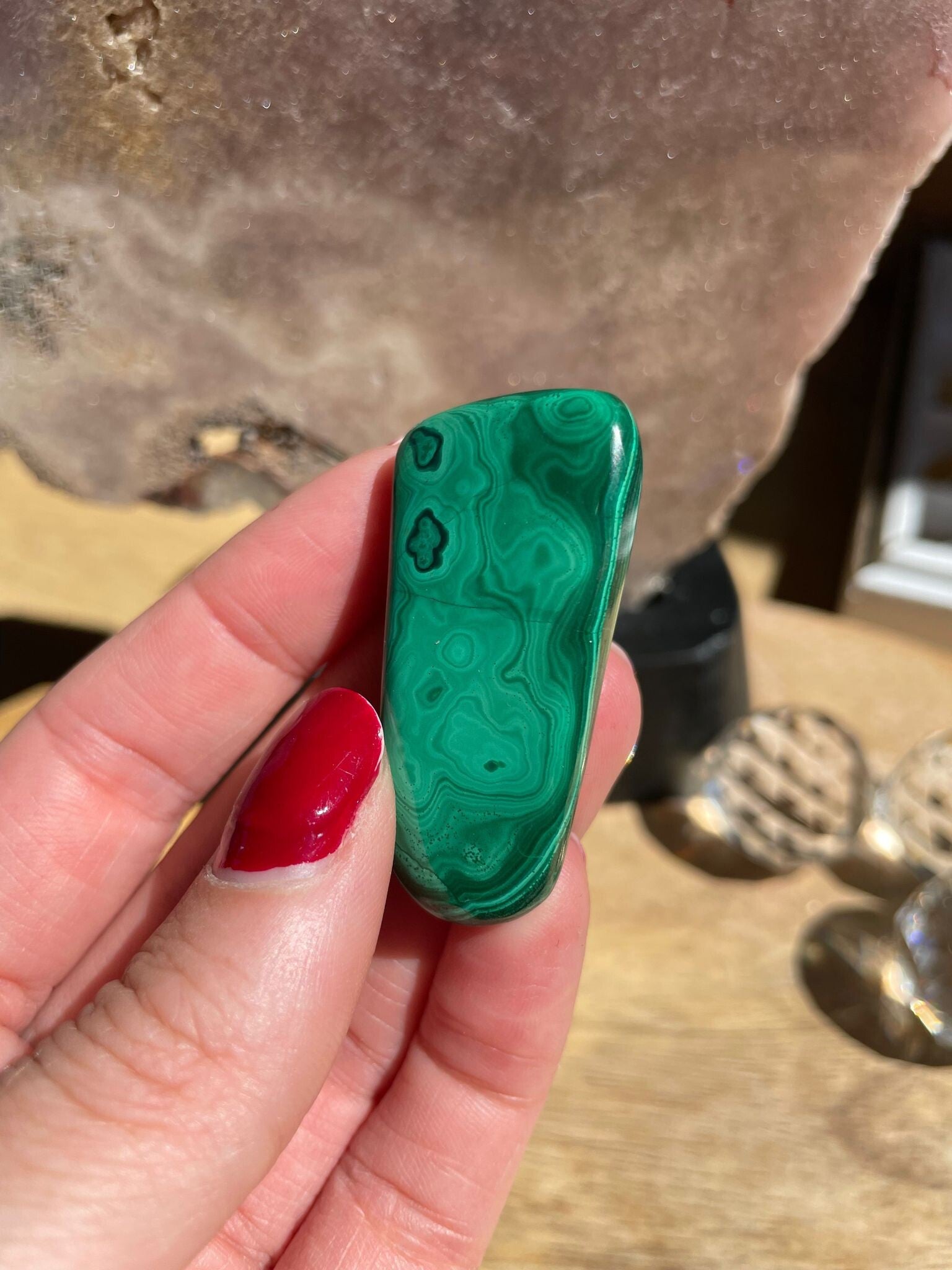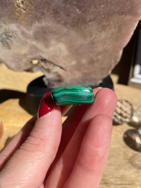 Men zegt dat malachiet symbool staat voor groei en transformatie – een beetje zoals de natuur zelf: steeds in beweging, steeds veranderend. De steen nodigt uit om oude patronen los te laten en met frisse energie verder te gaan.