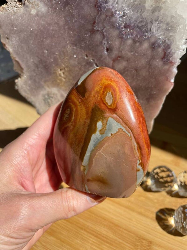 Deze kleurrijke jaspis wordt vooral gevonden op Madagaskar, waar hij in woestijnachtige grondlagen wordt opgegraven. Polychroom jaspis wordt gezien als een steen van vitaliteit, moed en balans, hij helpt je om stevig met beide voeten op de grond te staan, terwijl je toch open blijft voor verandering.