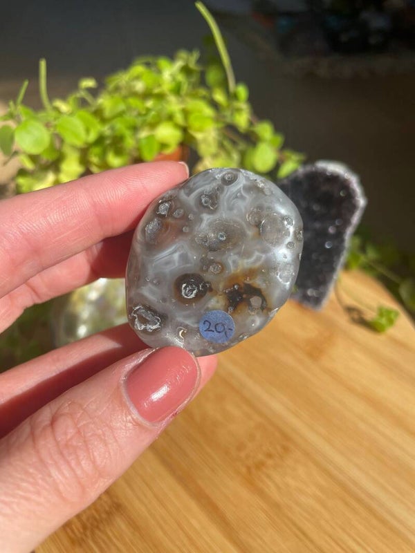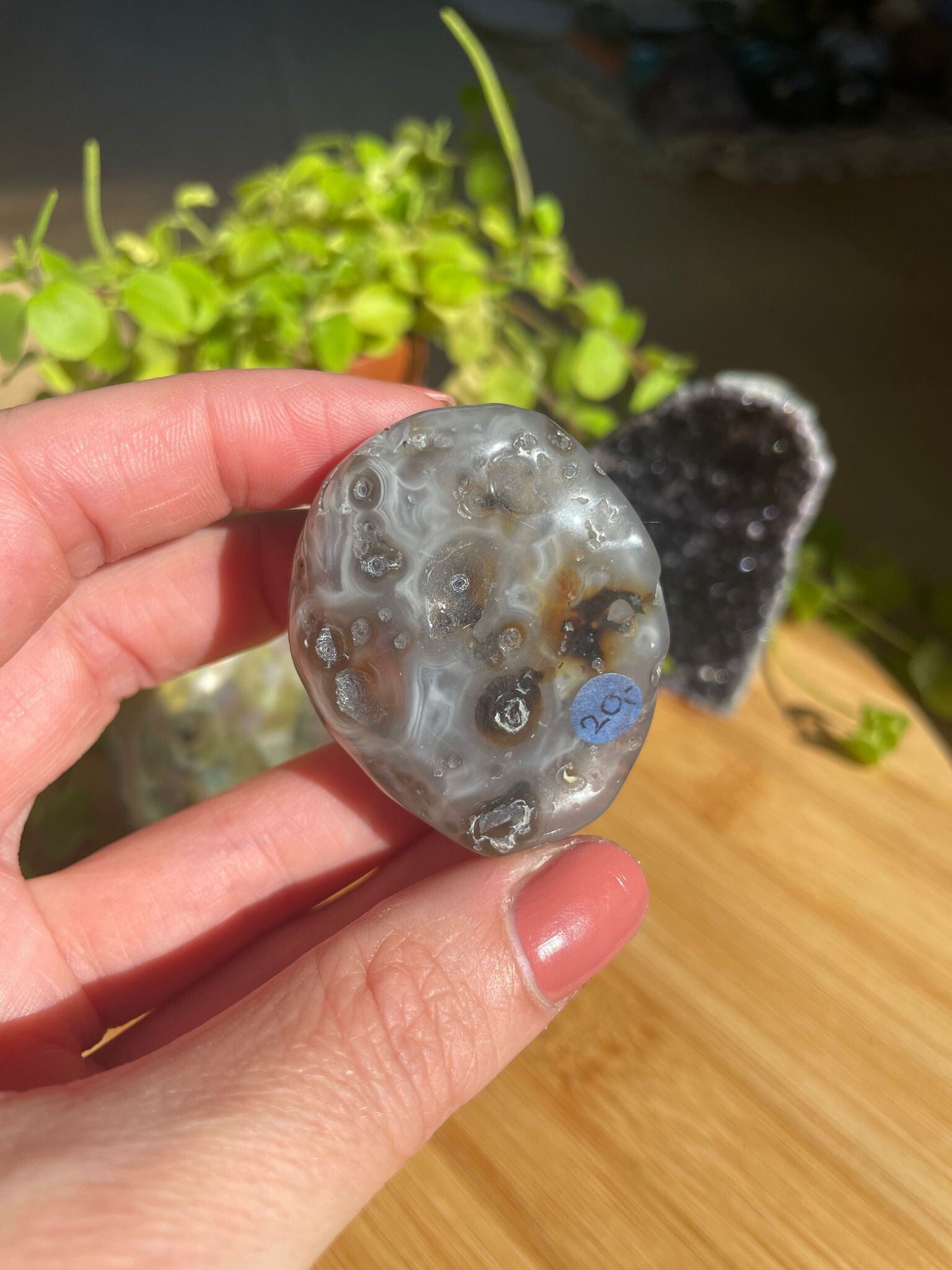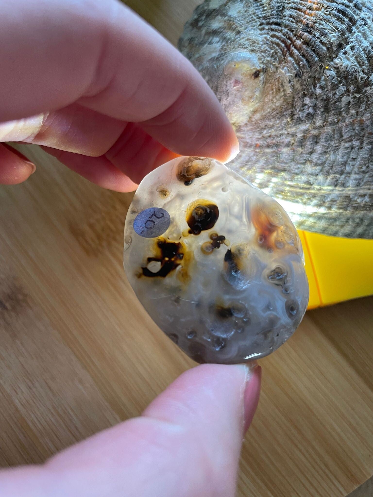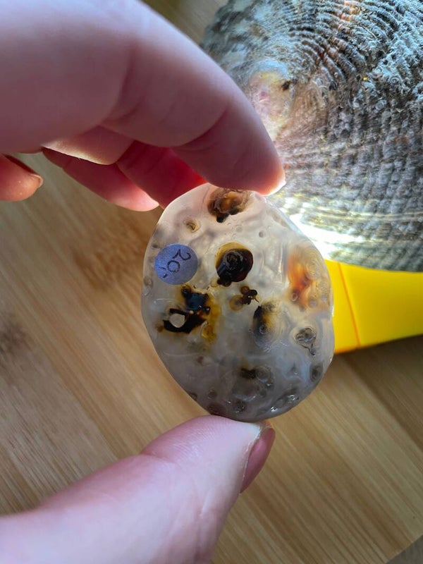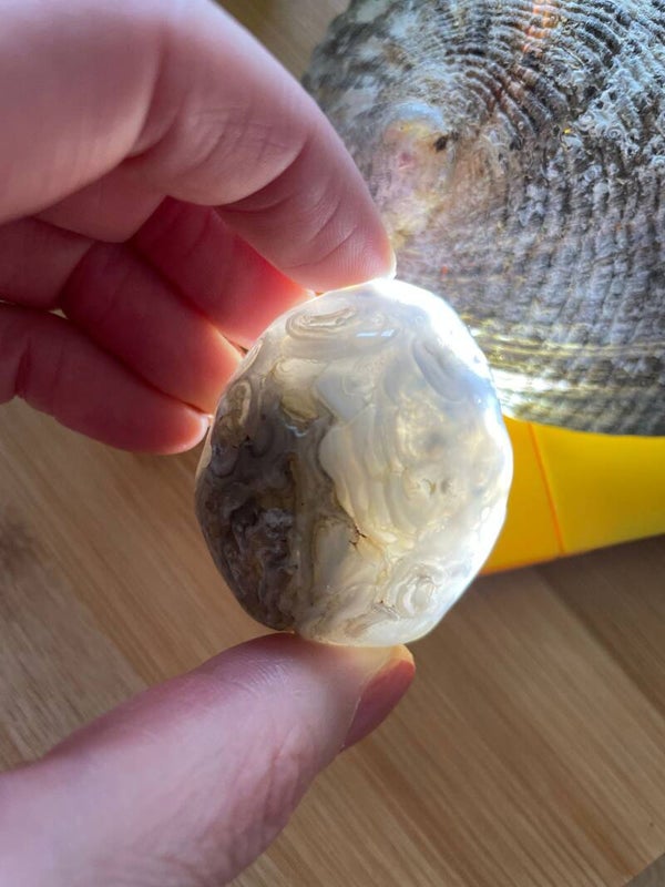 Leuk weetje: Het water in deze agaat kan miljoenen jaren oud zijn en gevangen zijn tijdens het kristallisatieproces. Sommige agaatjes zijn echter poreus en worden bij de slijperij in bakken water gelegd om weer met water gevuld te raken.