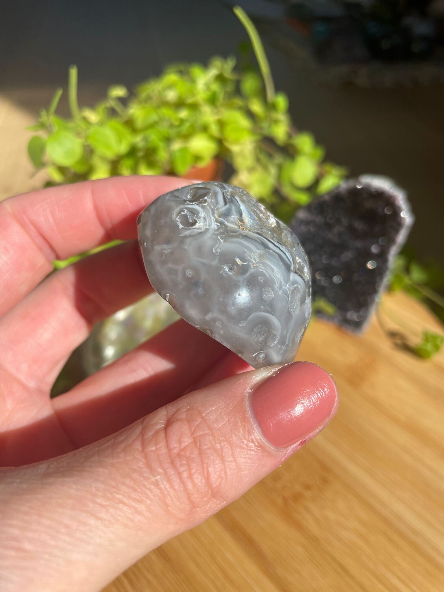 Wateragaat is een bijzondere en betoverende steensoort die zijn naam eer aandoet. Wat deze variant extra speciaal maakt, is dat hij echt water bevat, gevangen in de steen als een miniatuurmeertje.