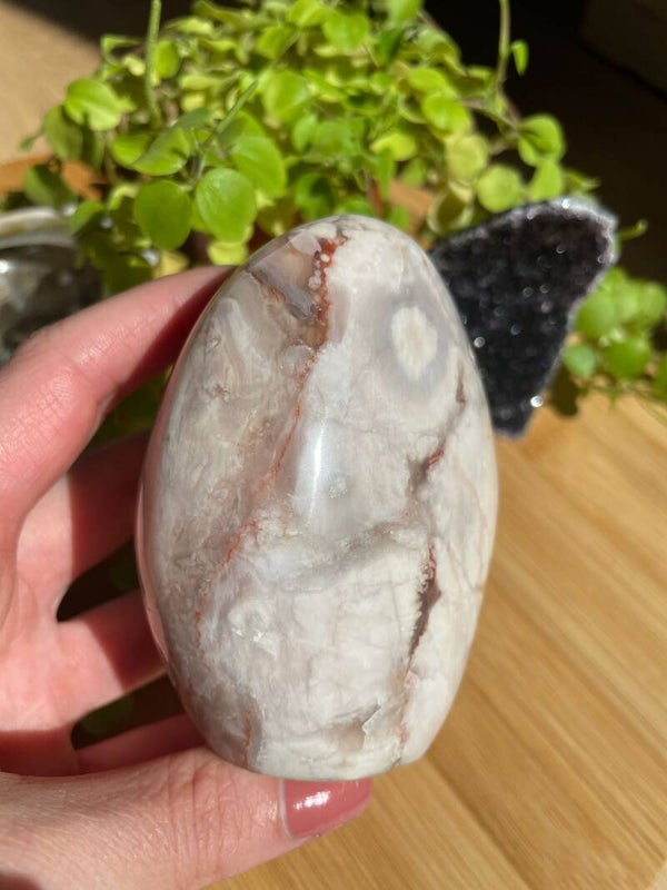 Bloemagaat wordt gevonden in onder andere Brazilië, India en Madagascar. Door de zachte uitstraling is het een fijne steen om bij je te hebben voor momenten van rust of gewoon om van te genieten als mooie blikvanger.