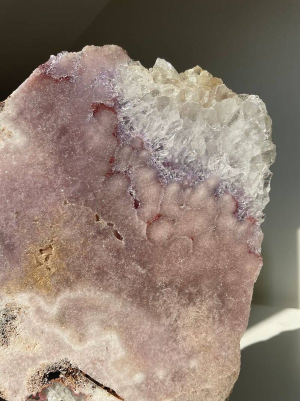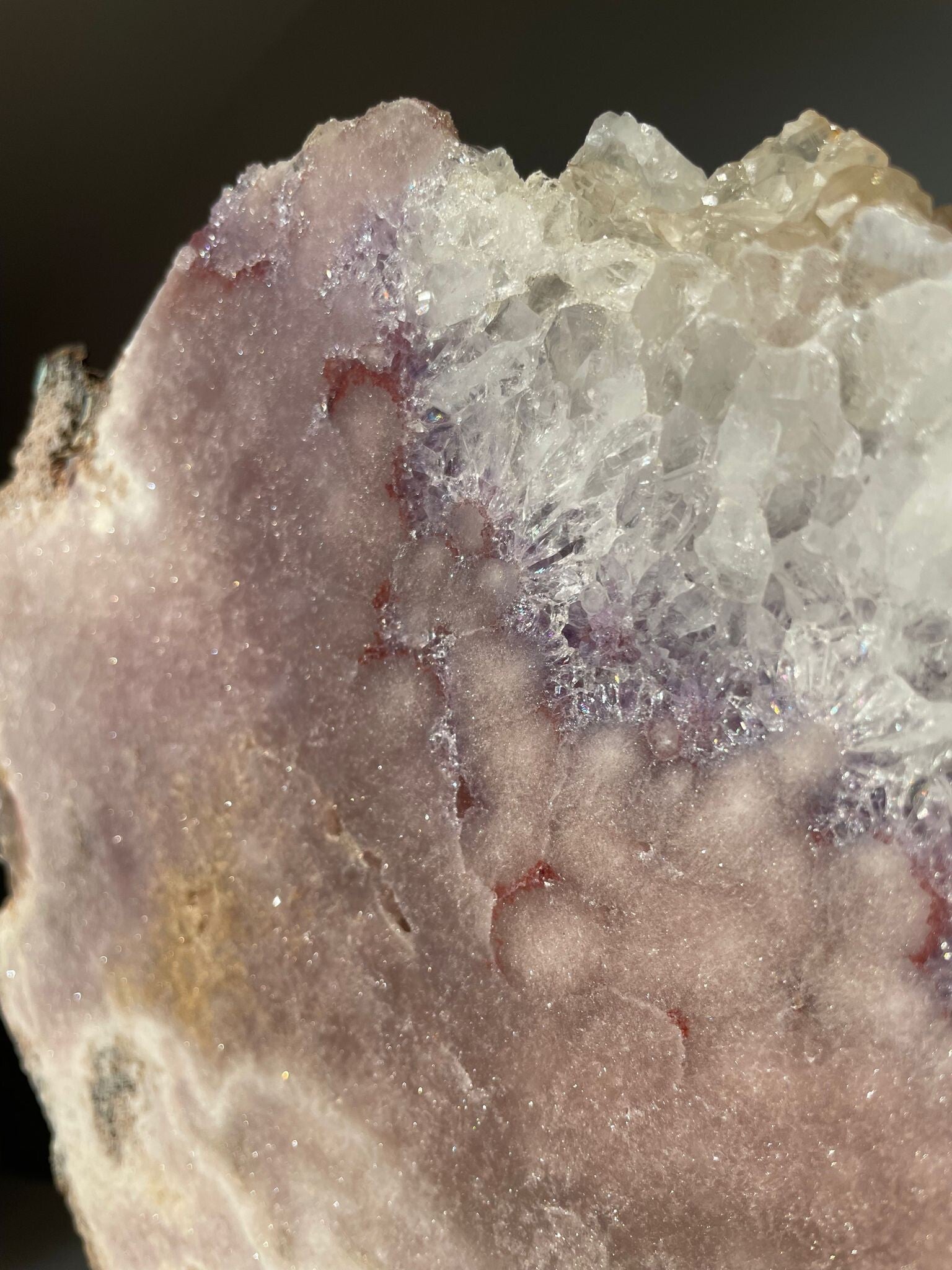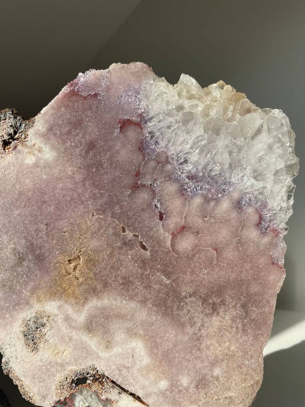 Waar paarse amethist zijn kleur krijgt door ijzer en straling, ontstaat roze amethist door minieme sporen hematiet die de kristallen van binnenuit een warme blush geven. Daardoor is het wetenschappelijk gezien gewoon een variatie binnen kwarts, geen echte amethist-familie.
