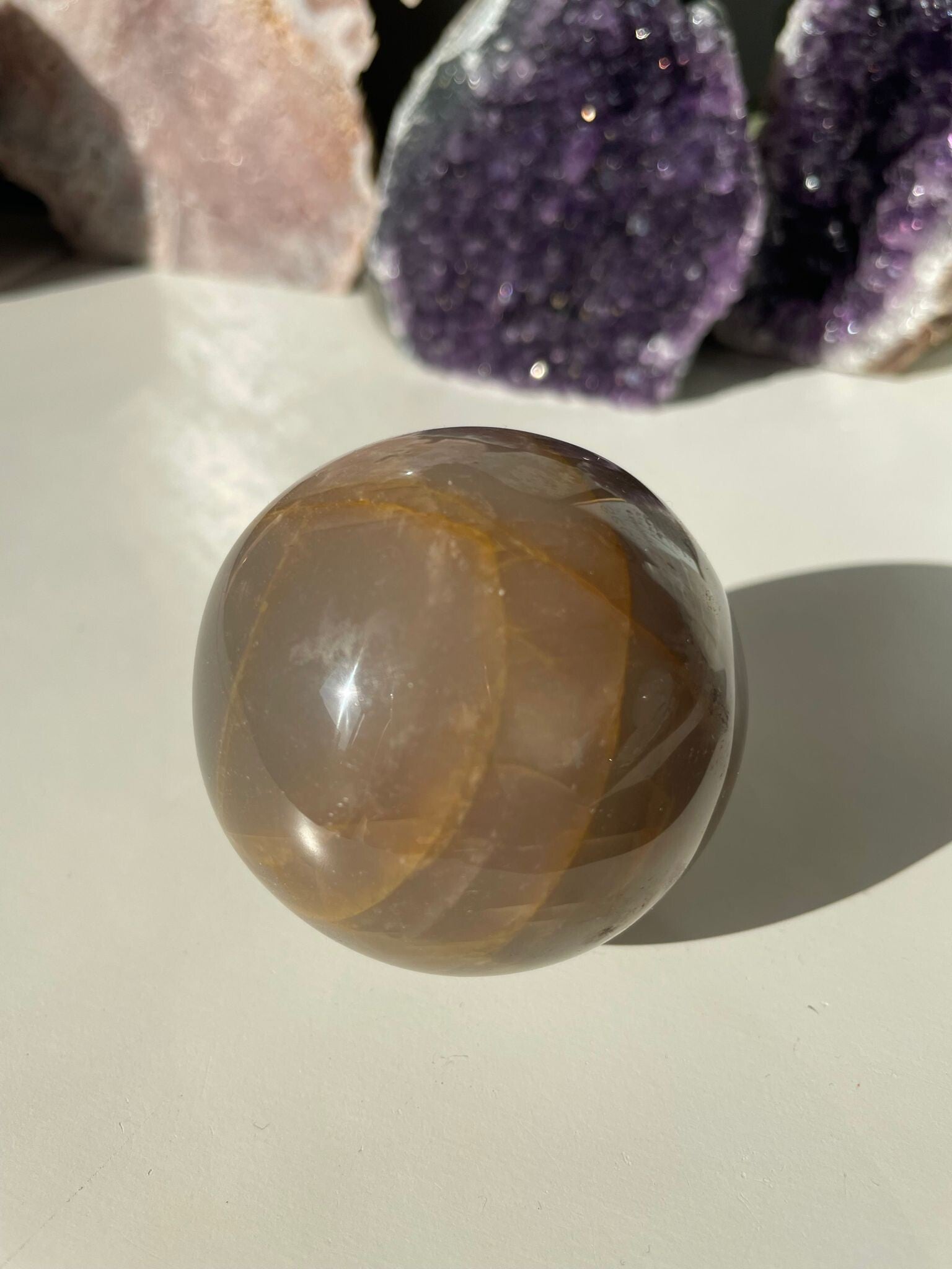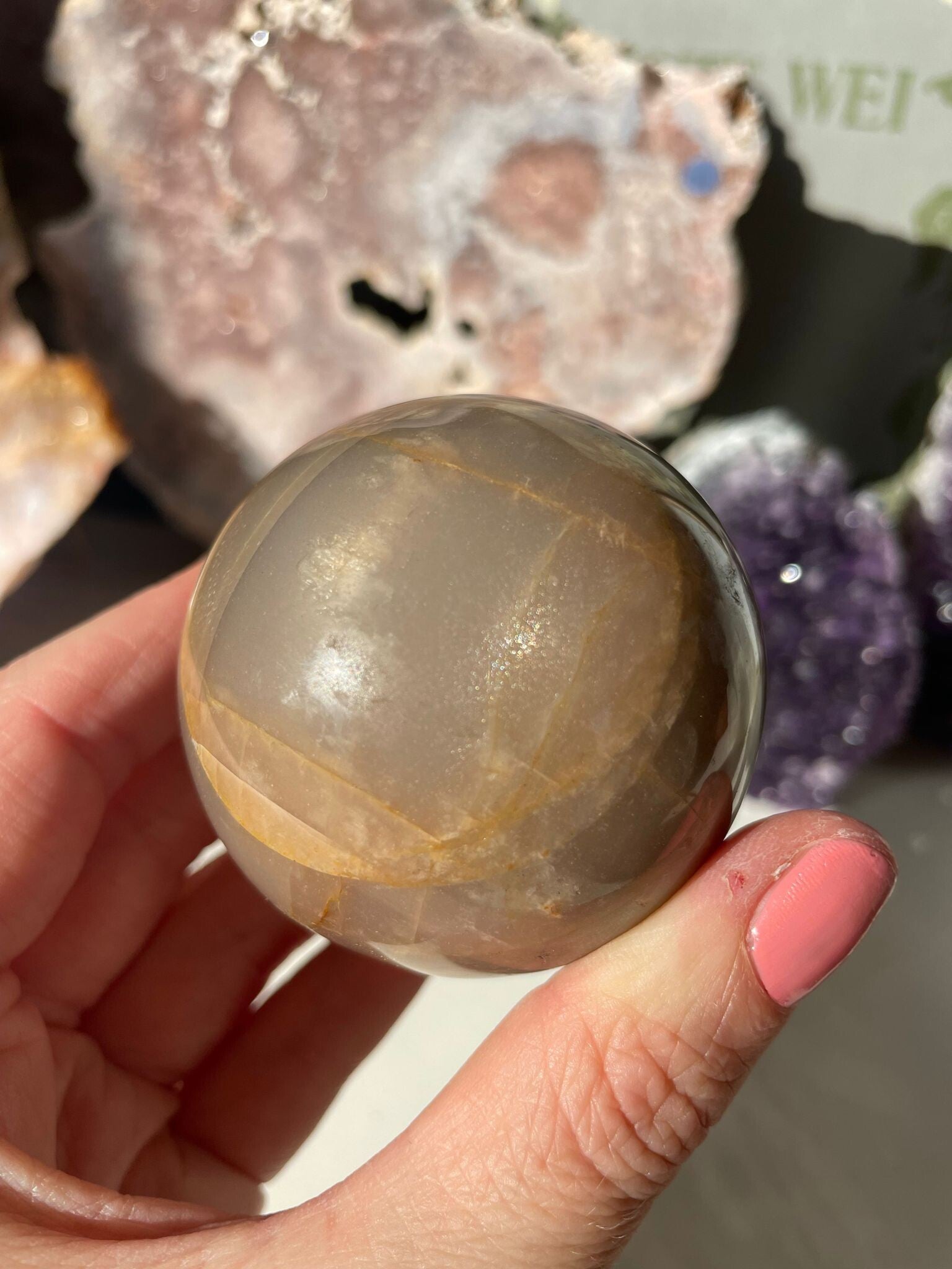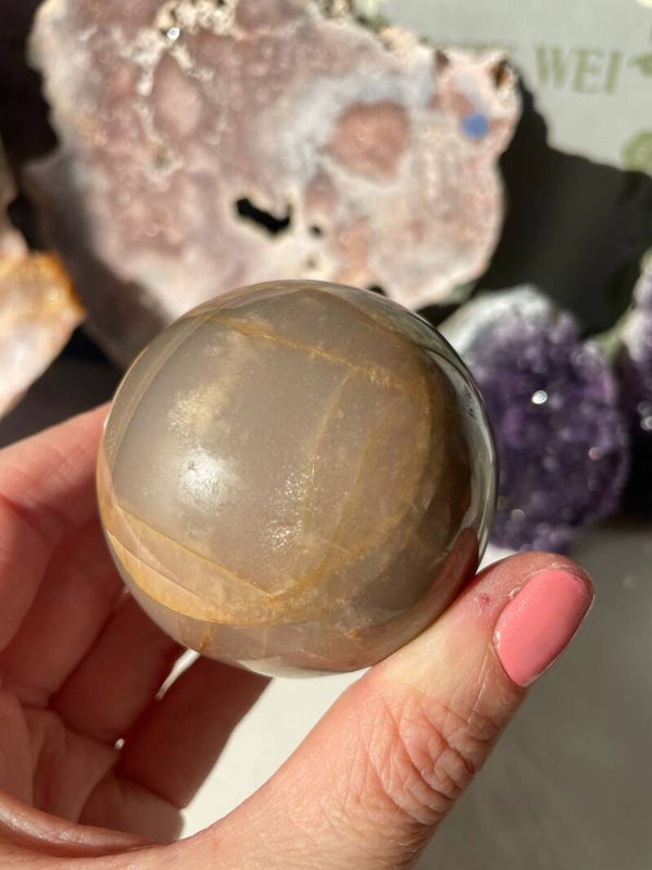 Men zegt dat microklien maansteen helpt om rust te vinden en helderheid te brengen bij emotionele verwarring. Hij heeft iets dromerigs, maar blijft stevig gegrond — alsof de maan even op bezoek is bij de aarde.