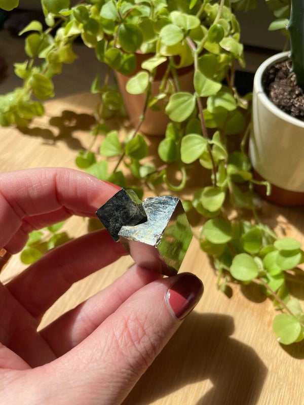 Kubus Pyriet valt direct op door zijn opvallende, regelmatige kubusvormen en glimmende metalen glans. Pyriet, ook wel "fool’s gold" genoemd, dankt zijn bijnaam aan zijn gouden kleur en glans, die op echt goud lijkt, maar een stuk vriendelijker voor je portemonnee is.