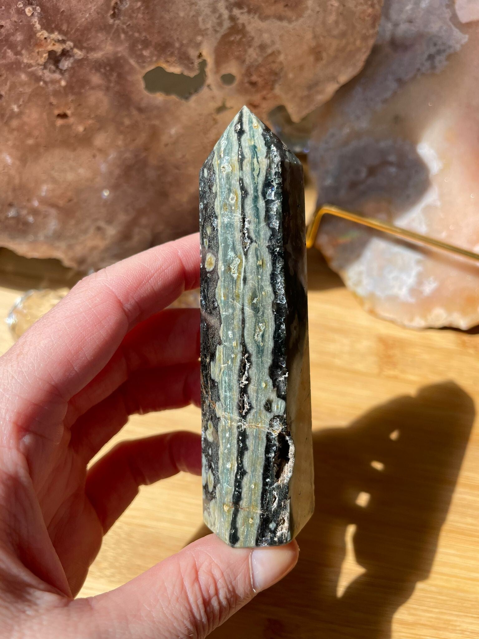 Leuk weetje: deze bijzondere jaspis wordt gevonden aan de kust van Madagaskar, waar hij pas zichtbaar wordt als het water zich bij eb terugtrekt. Elk stuk is dus letterlijk gevormd in het ritme van de aarde!