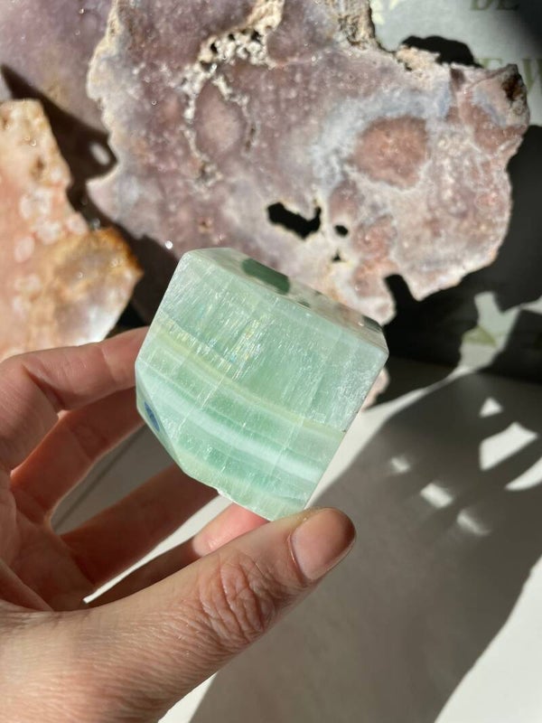 De steen voelt licht en verfrissend aan en staat bekend om haar zachte, positieve energie. Ze wordt vaak gebruikt om ruimtes op te fleuren of als een steen om even bij op adem te komen. Voor wie van natuurlijke tinten houdt, is deze calciet een kleine eyecatcher in huis of op je bureau.