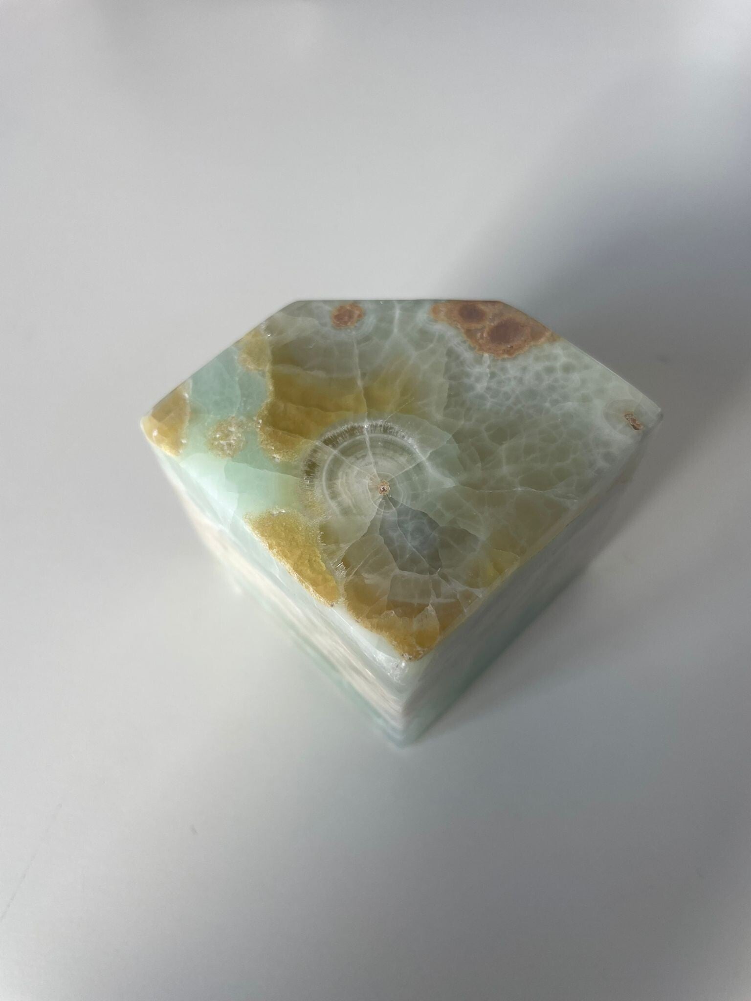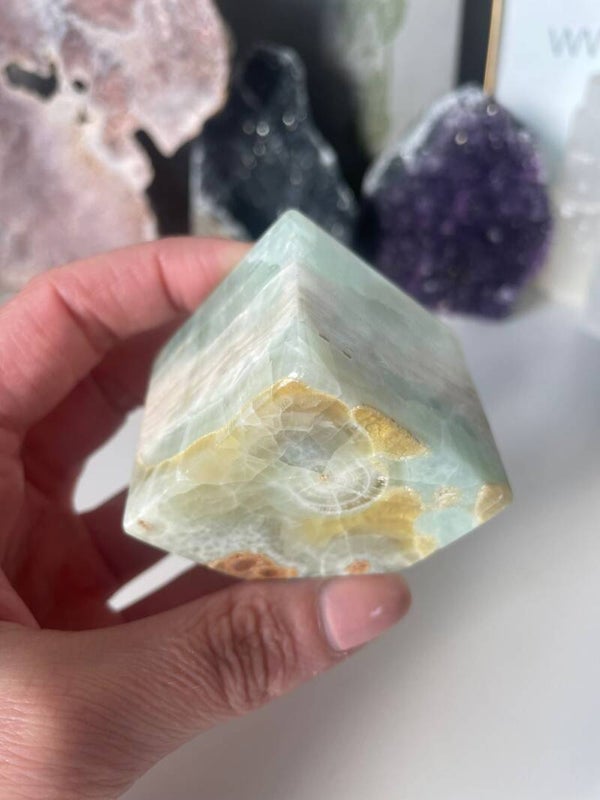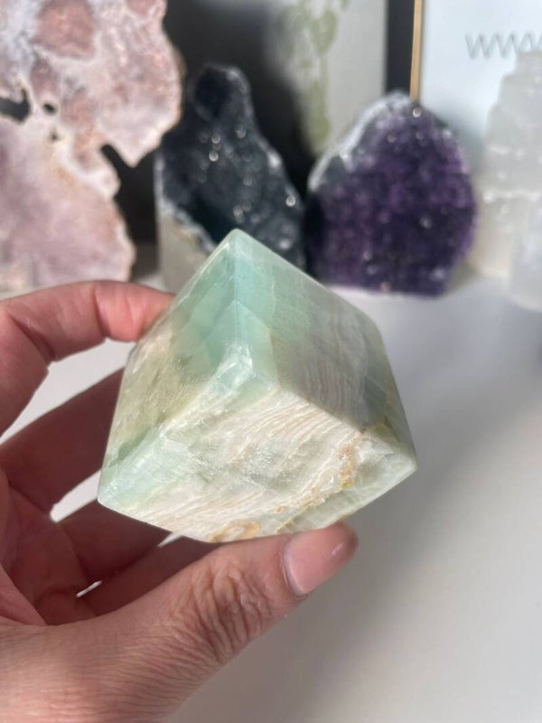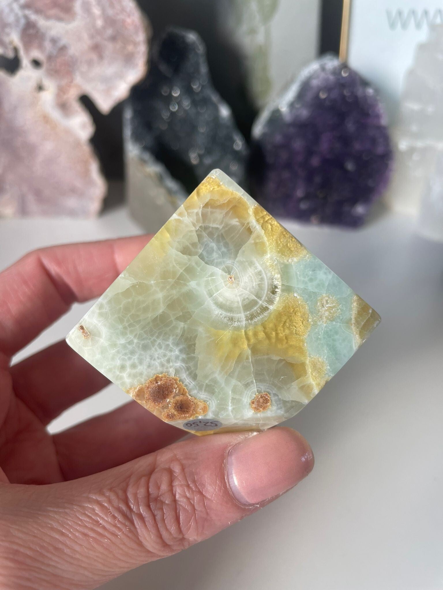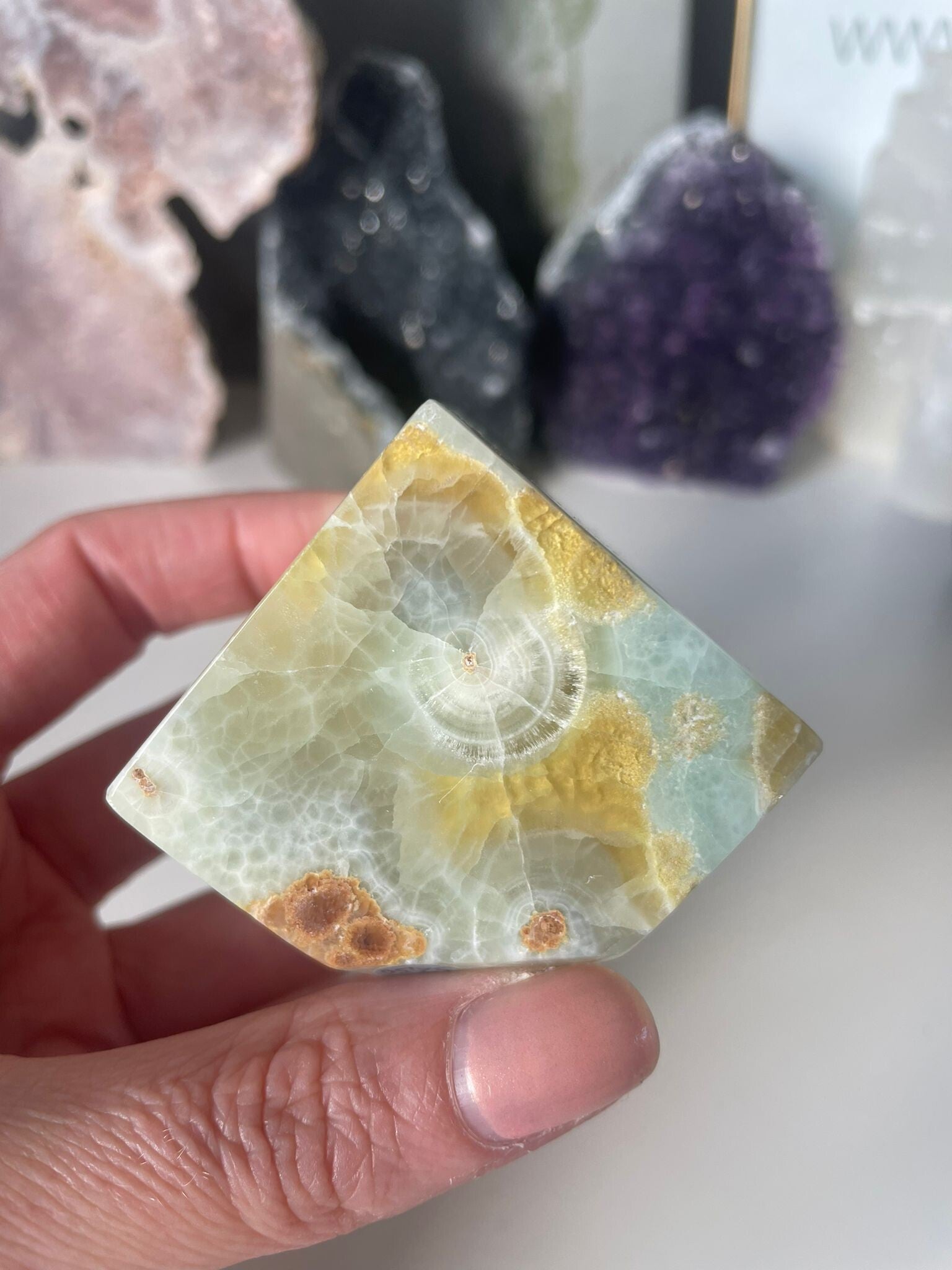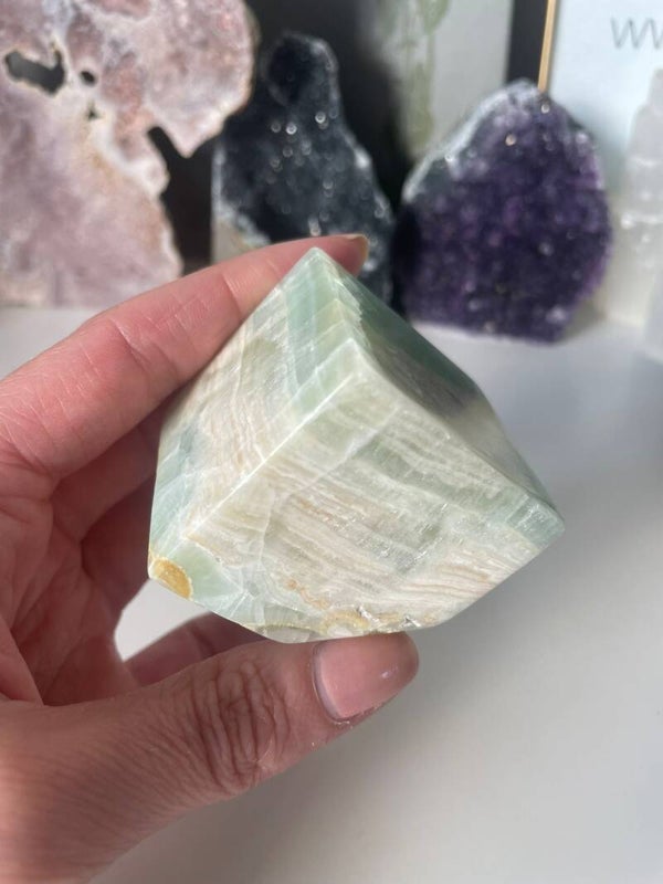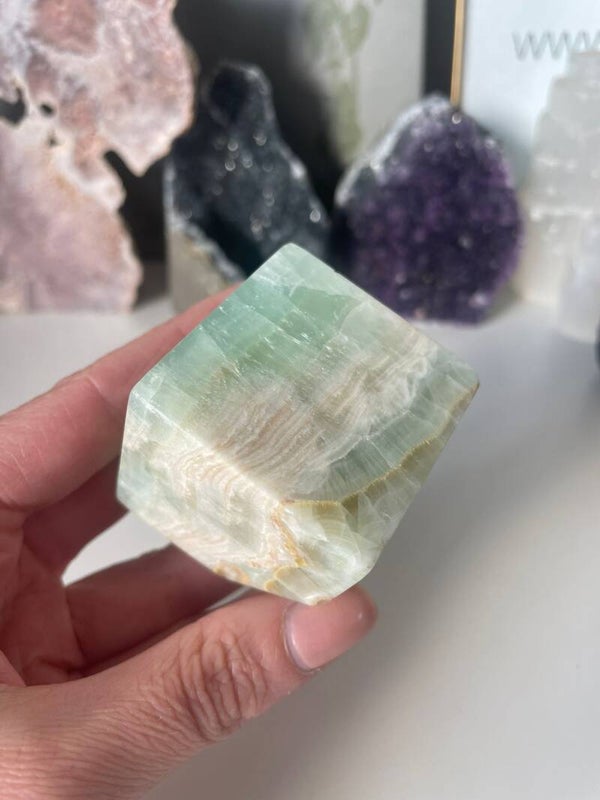 De steen voelt licht en verfrissend aan en staat bekend om haar zachte, positieve energie. Ze wordt vaak gebruikt om ruimtes op te fleuren of als een steen om even bij op adem te komen. Voor wie van natuurlijke tinten houdt, is deze calciet een kleine eyecatcher in huis of op je bureau.