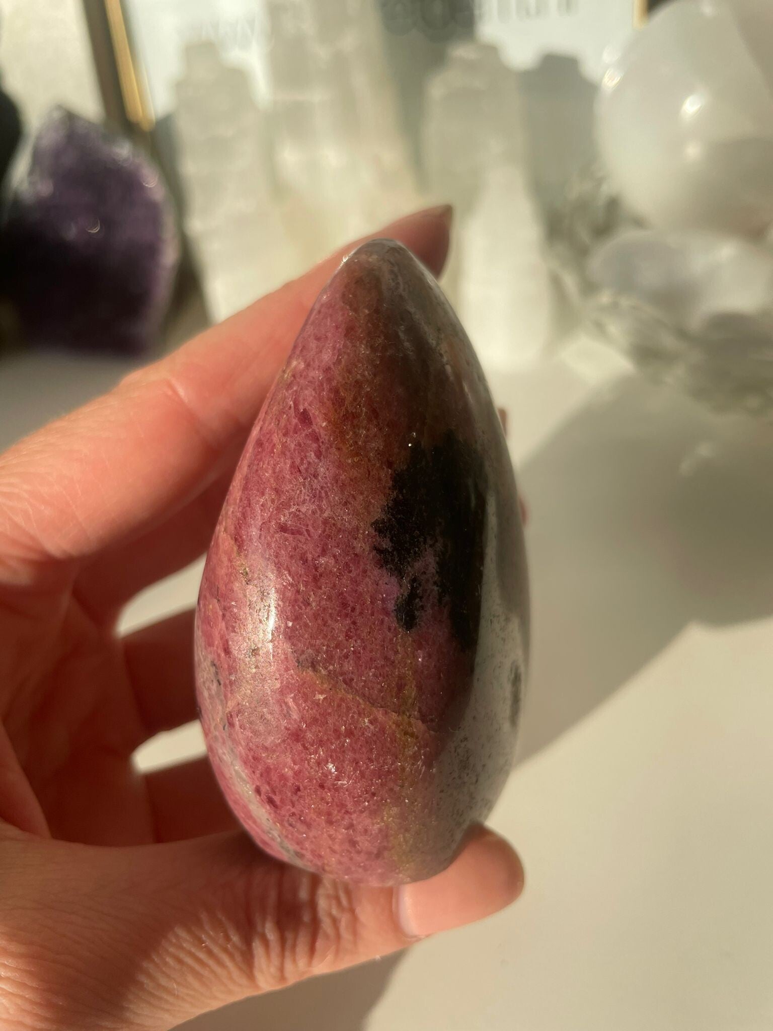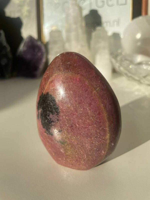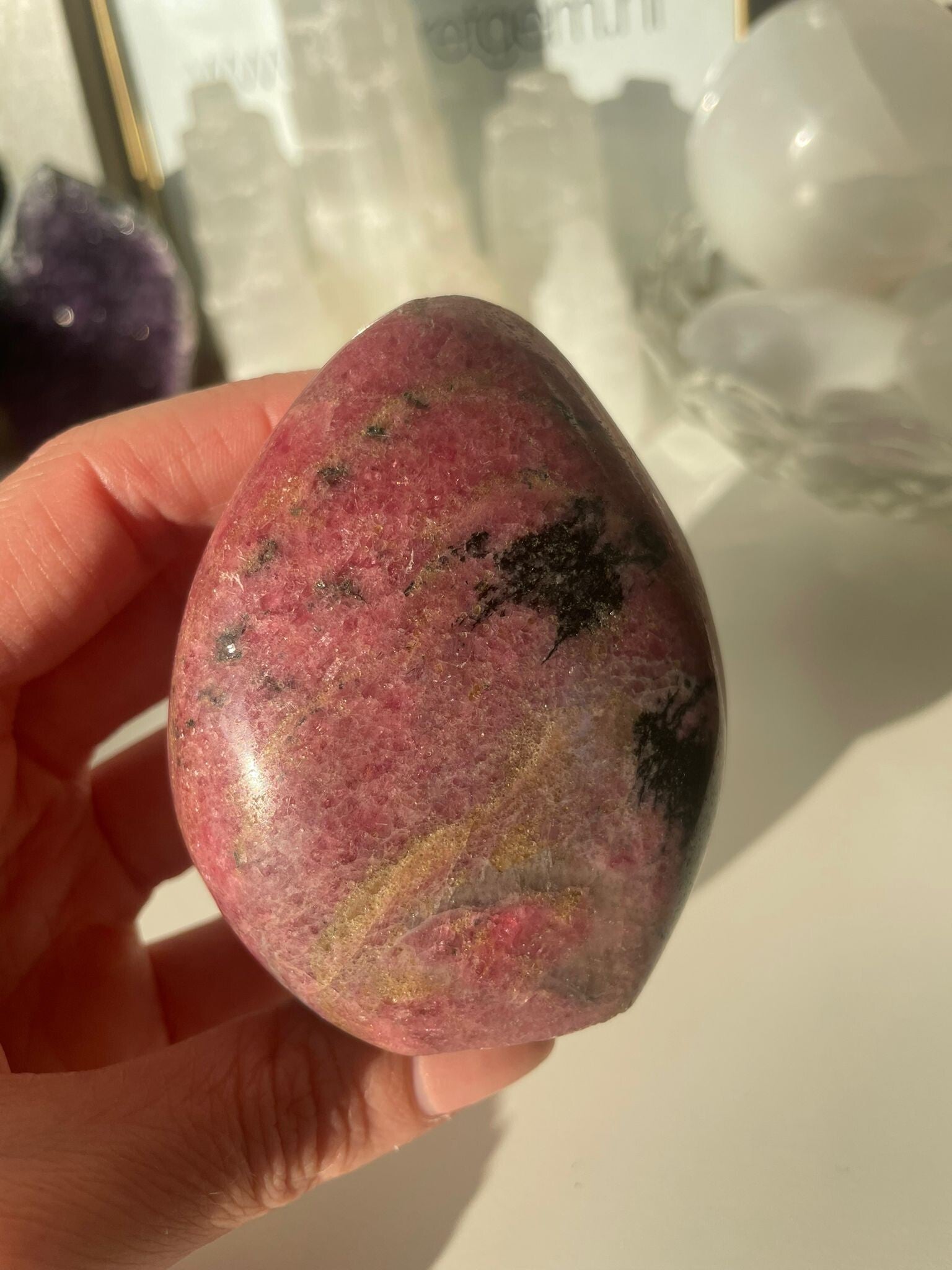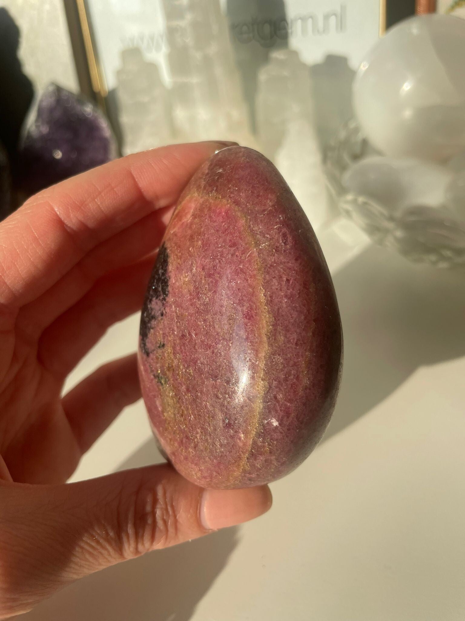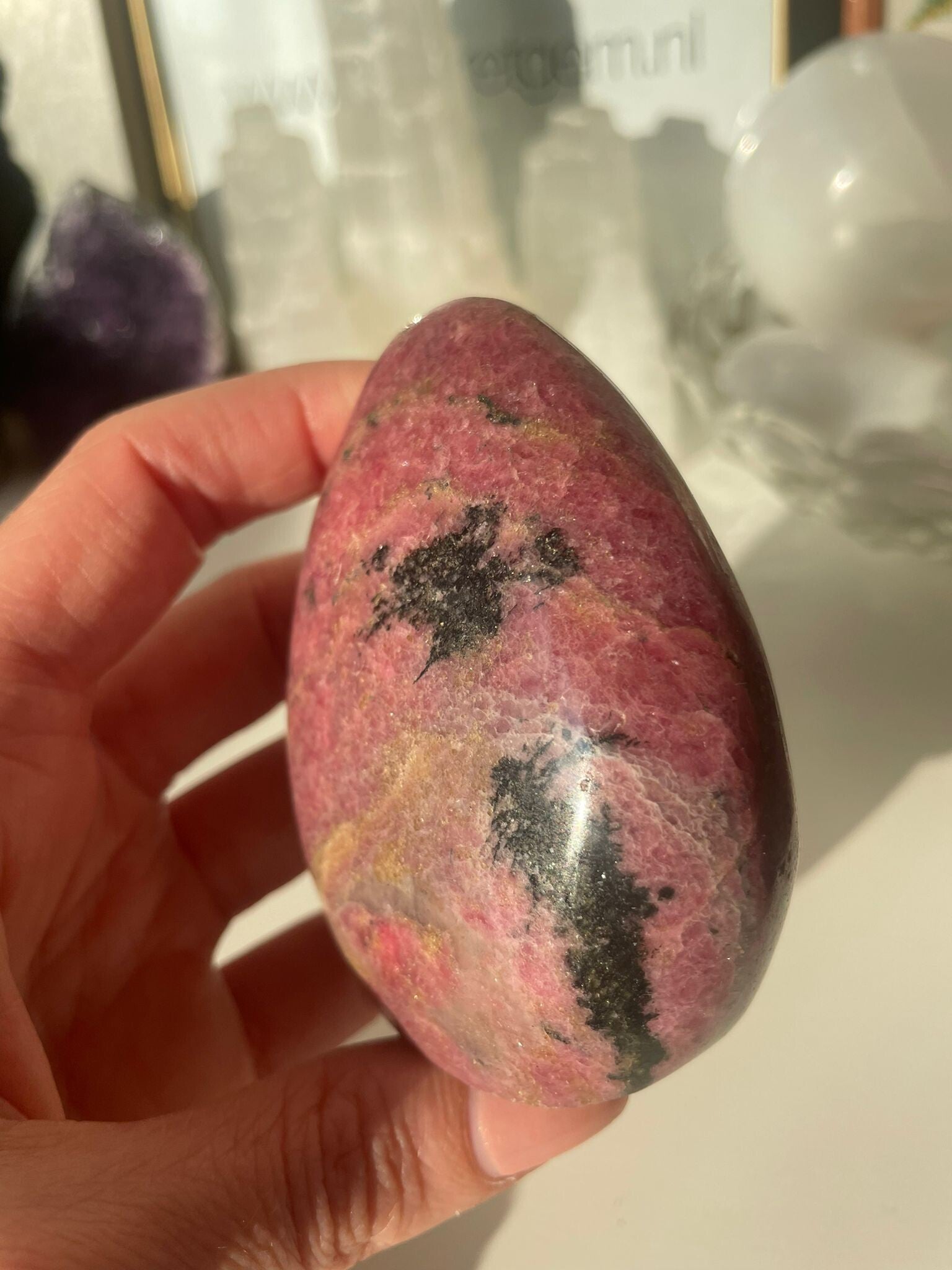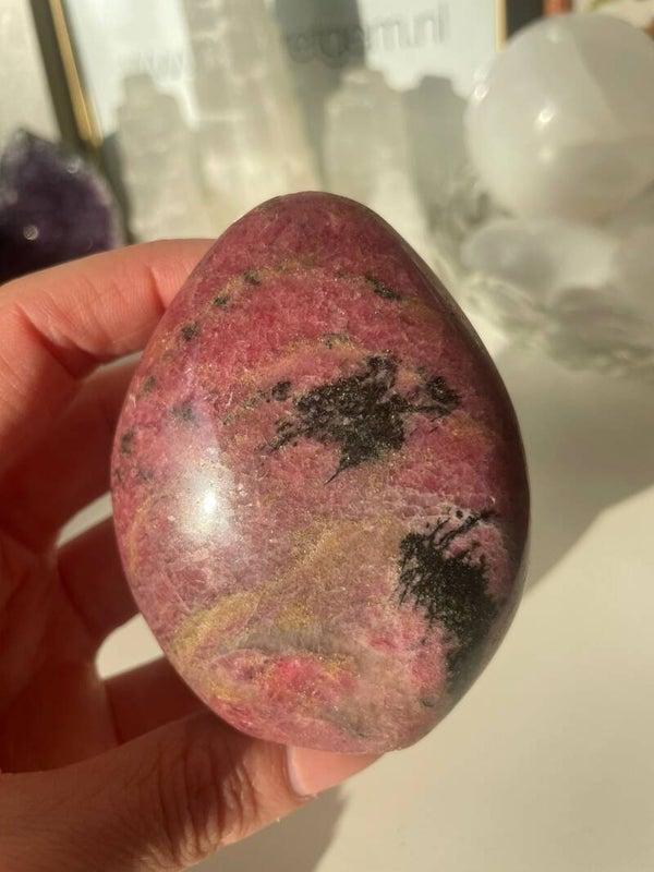 Leuk weetje: De zwarte aders in Rhodoniet zijn vaak mangaanhoudende mineralen. Het contrast tussen het roze en zwart maakt dat iedere steen echt een uniek kunstwerkje is van de natuur.