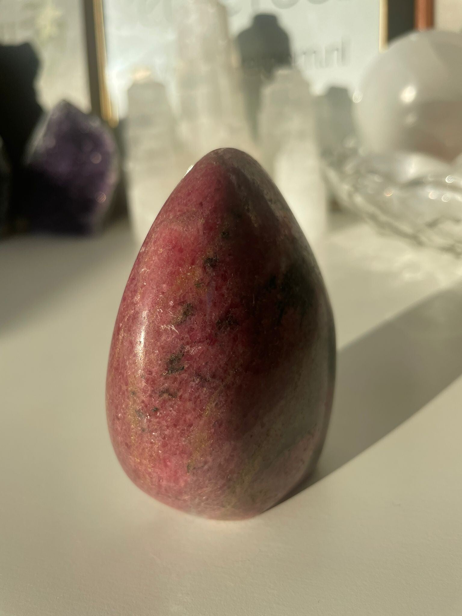 Rhodoniet is een opvallende steen met zachte tot felroze tinten, vaak dooraderd met zwarte sporen die elke steen een uniek patroon geven. Zijn naam is afgeleid van het Griekse rhodon, wat ‘roos’ betekent — een passende verwijzing naar de mooie rozetinten in de steen.
