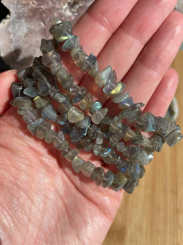 Labradoriet is een mysterieuze en betoverende steen die direct opvalt door zijn bijzondere iriserende kleuren, ook wel labradorescentie genoemd. Afhankelijk van de lichtinval kan de steen schitteren in tinten blauw, groen, goud en soms zelfs paars of oranje. Het is alsof een klein stukje noorderlicht in de steen gevangen zit.