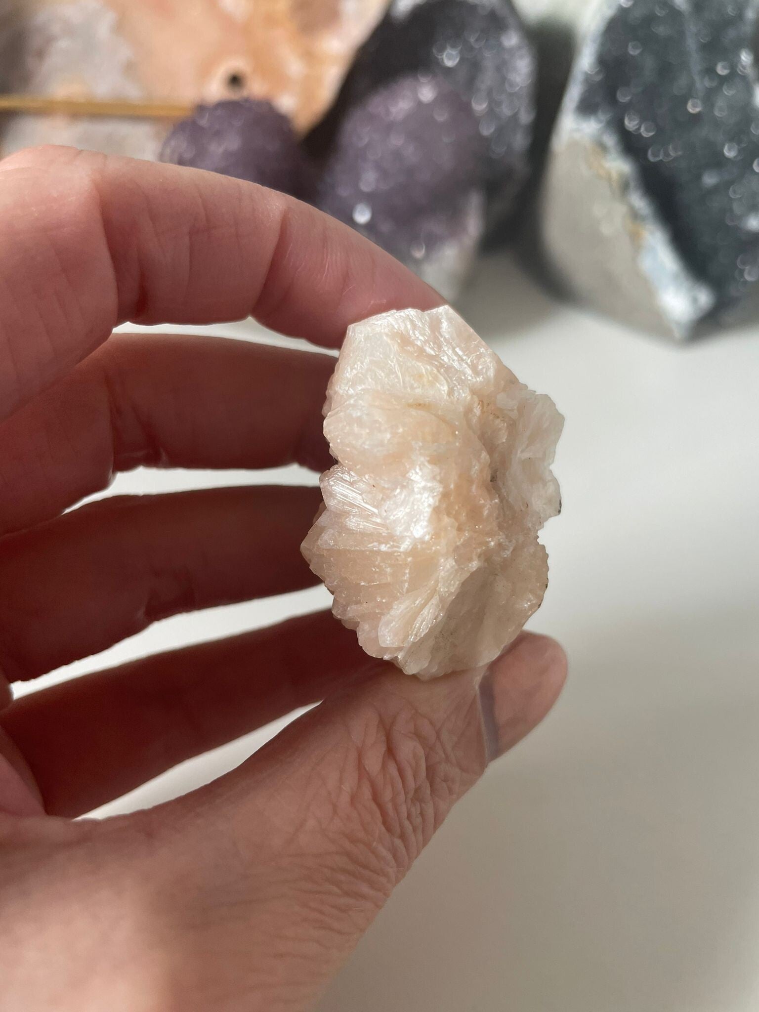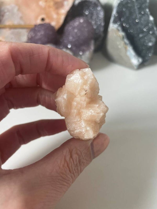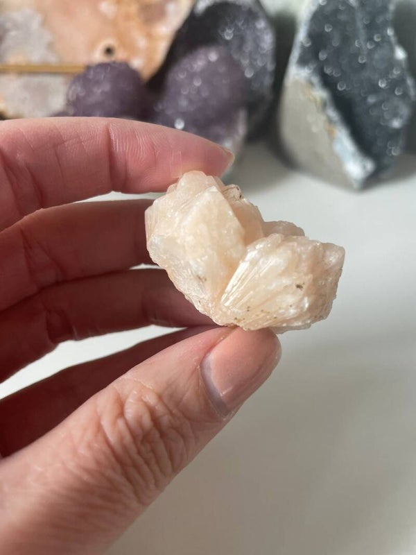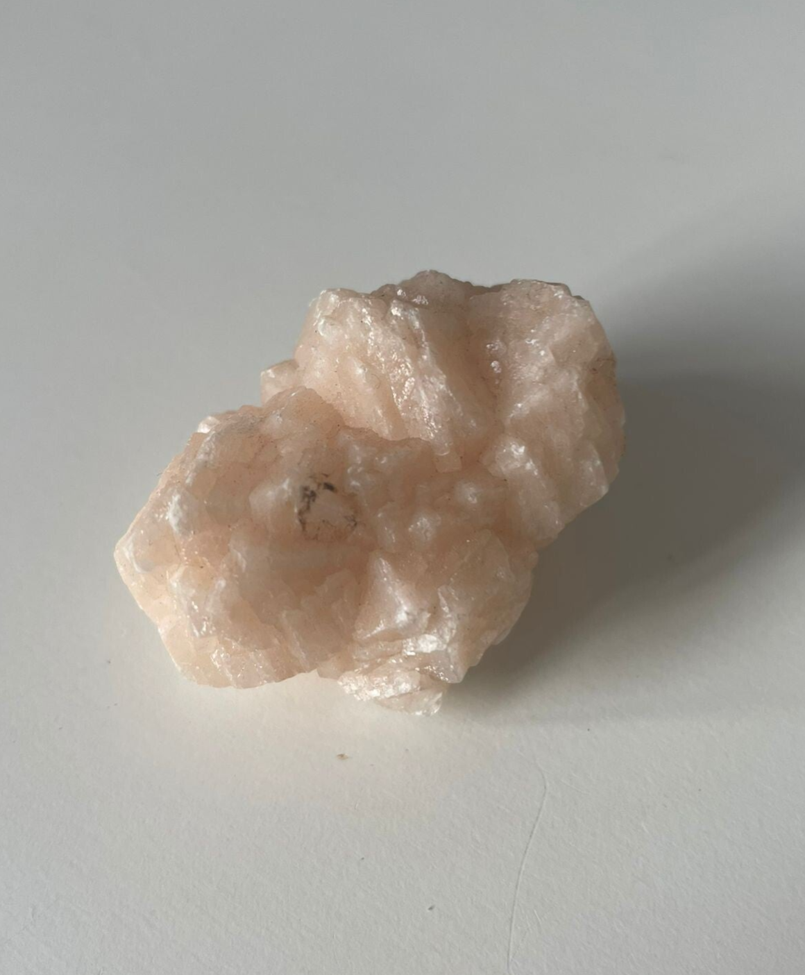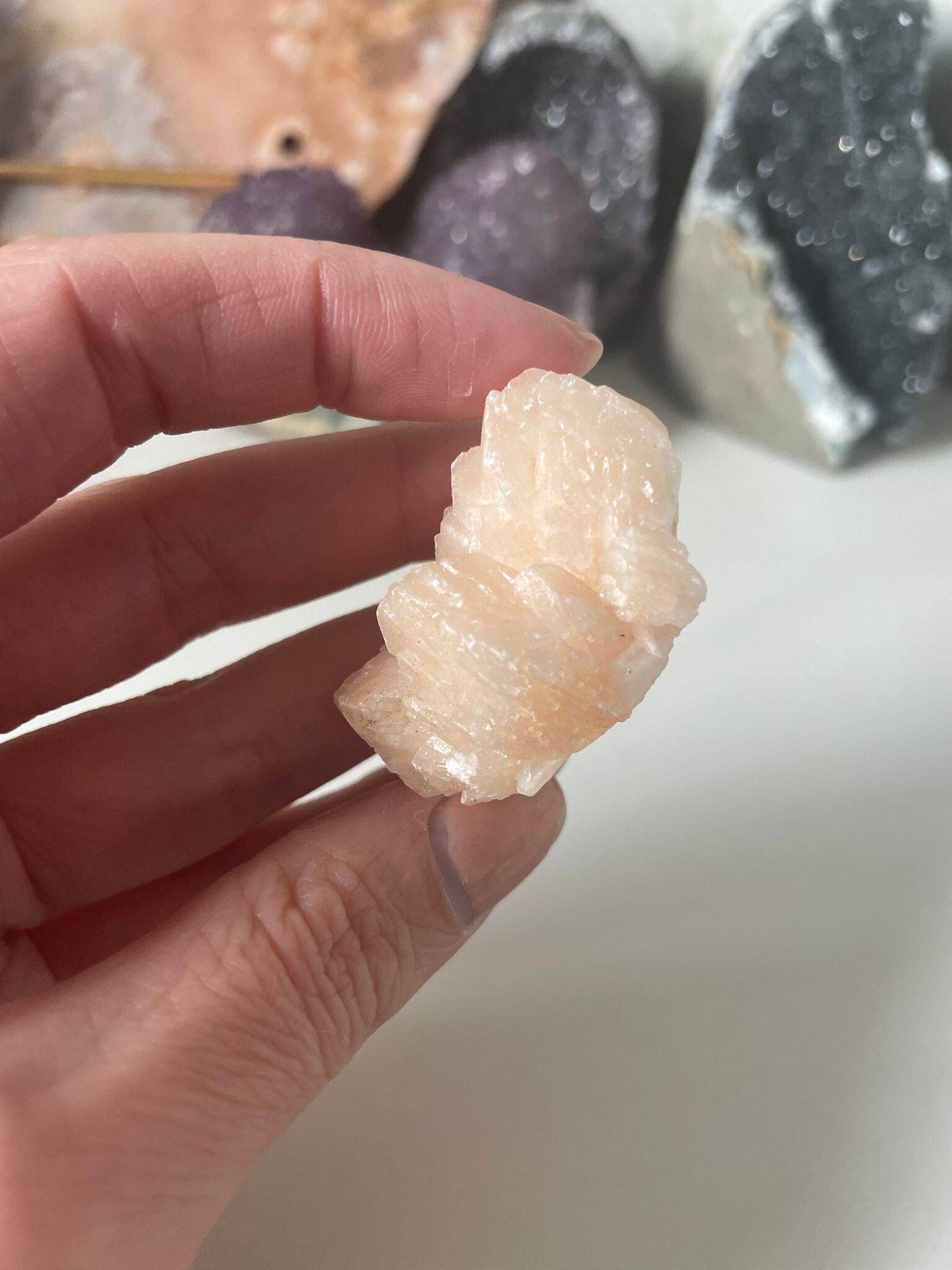 Stilbiet is een liefdevol en fluweelzacht mineraal dat meestal voorkomt in waaiervormige kristallen of ronde bloesemachtige groepjes. De kleuren variëren van perzik en crème tot wit of zachtgeel, altijd met een vriendelijke, rustgevende uitstraling. Stilbiet hoort bij de zeolietenfamilie, en groeit vaak samen met apofyliet, heulandiet en andere lichtenergetische mineralen.