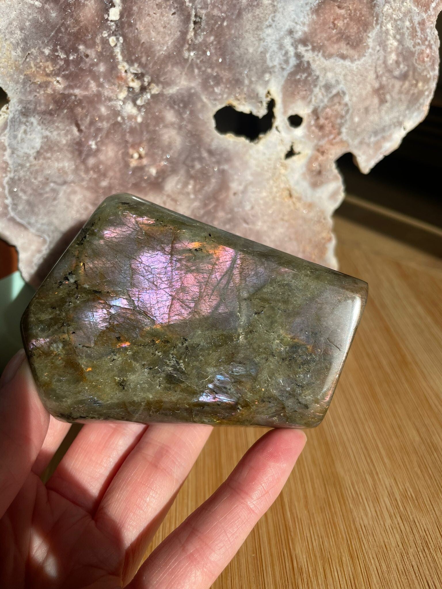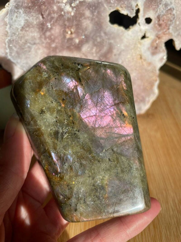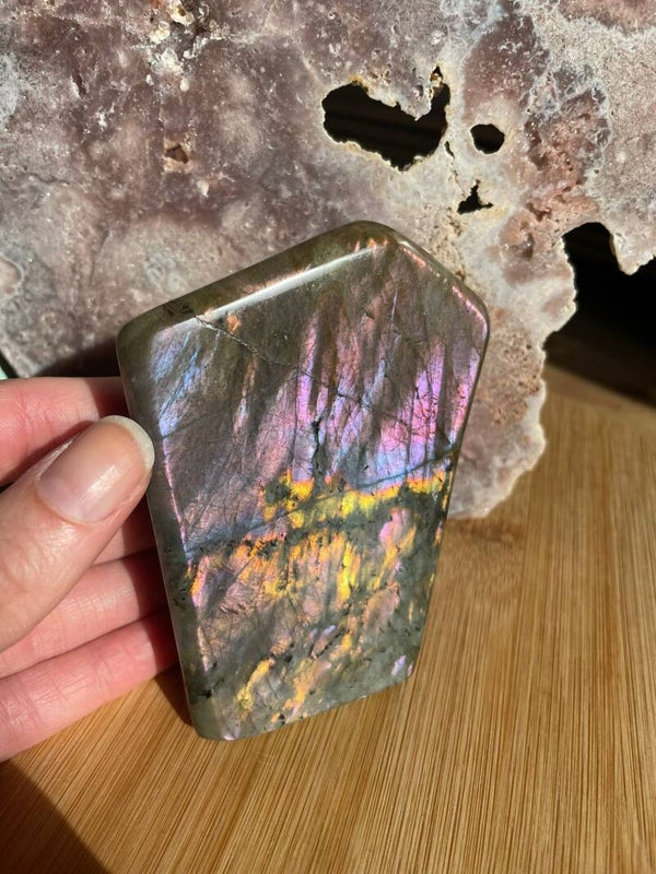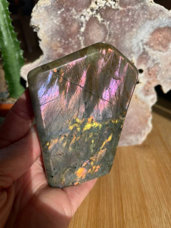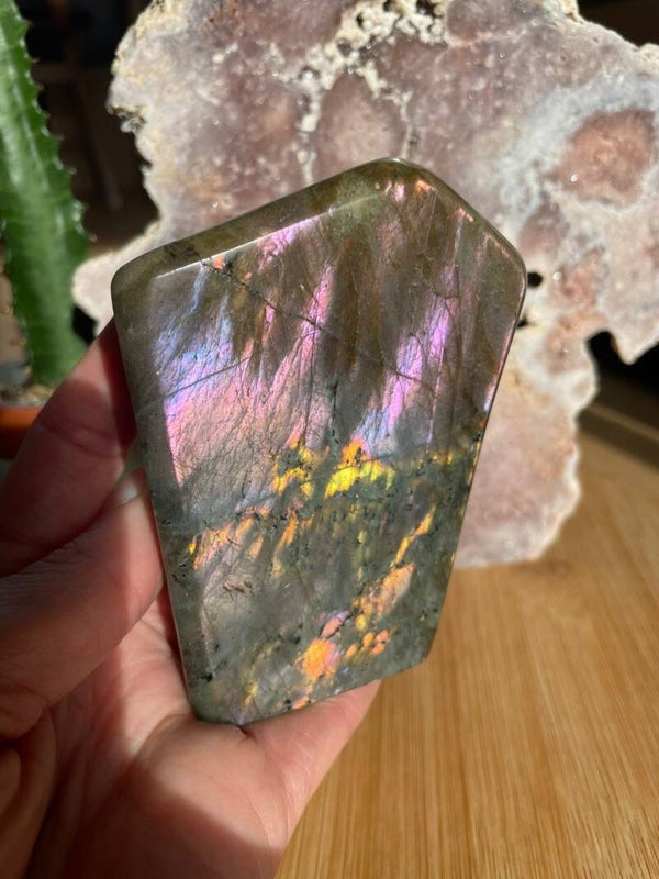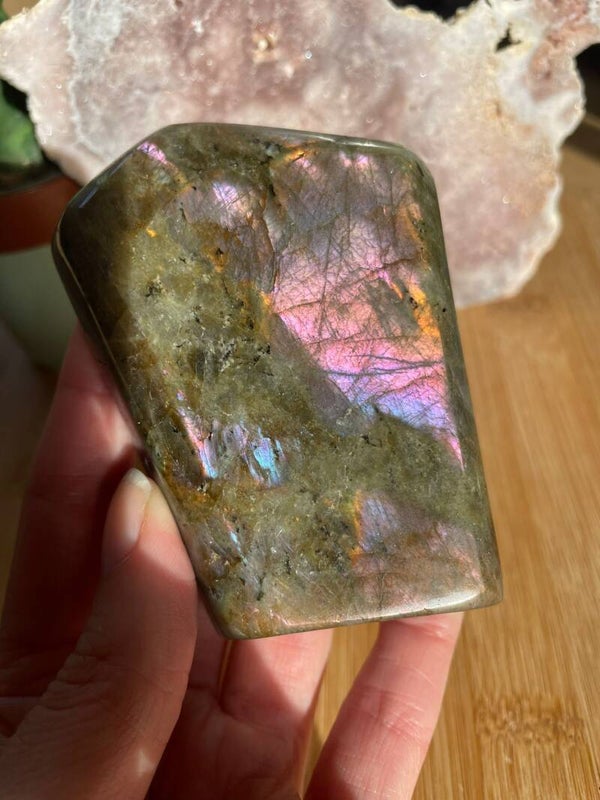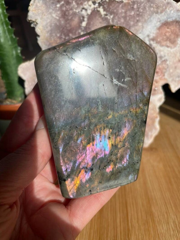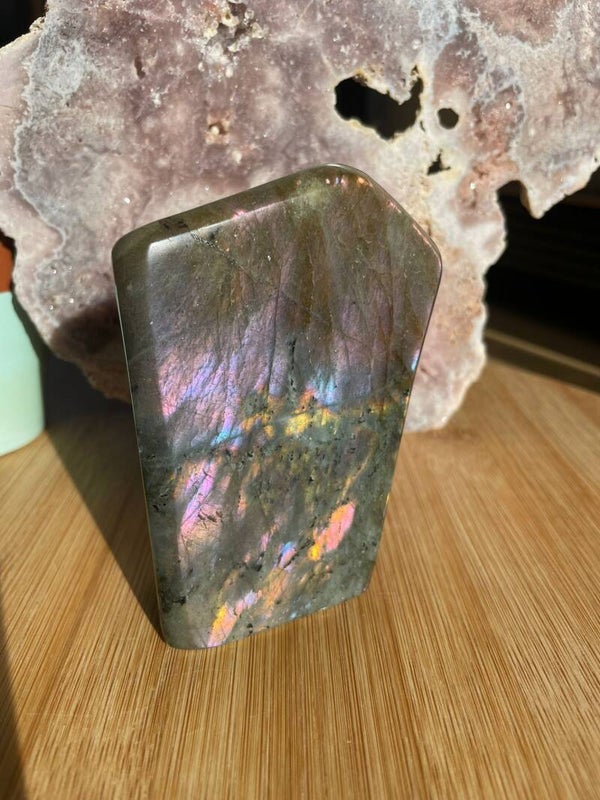 Leuk weetje: In sommige culturen werd labradoriet gezien als ‘bevroren noorderlicht’. Men geloofde dat het licht van de aurora borealis in de steen gevangen zat, bij Paarse Labradoriet lijkt dat verhaal haast waar.