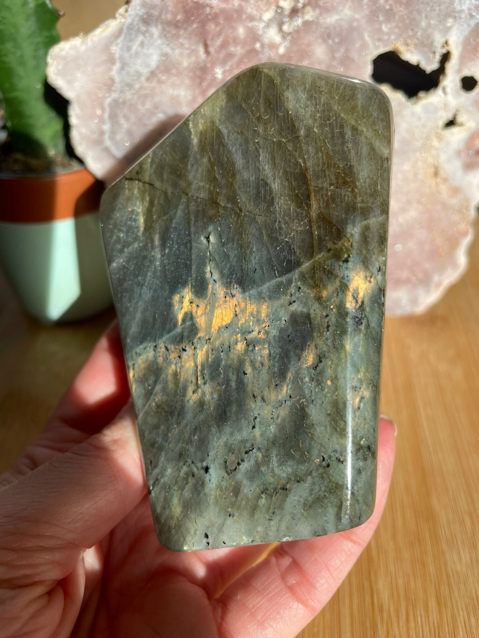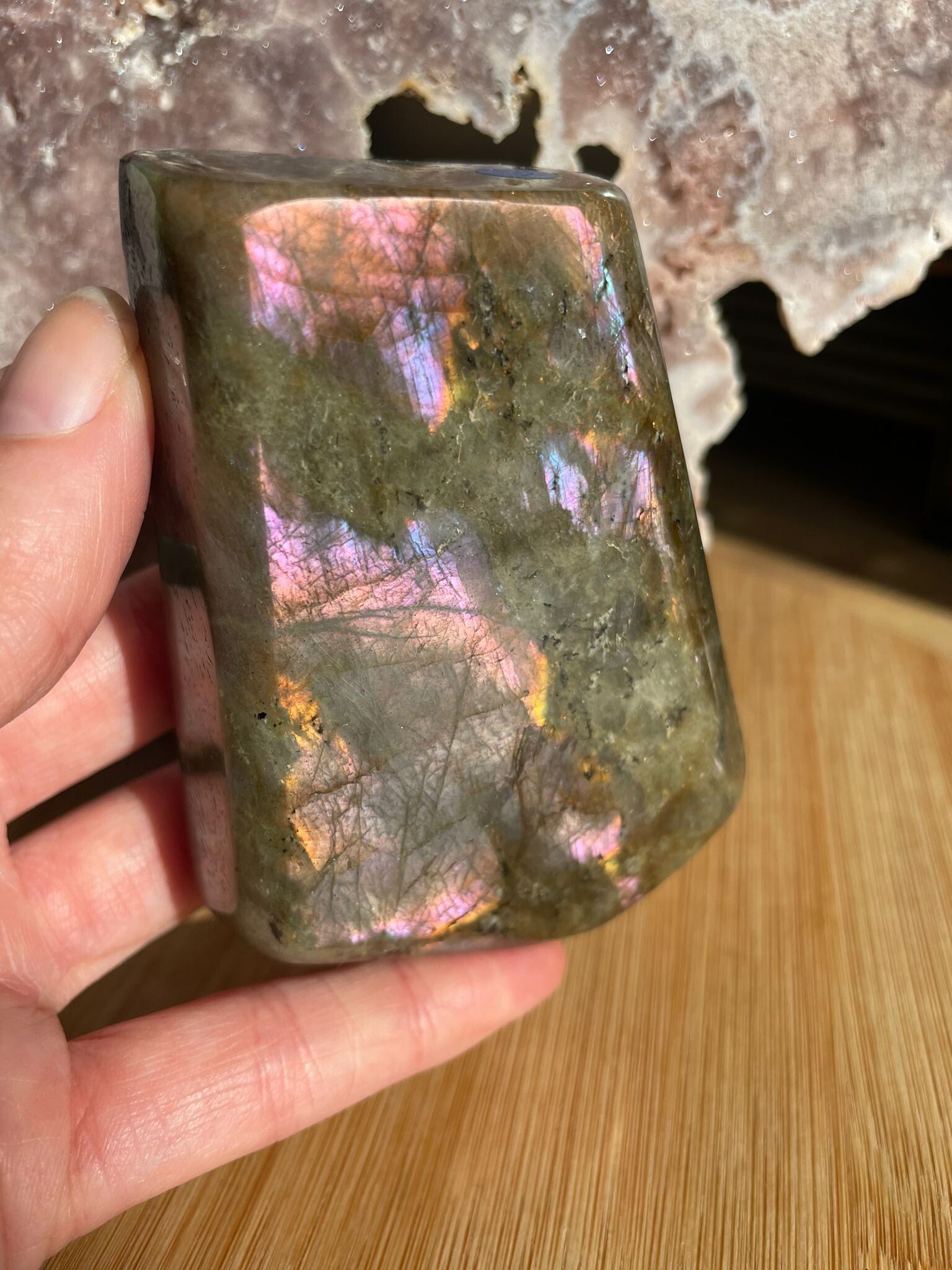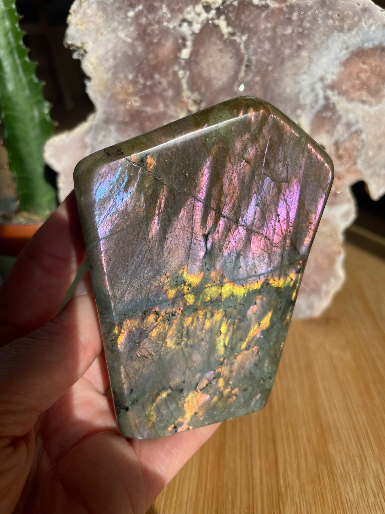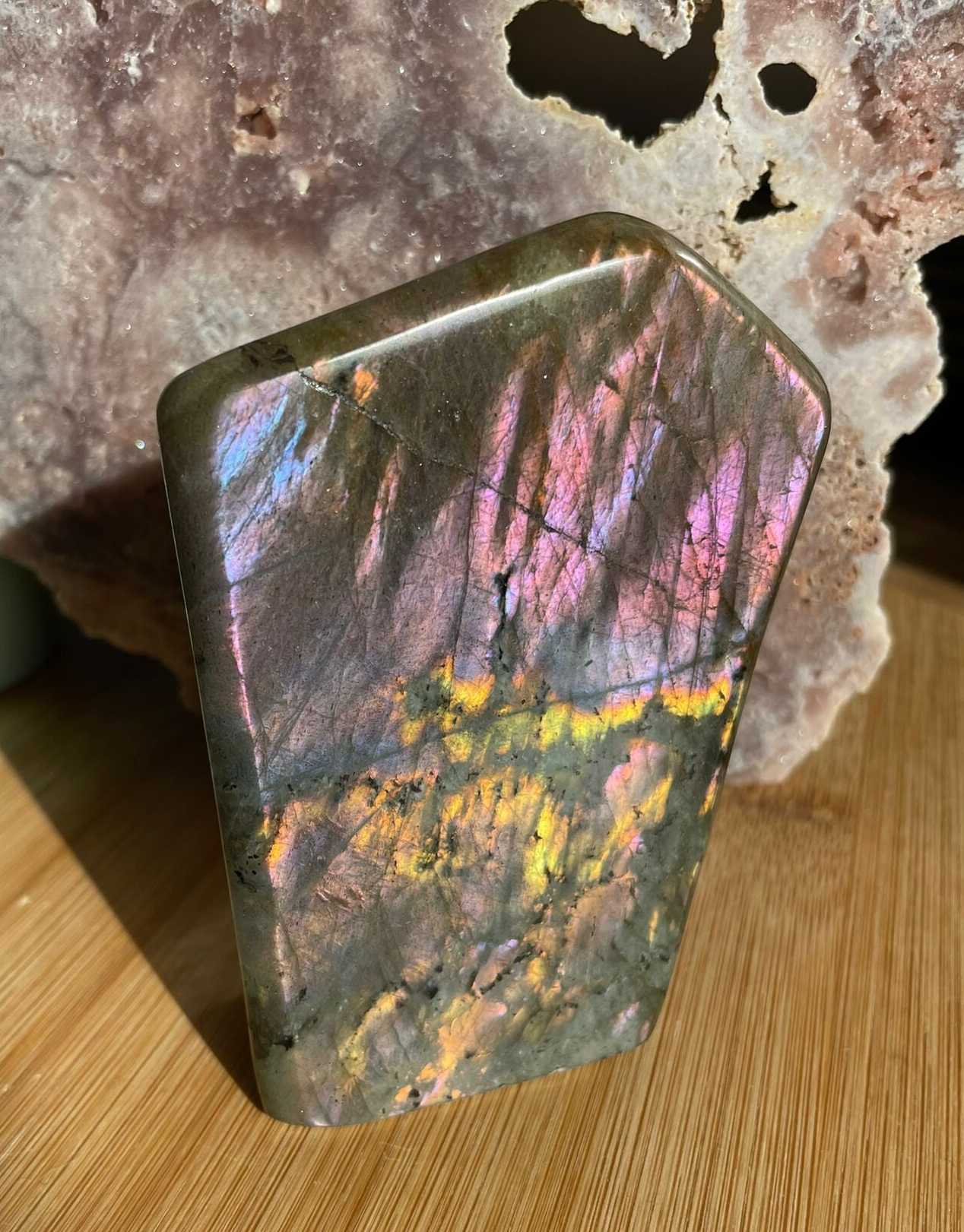 Leuk weetje: In sommige culturen werd labradoriet gezien als ‘bevroren noorderlicht’. Men geloofde dat het licht van de aurora borealis in de steen gevangen zat, bij Paarse Labradoriet lijkt dat verhaal haast waar.