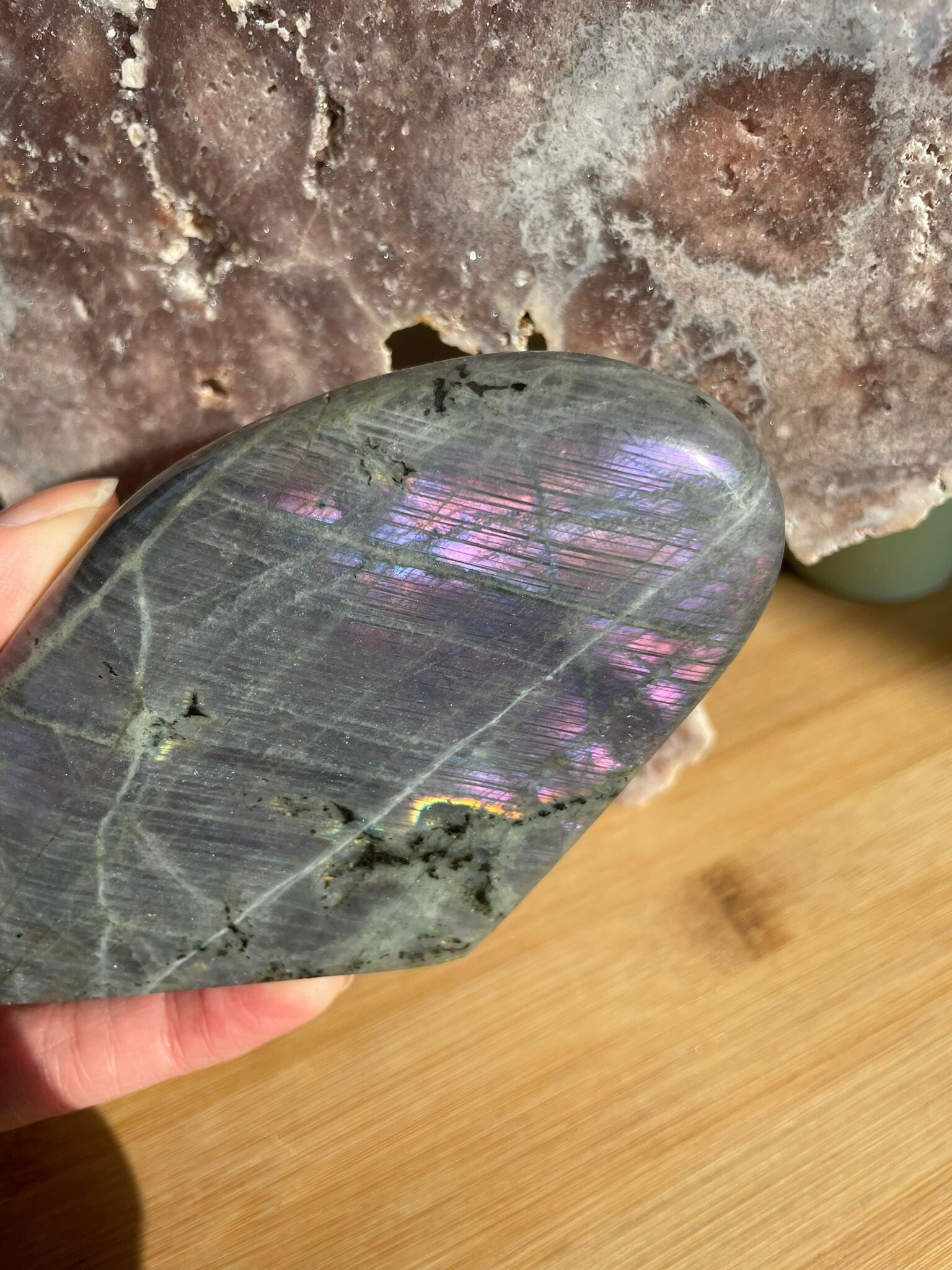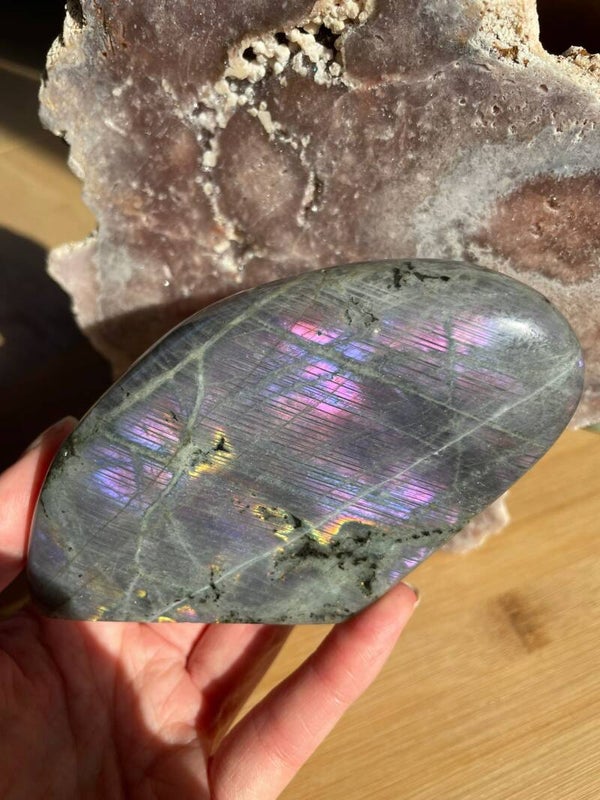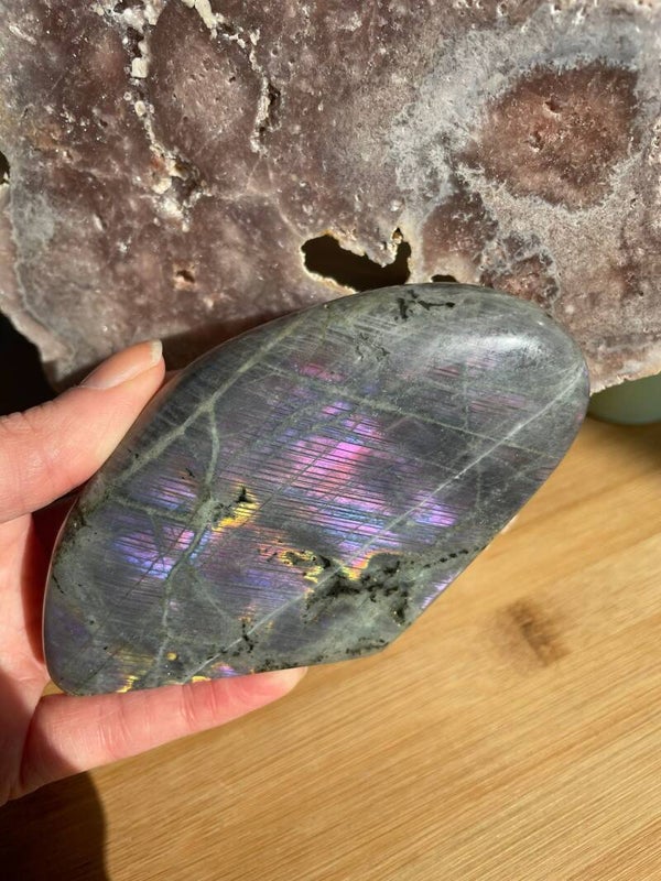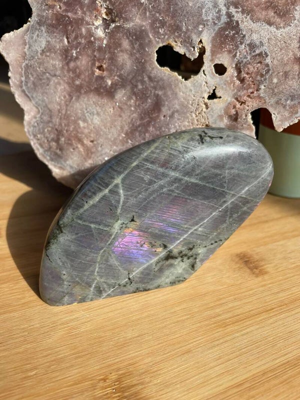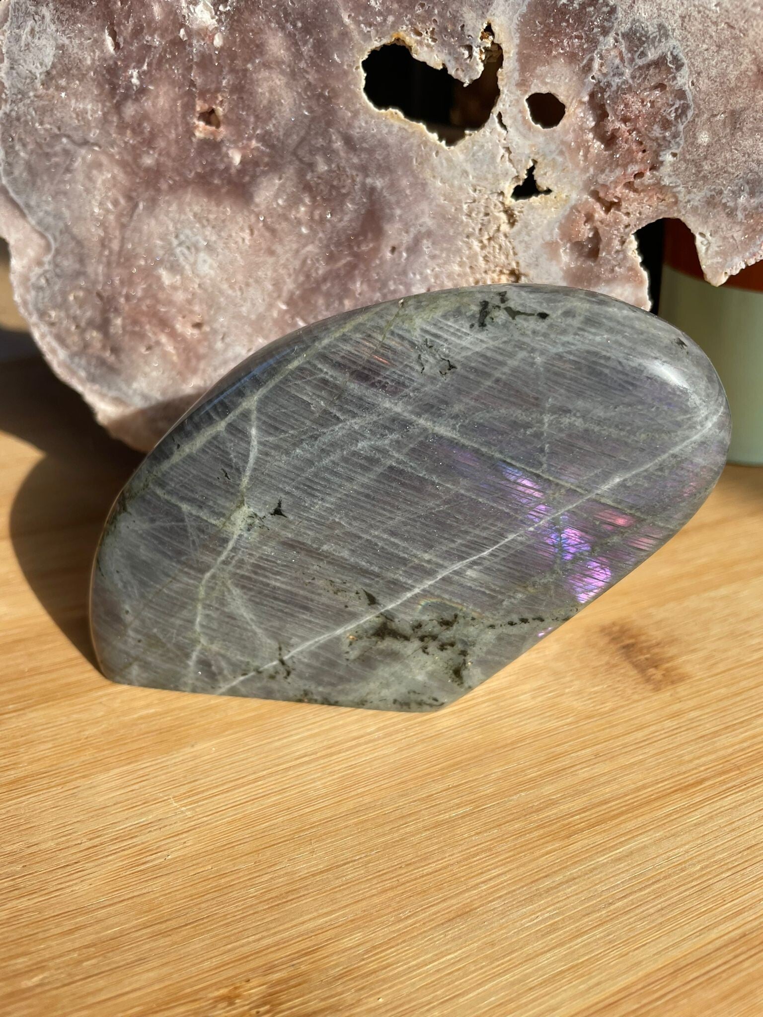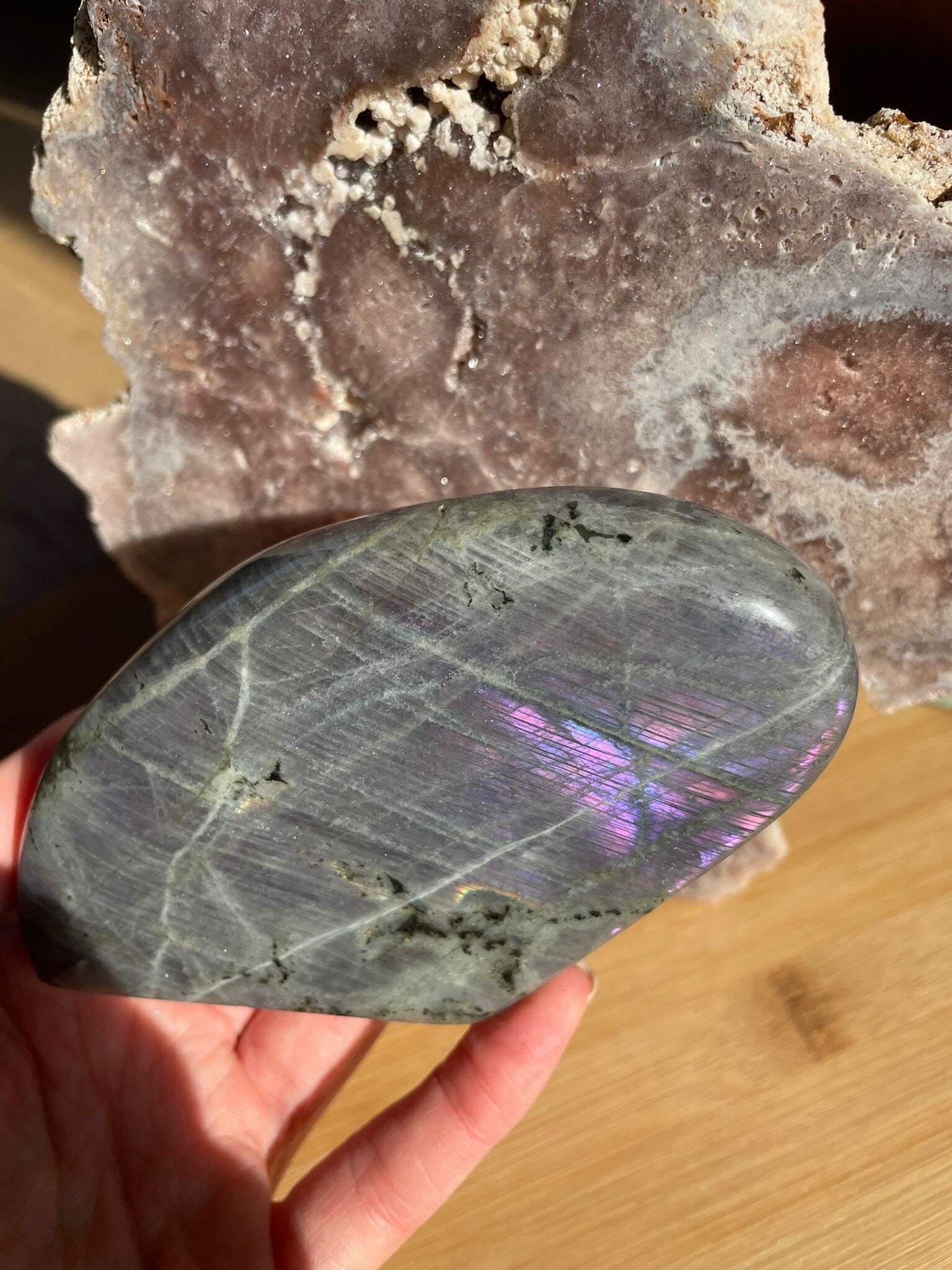 Leuk weetje: In sommige culturen werd labradoriet gezien als ‘bevroren noorderlicht’. Men geloofde dat het licht van de aurora borealis in de steen gevangen zat, bij Paarse Labradoriet lijkt dat verhaal haast waar.