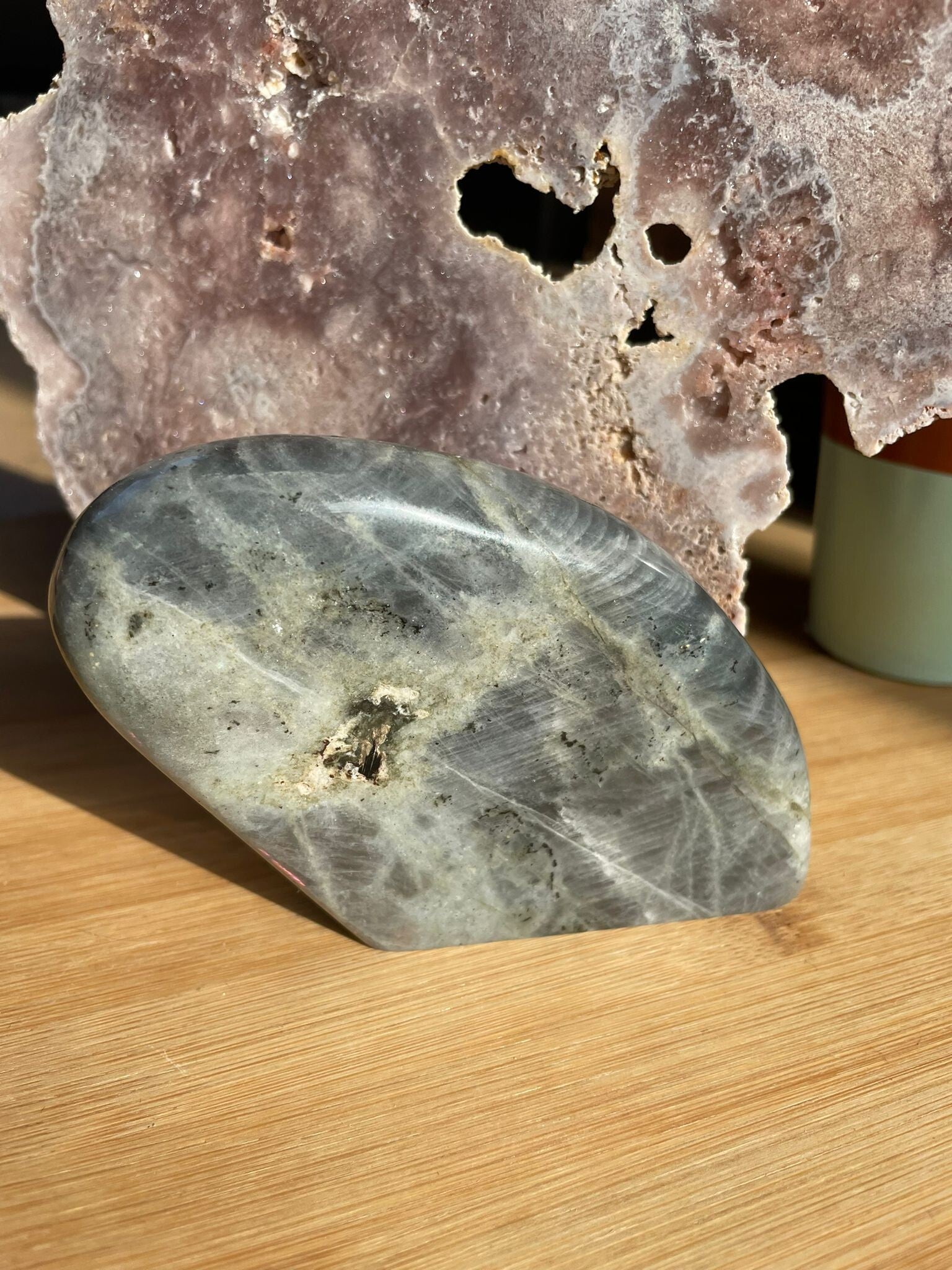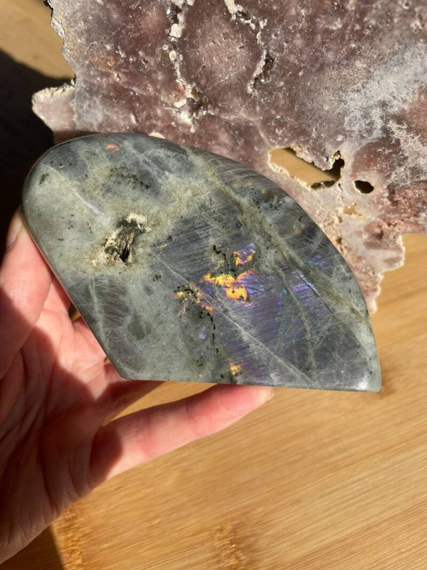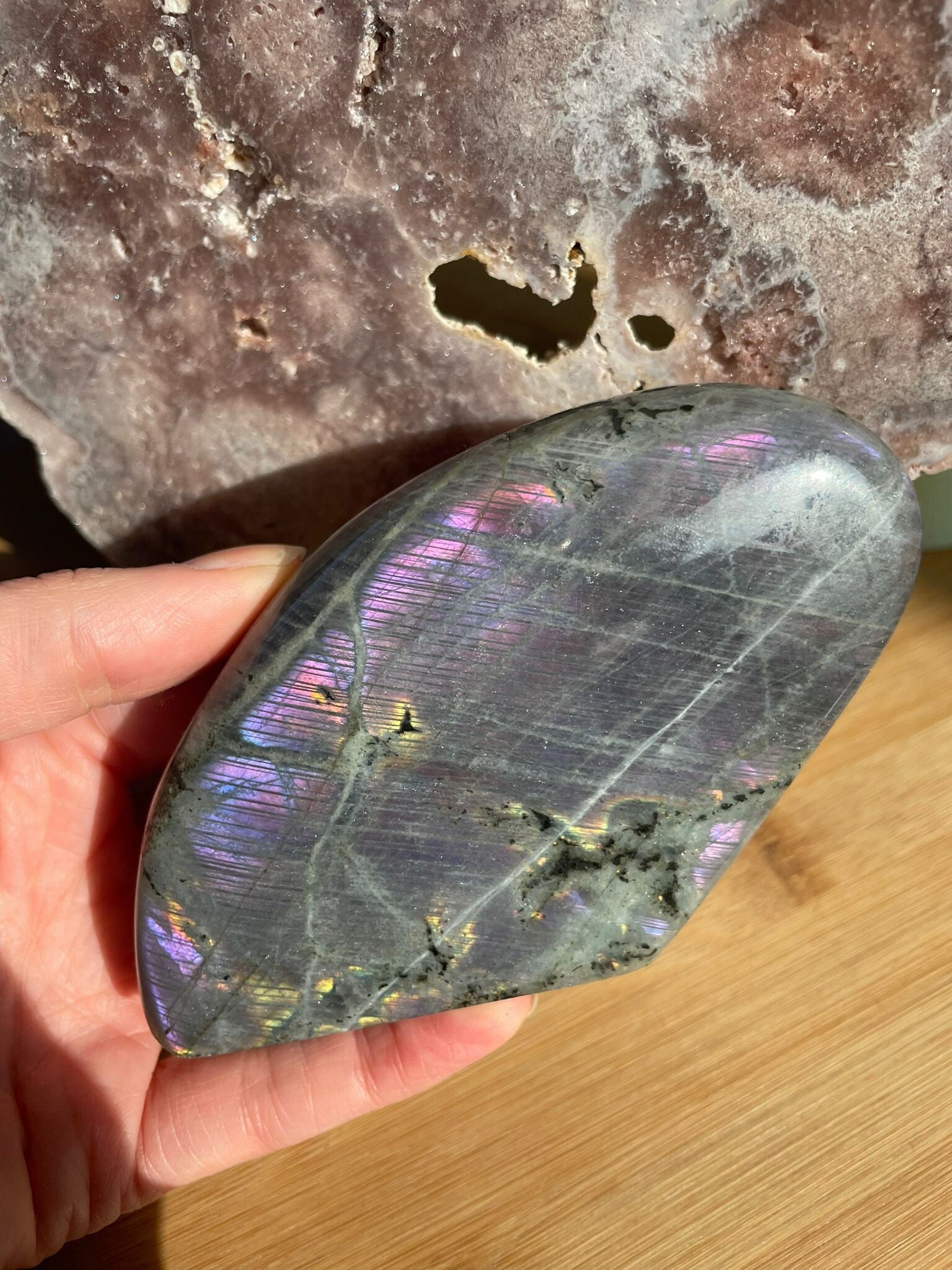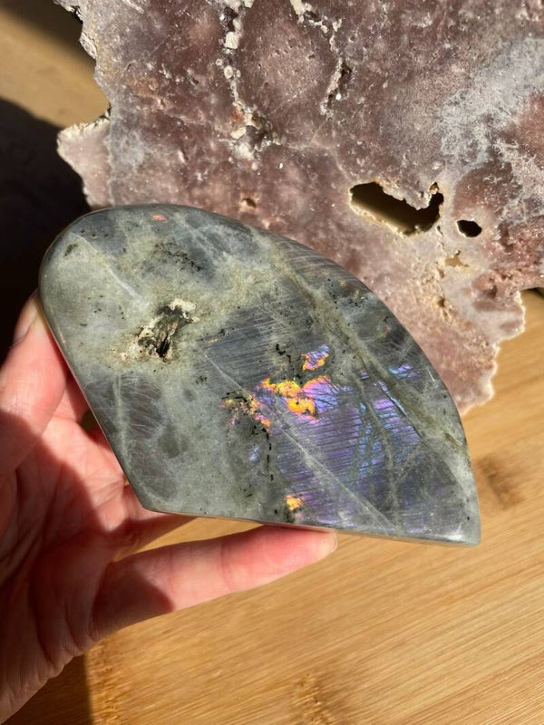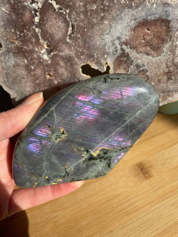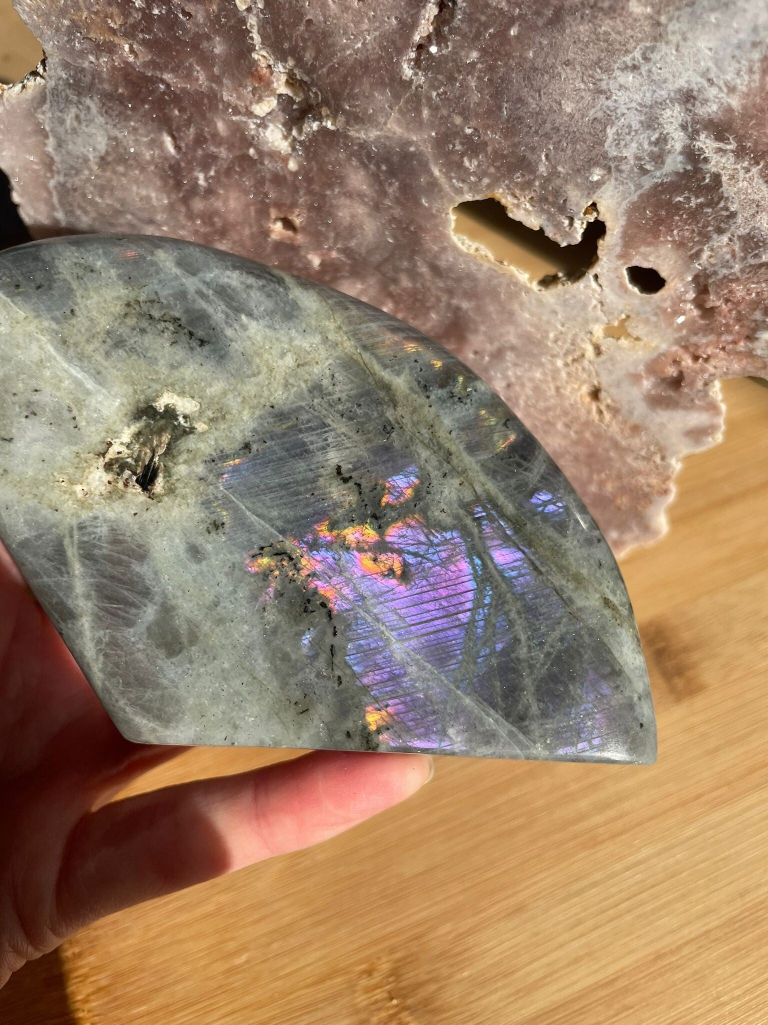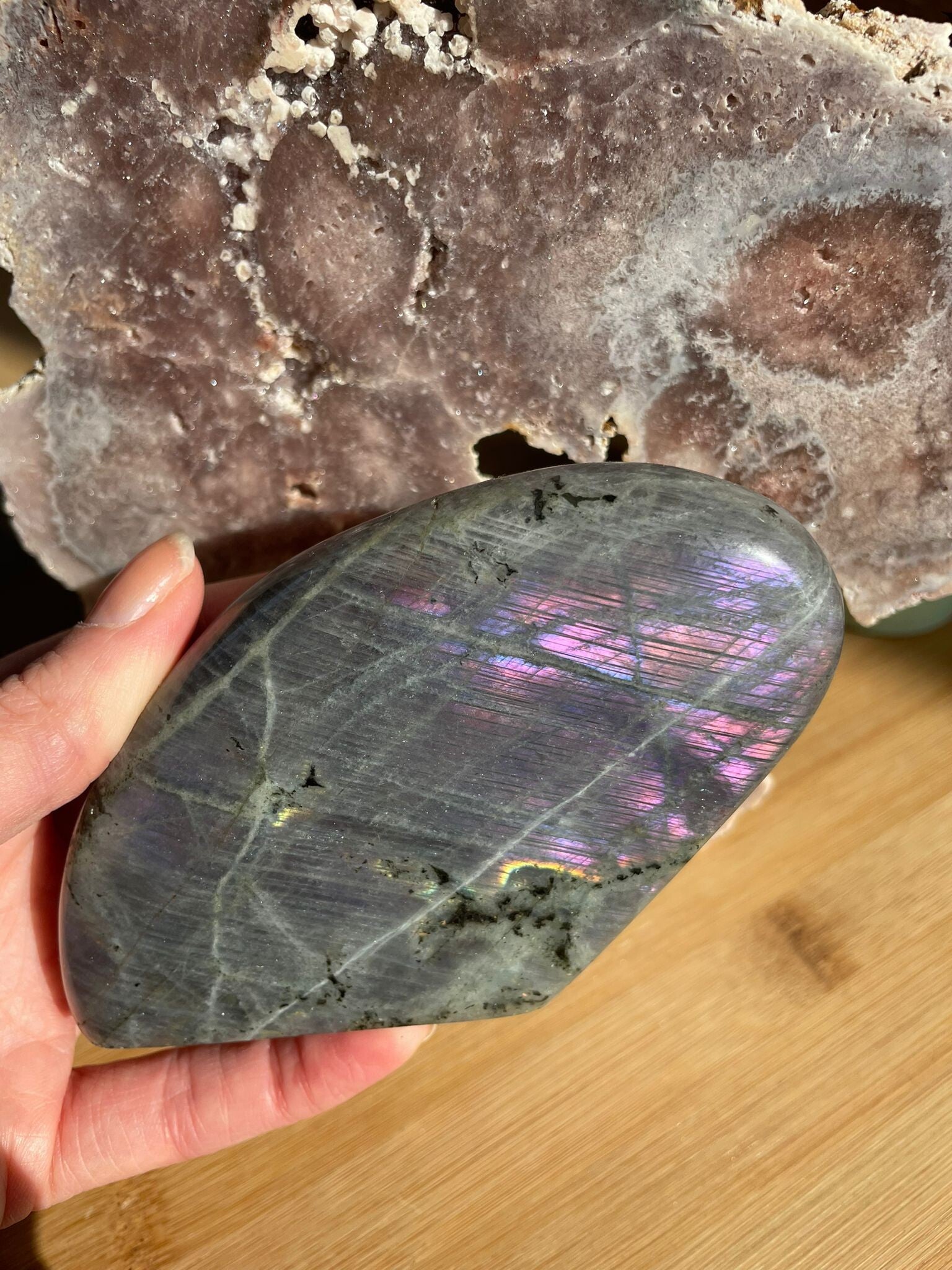 Leuk weetje: In sommige culturen werd labradoriet gezien als ‘bevroren noorderlicht’. Men geloofde dat het licht van de aurora borealis in de steen gevangen zat, bij Paarse Labradoriet lijkt dat verhaal haast waar.
