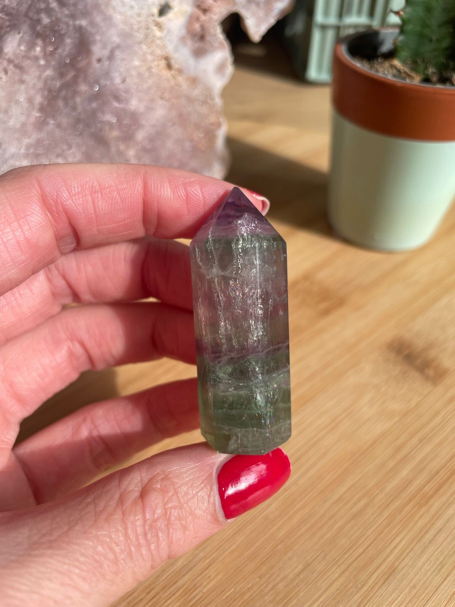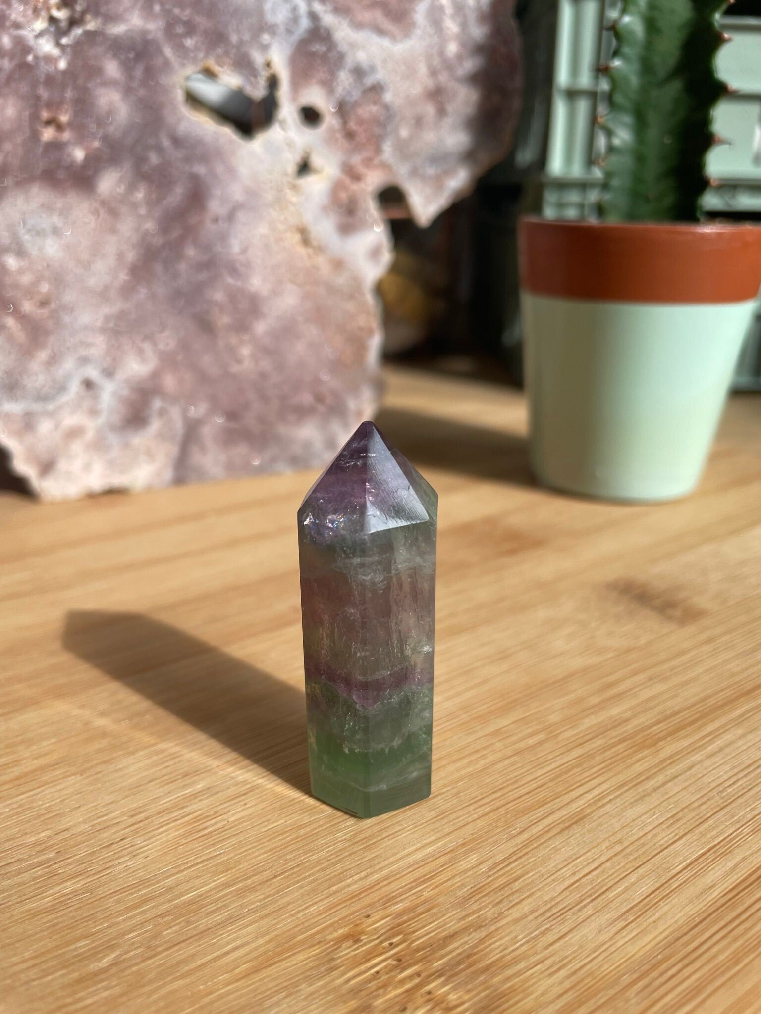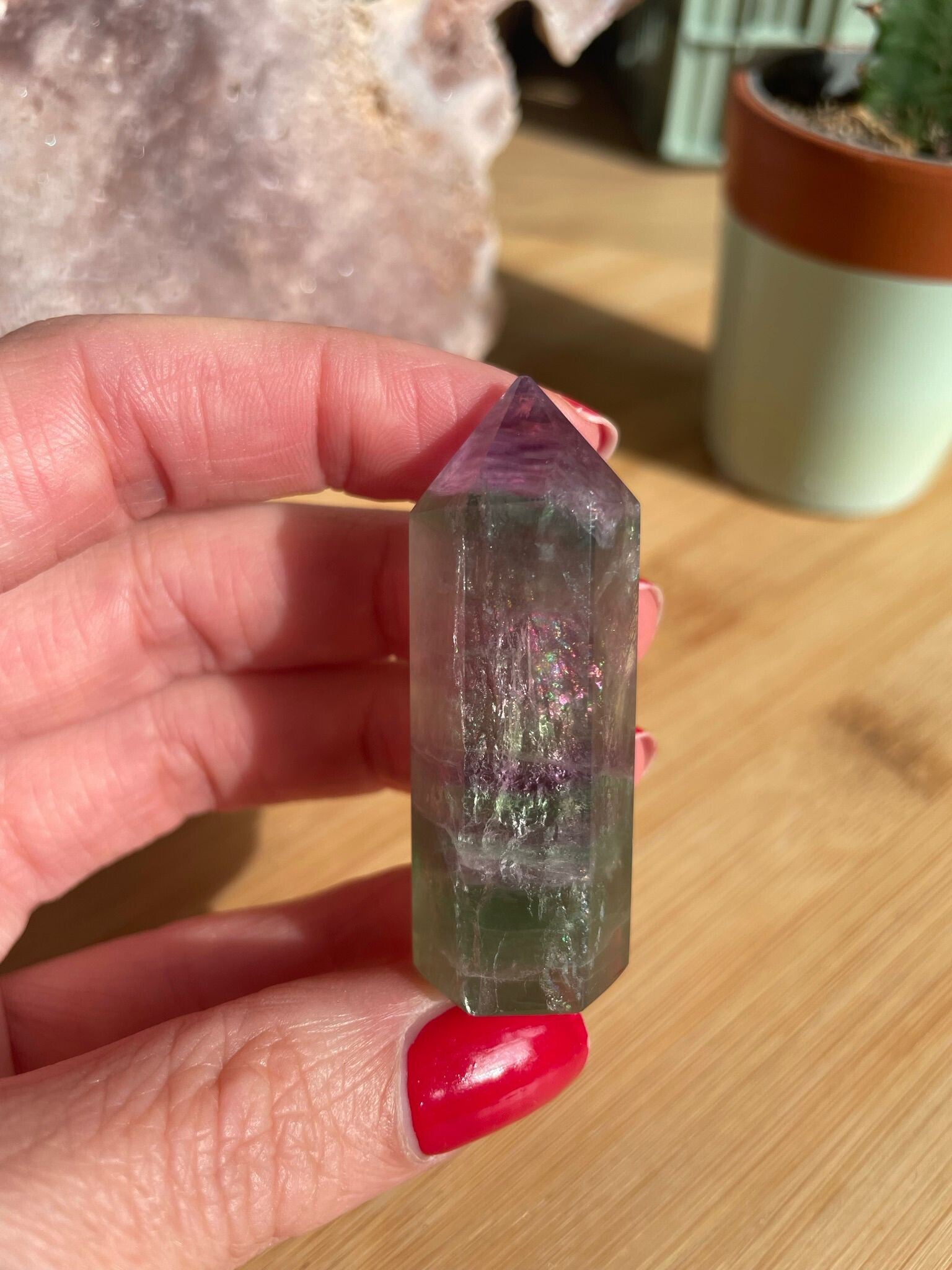 Regenboogfluoriet doet zijn naam eer aan: deze steen laat vaak prachtige lagen zien in paars, groen, blauw en soms zelfs geel. Elke laag is een nieuw stukje natuurkunst, waardoor geen twee stukken ooit hetzelfde zijn.