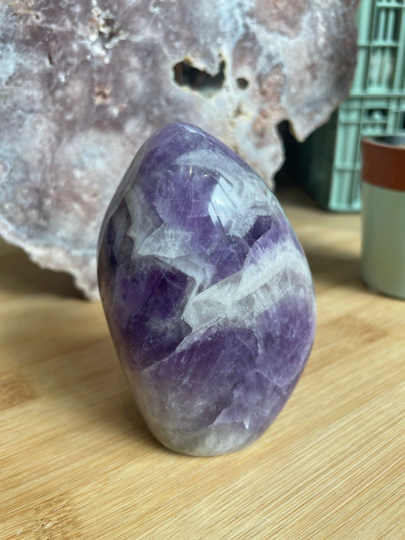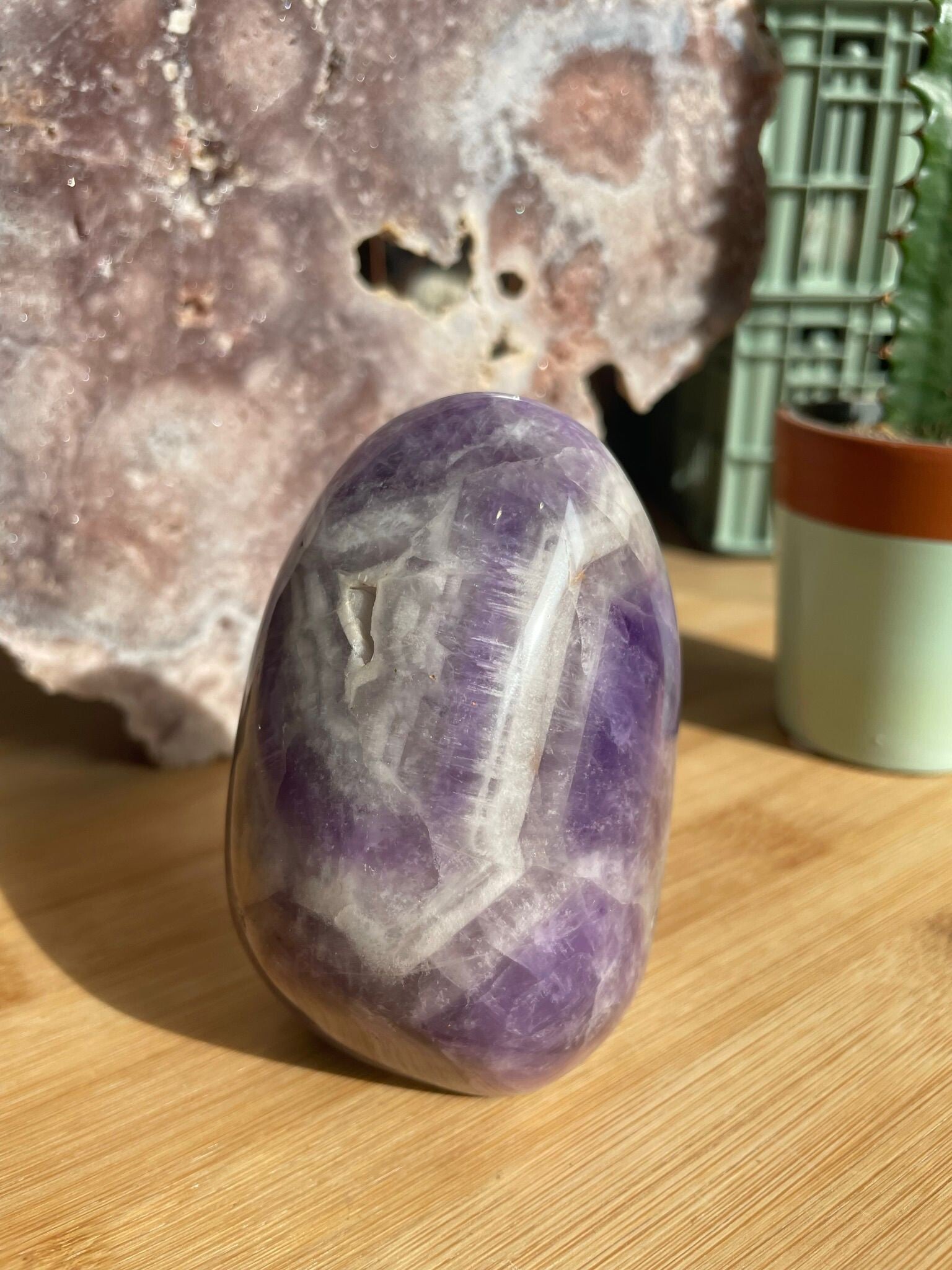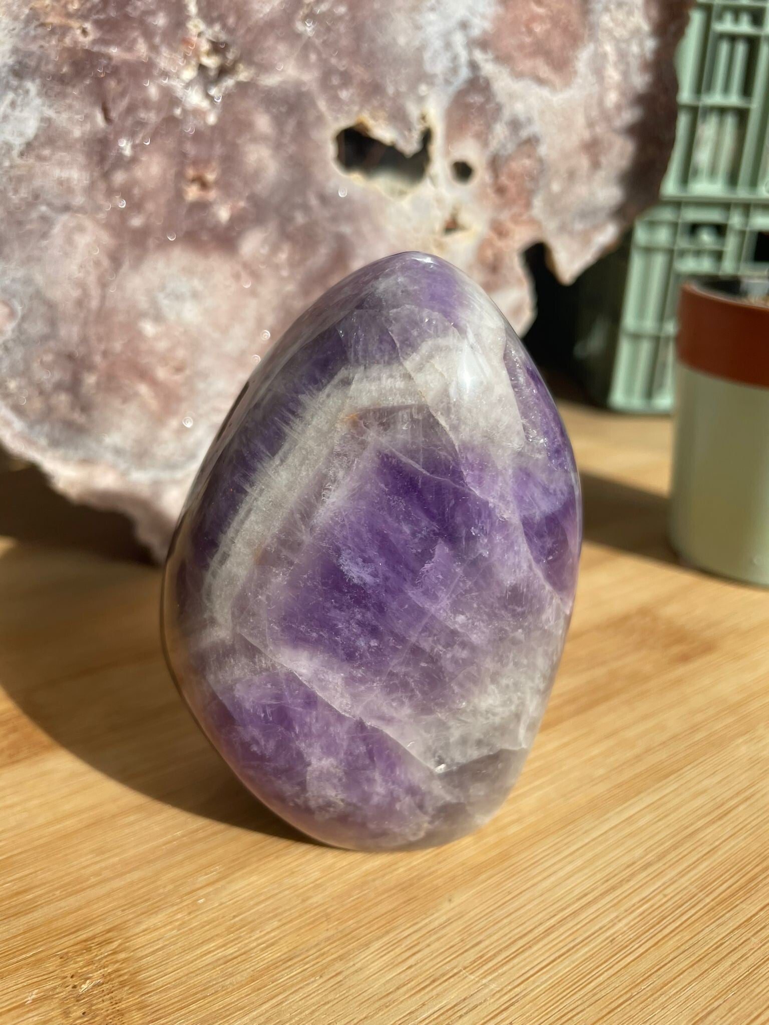 Amethist staat bekend om haar kalmerende werking. Ze helpt bij het loslaten van stress, bevordert helder denken en ondersteunt een goede nachtrust. Ook wordt ze vaak gebruikt bij meditatie of om rust te brengen in een drukke ruimte.