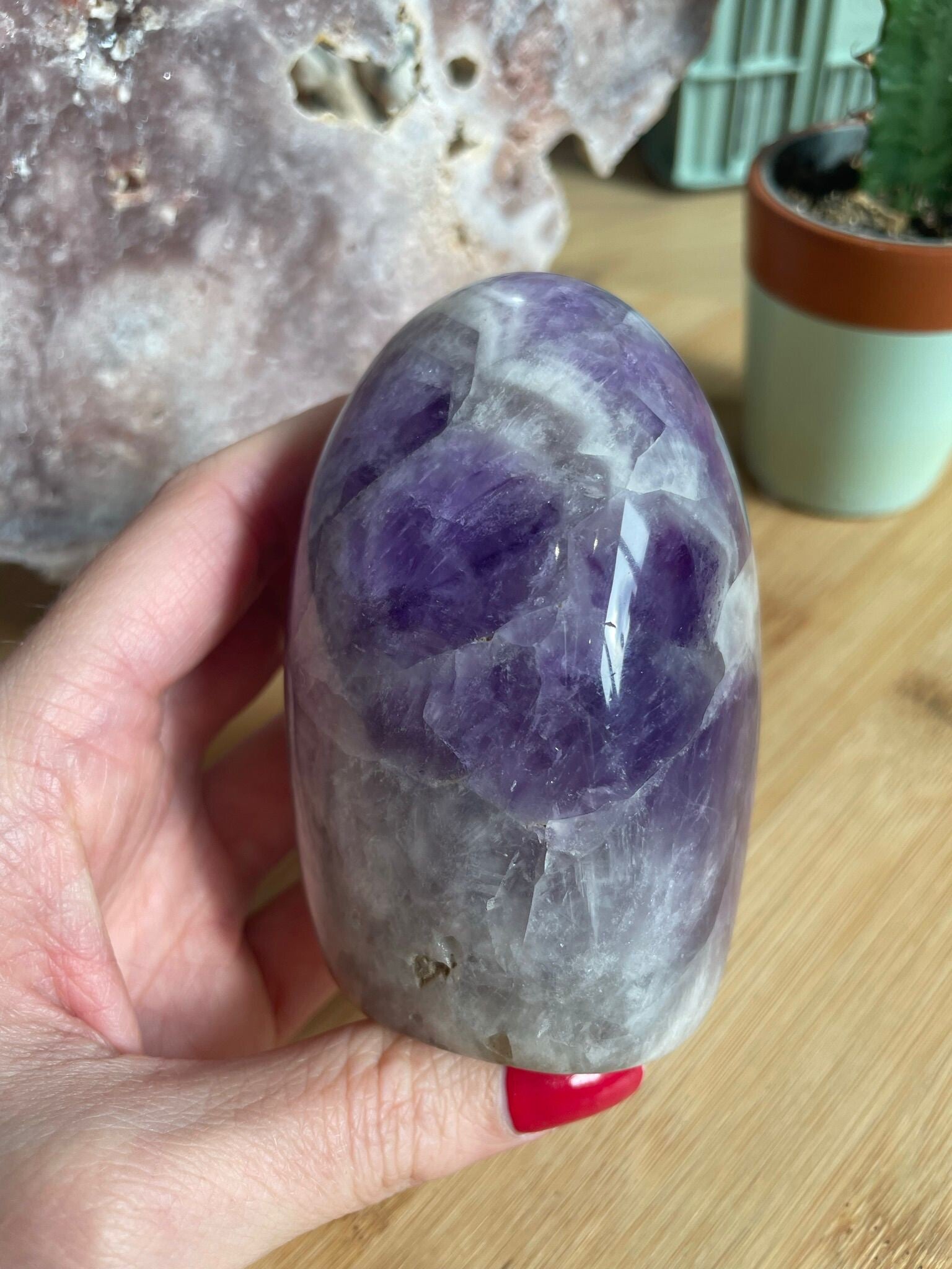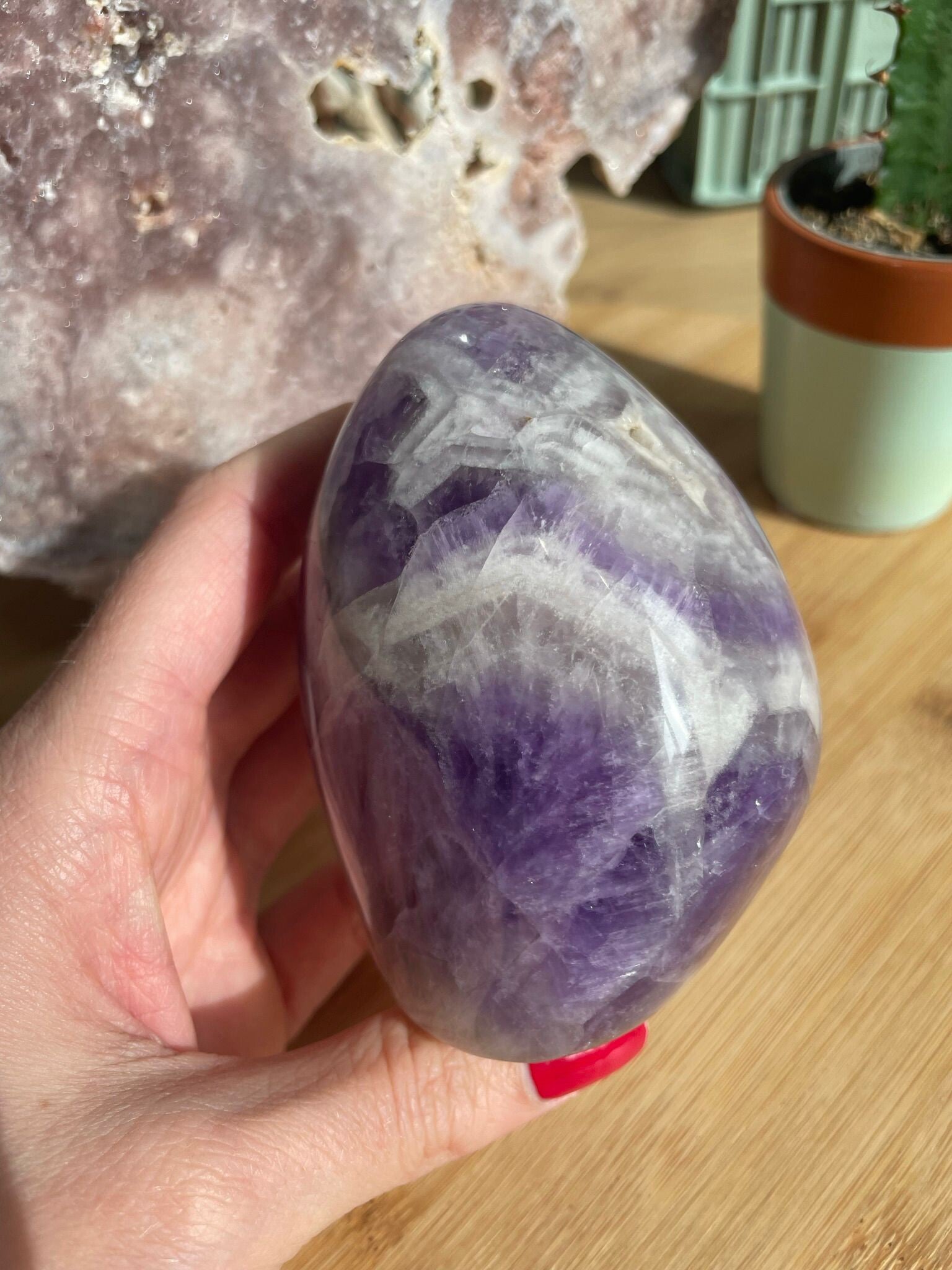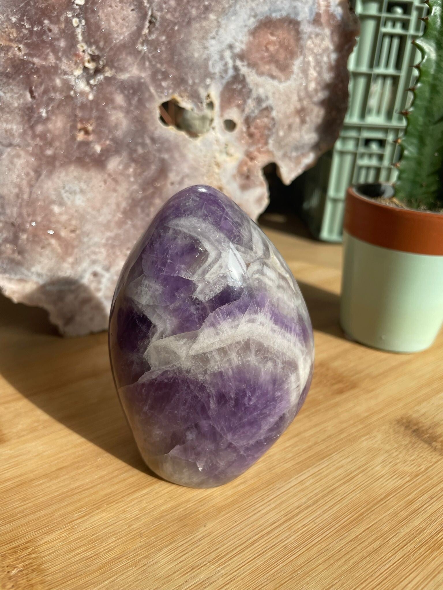 Amethist staat bekend om haar kalmerende werking. Ze helpt bij het loslaten van stress, bevordert helder denken en ondersteunt een goede nachtrust. Ook wordt ze vaak gebruikt bij meditatie of om rust te brengen in een drukke ruimte.
