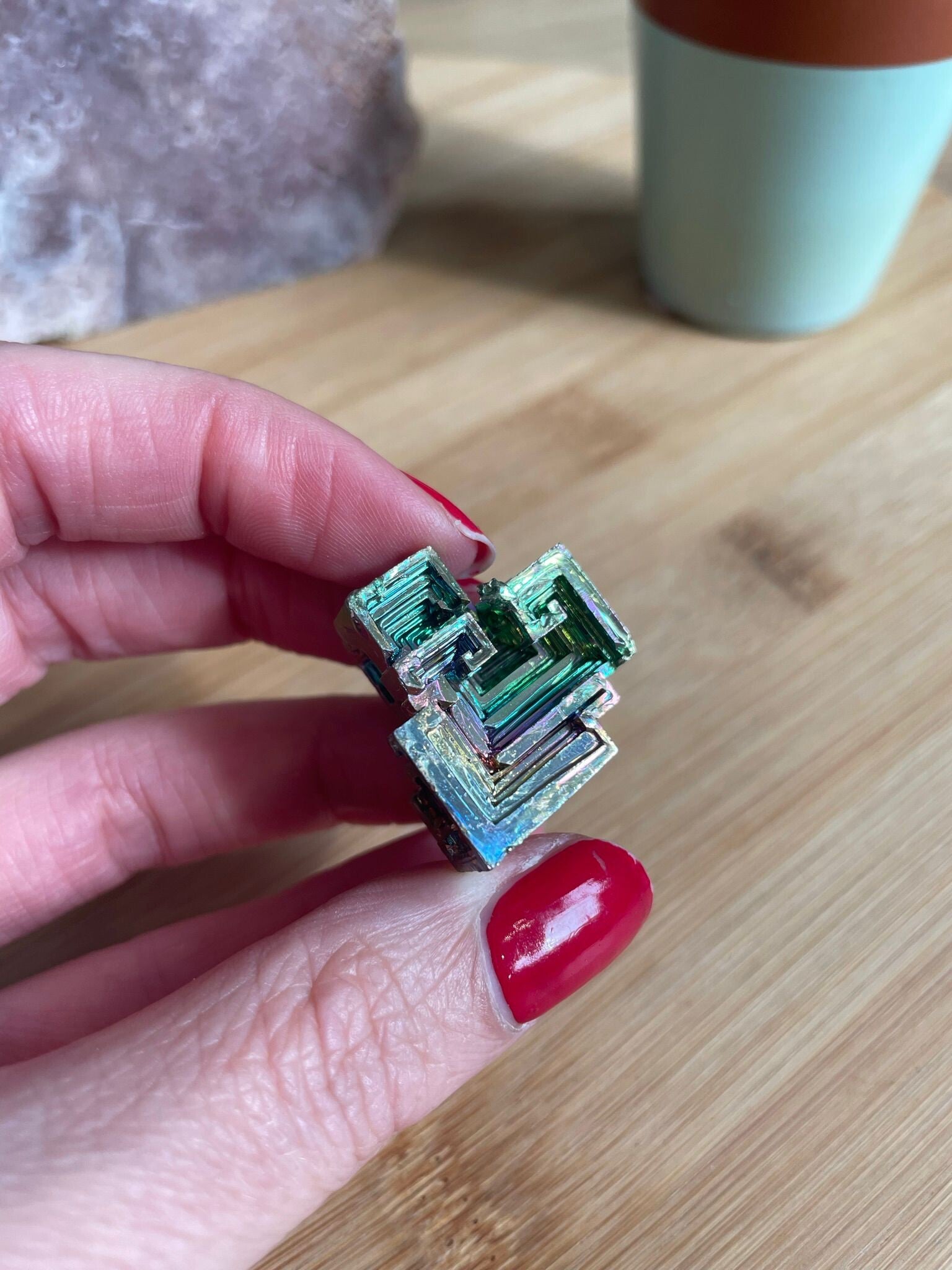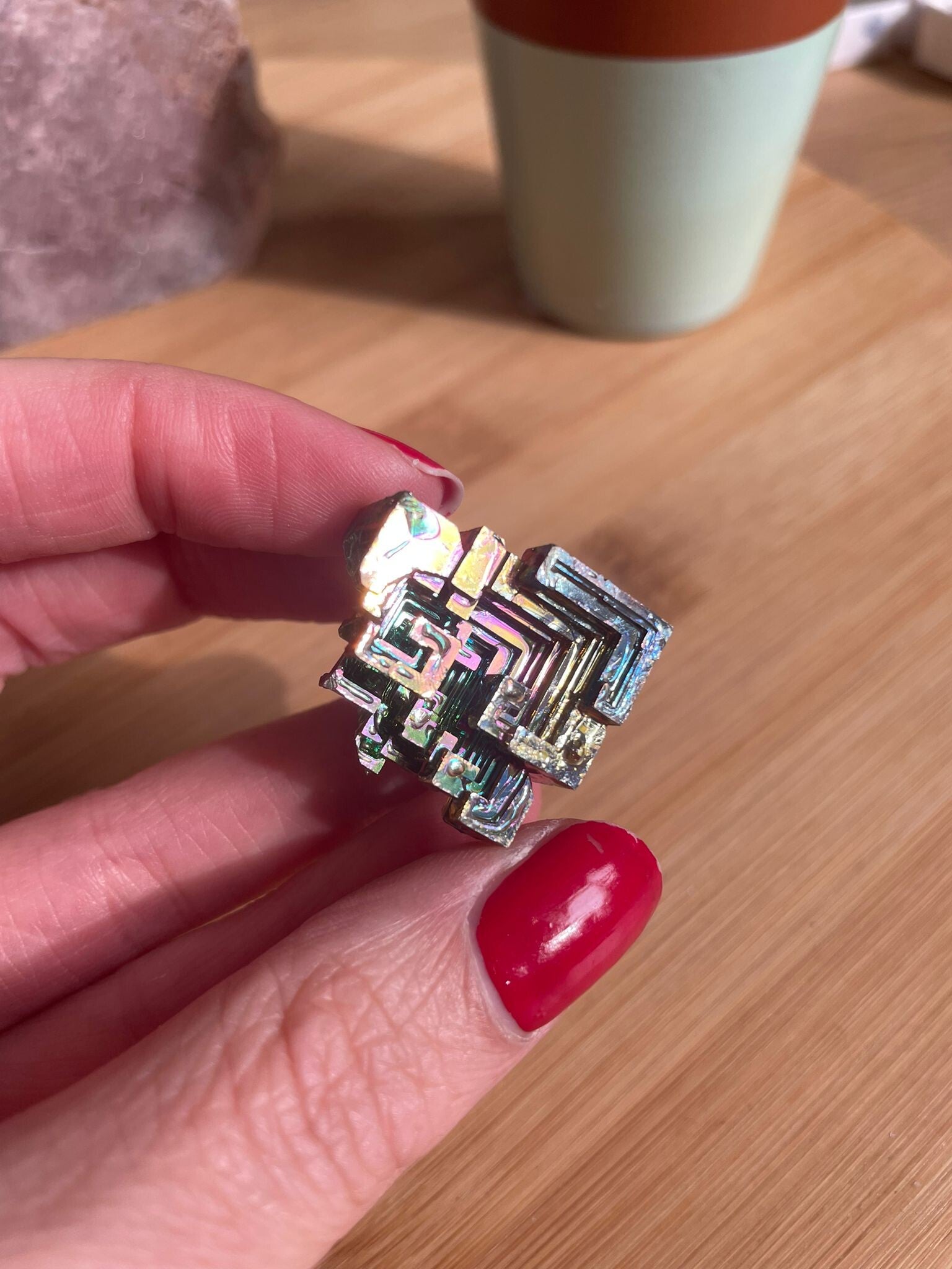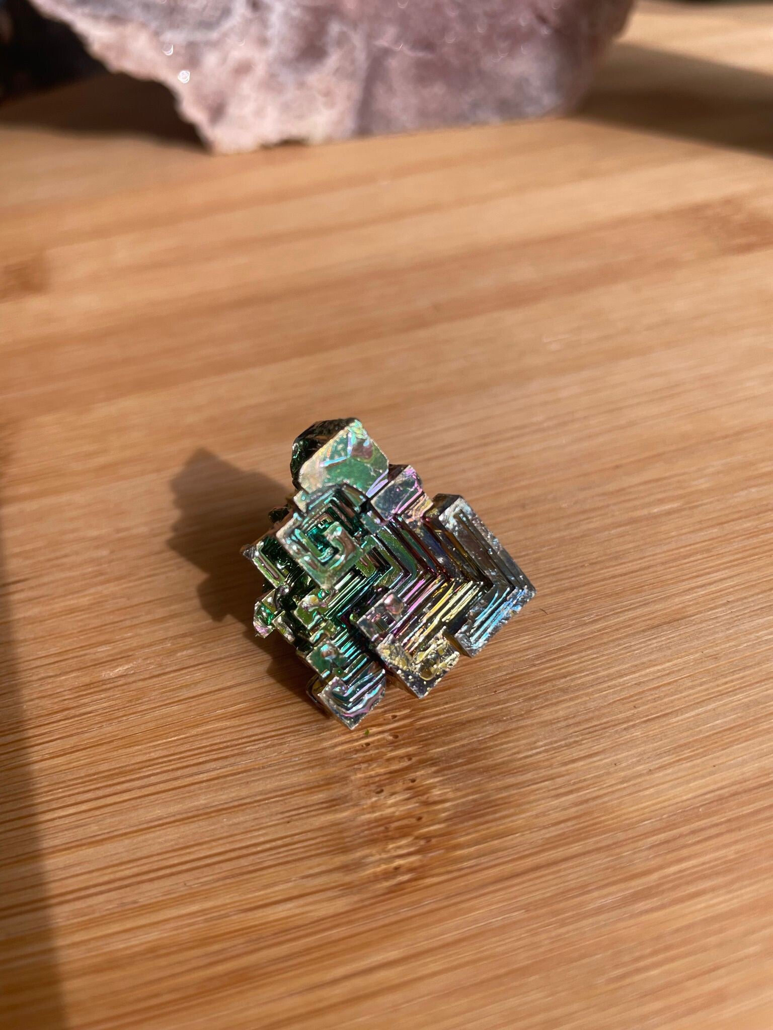 Bismut is misschien wel een van de meest opvallende ‘stenen’ in je collectie. Geen natuurlijke groeivorming zoals bij bergkristal of amethist, maar een metaal dat – wanneer het langzaam wordt afgekoeld – prachtige geometrische vormen en regenboogachtige kleuren laat zien. Denk aan trappen, hoekjes en glans in alle tinten van het licht.