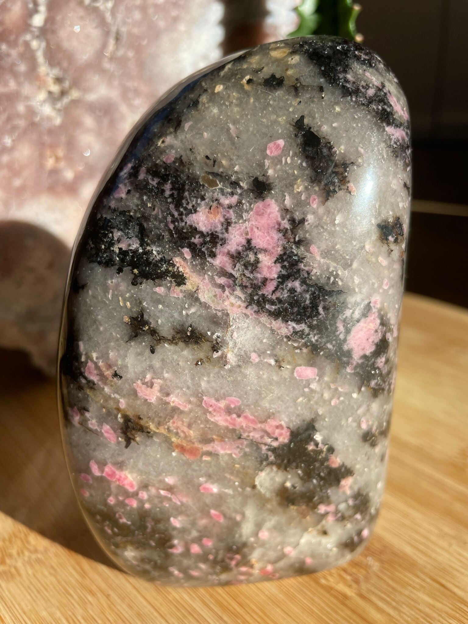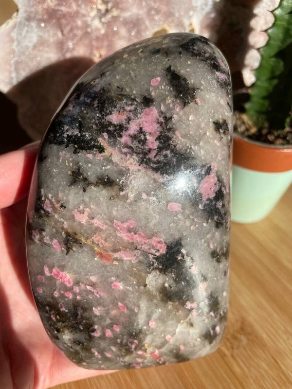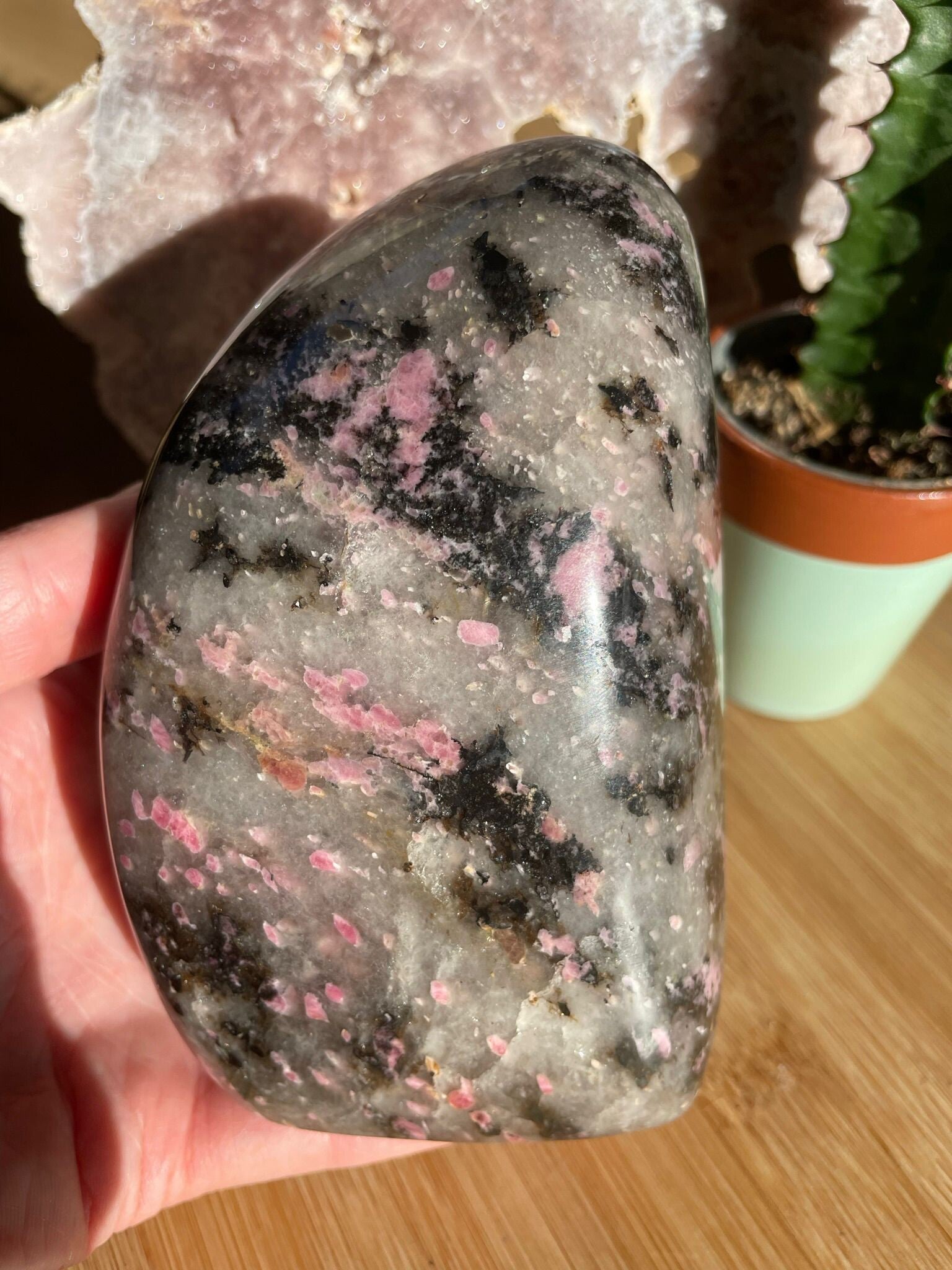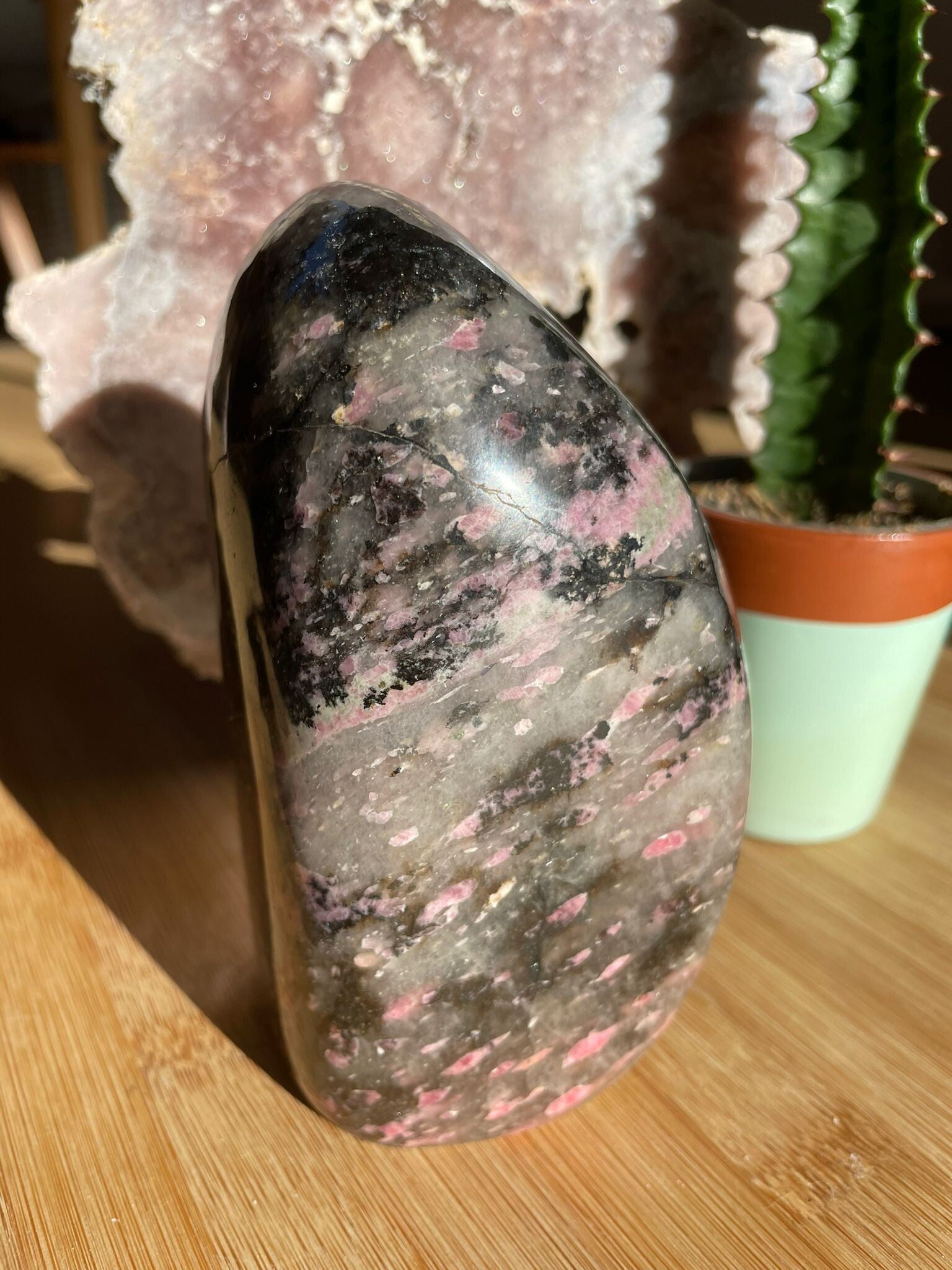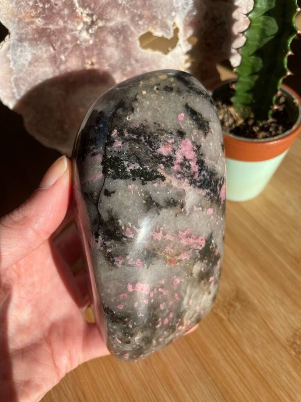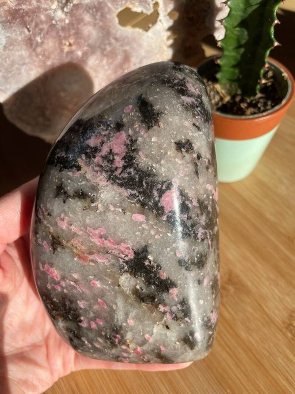Leuk weetje: De zwarte aders in Rhodoniet zijn vaak mangaanhoudende mineralen. Het contrast tussen het roze en zwart maakt dat iedere steen echt een uniek kunstwerkje is van de natuur.