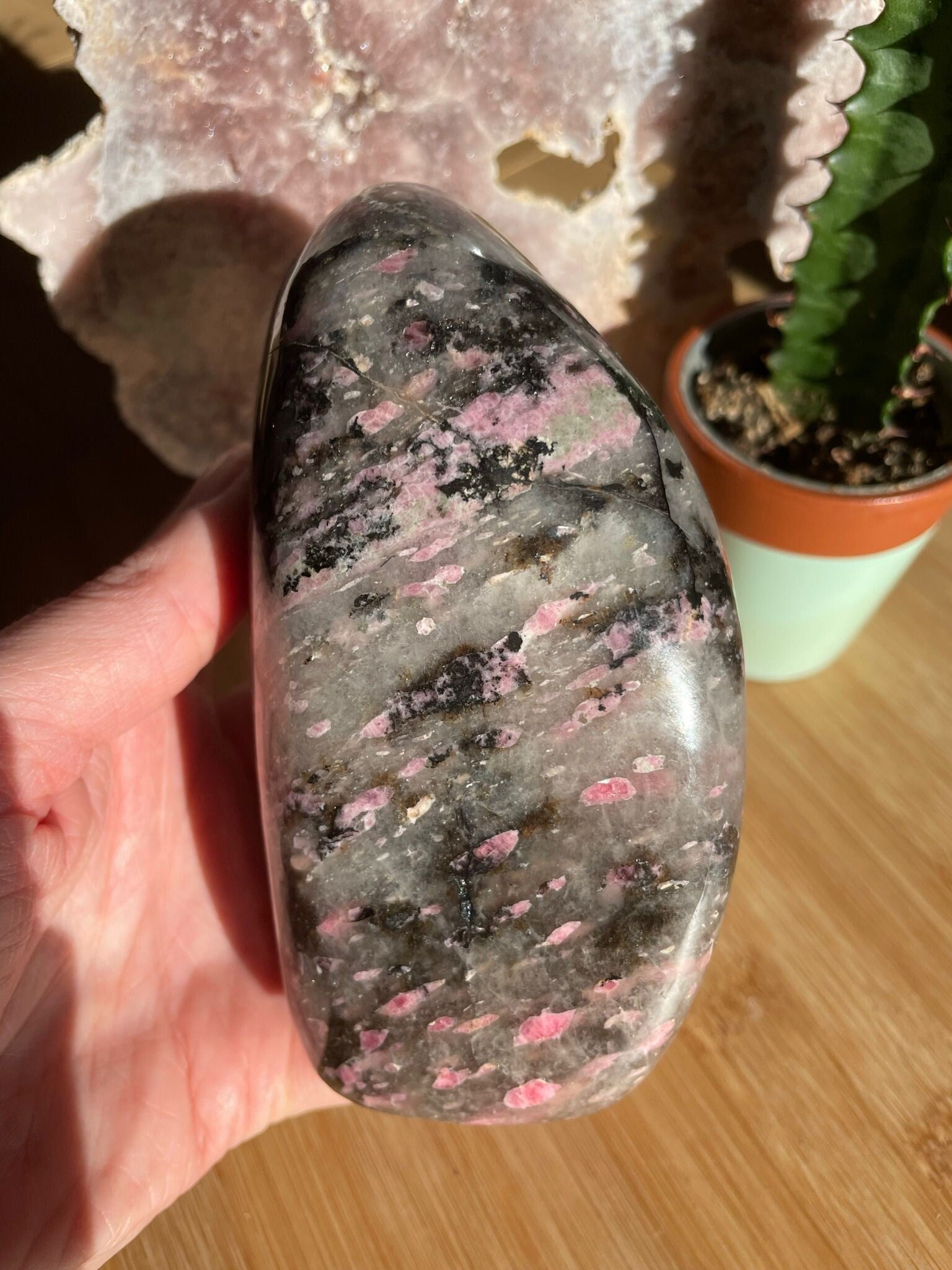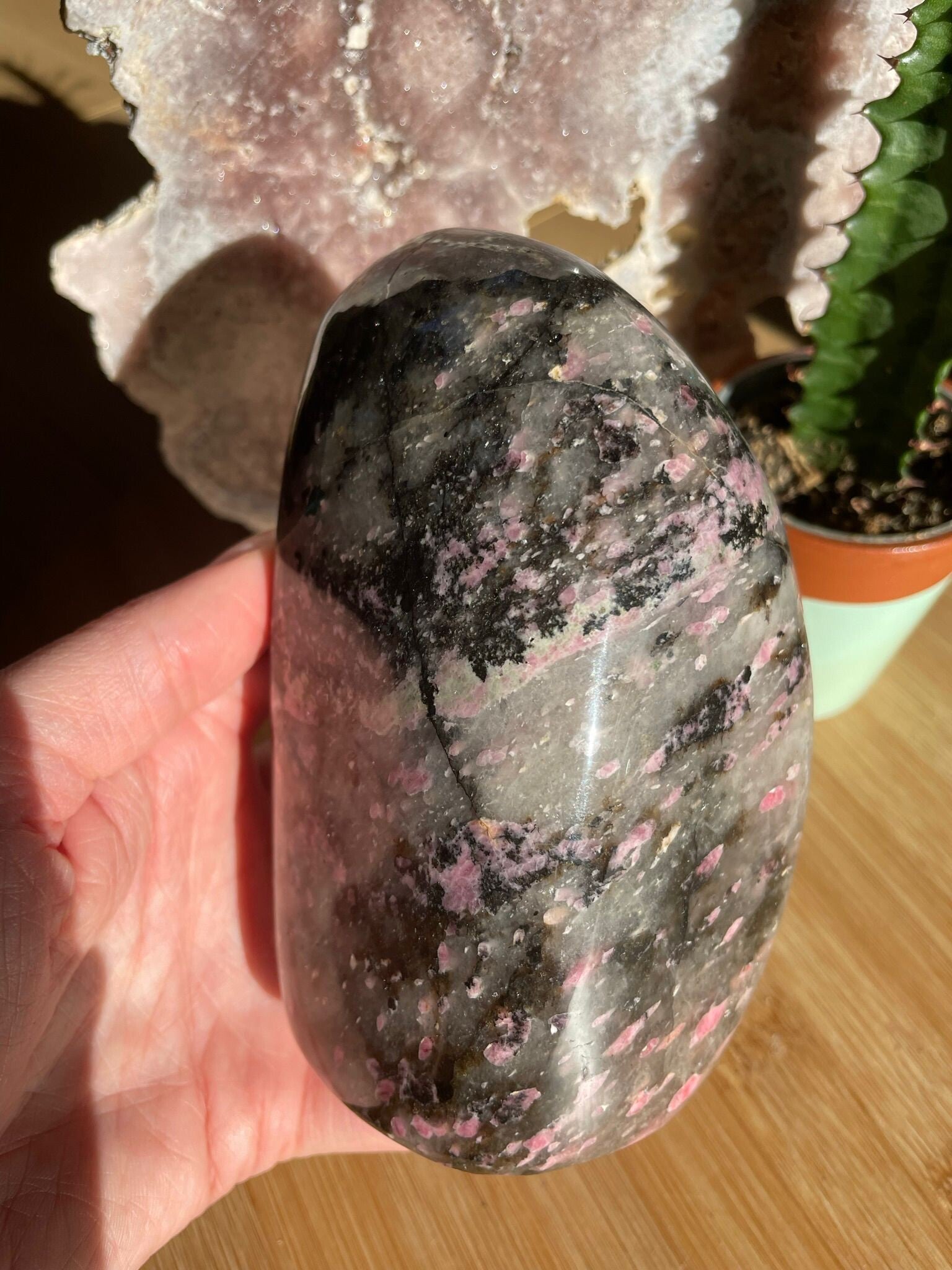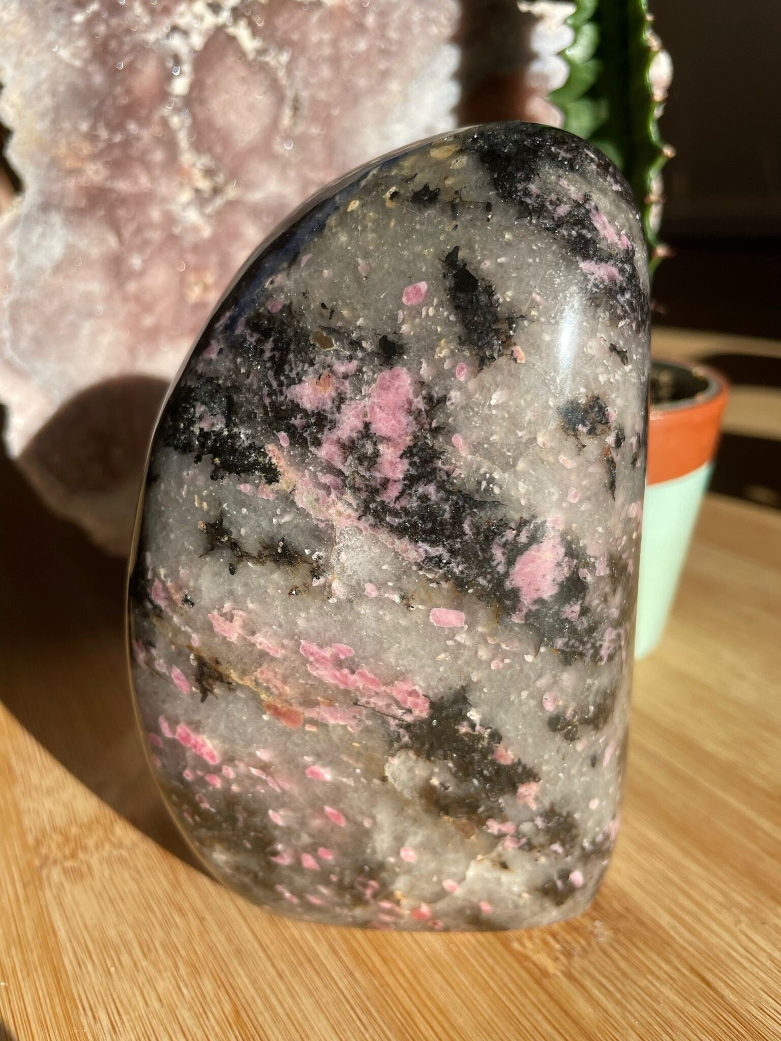 Leuk weetje: De zwarte aders in Rhodoniet zijn vaak mangaanhoudende mineralen. Het contrast tussen het roze en zwart maakt dat iedere steen echt een uniek kunstwerkje is van de natuur.