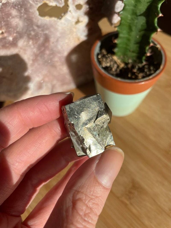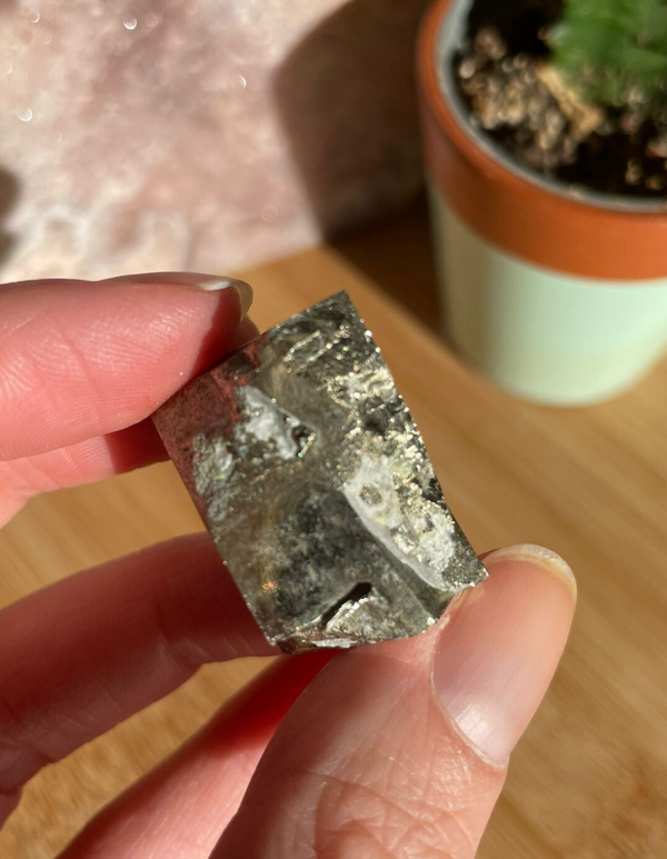 Kubus Pyriet valt direct op door zijn opvallende, regelmatige kubusvormen en glimmende metalen glans. Pyriet, ook wel "fool’s gold" genoemd, dankt zijn bijnaam aan zijn gouden kleur en glans, die op echt goud lijkt, maar een stuk vriendelijker voor je portemonnee is.
