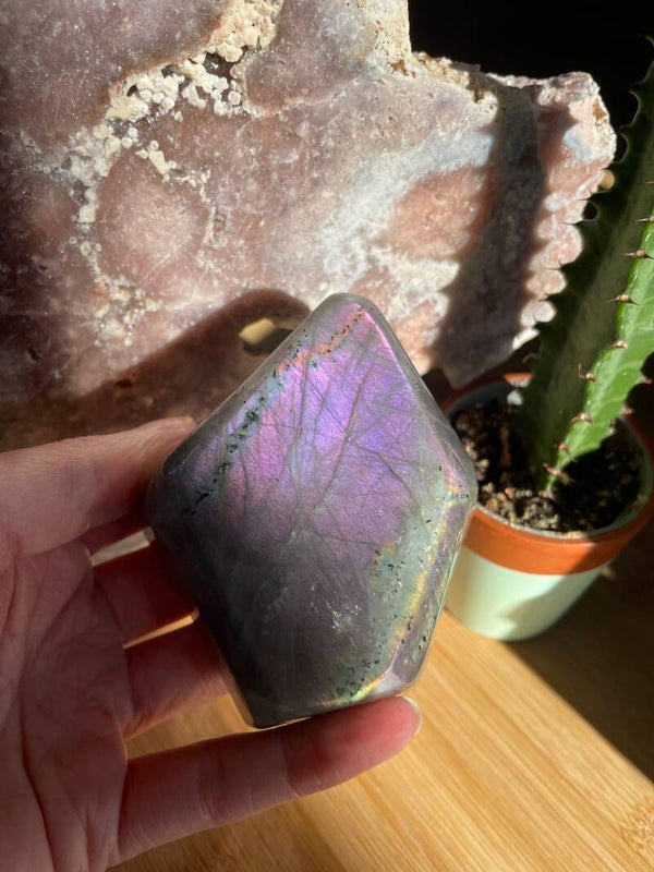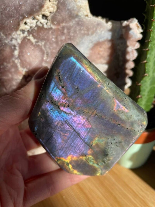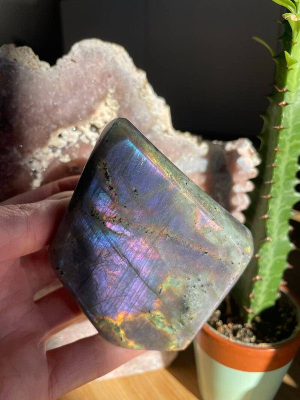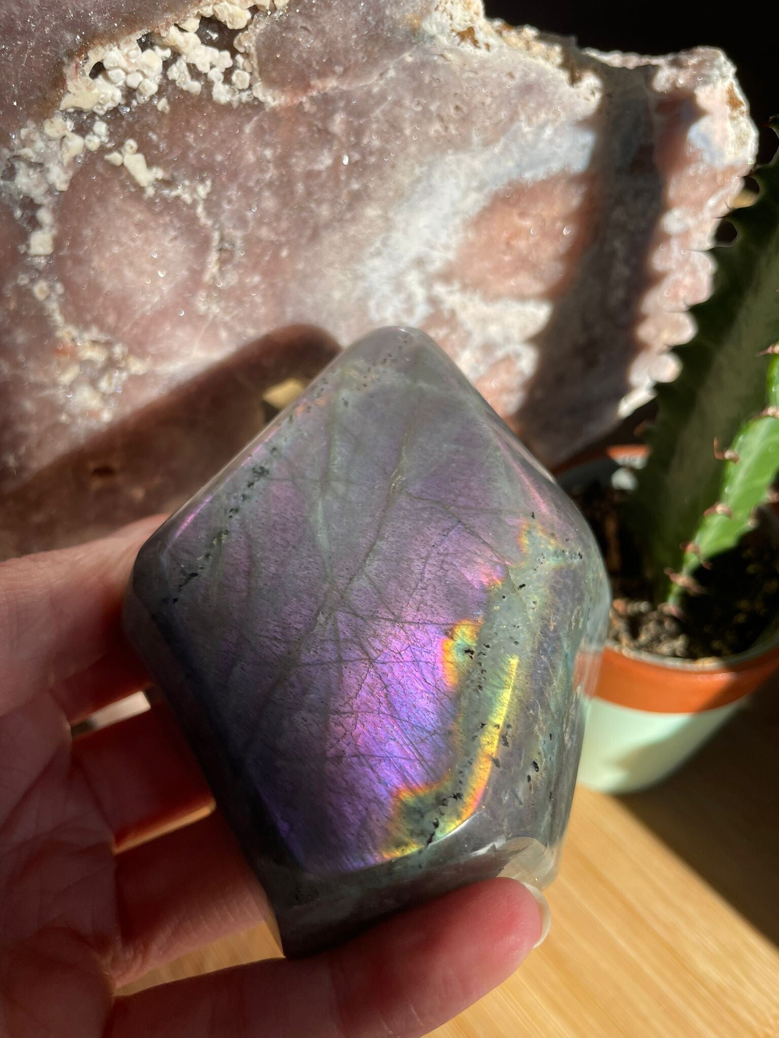 Leuk weetje: In sommige culturen werd labradoriet gezien als ‘bevroren noorderlicht’. Men geloofde dat het licht van de aurora borealis in de steen gevangen zat, bij Paarse Labradoriet lijkt dat verhaal haast waar.