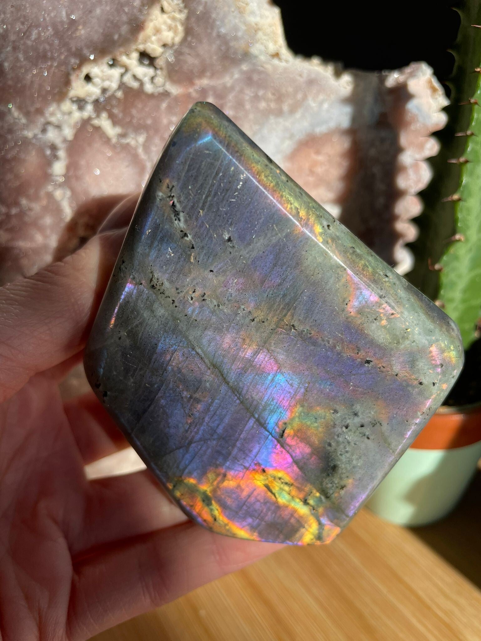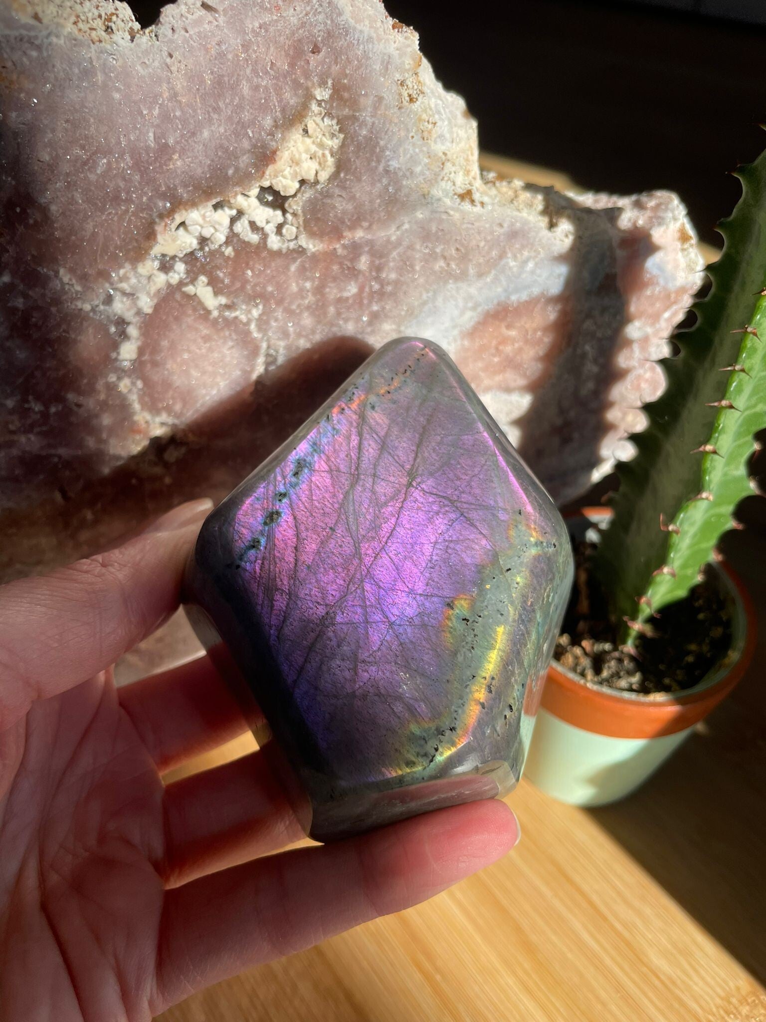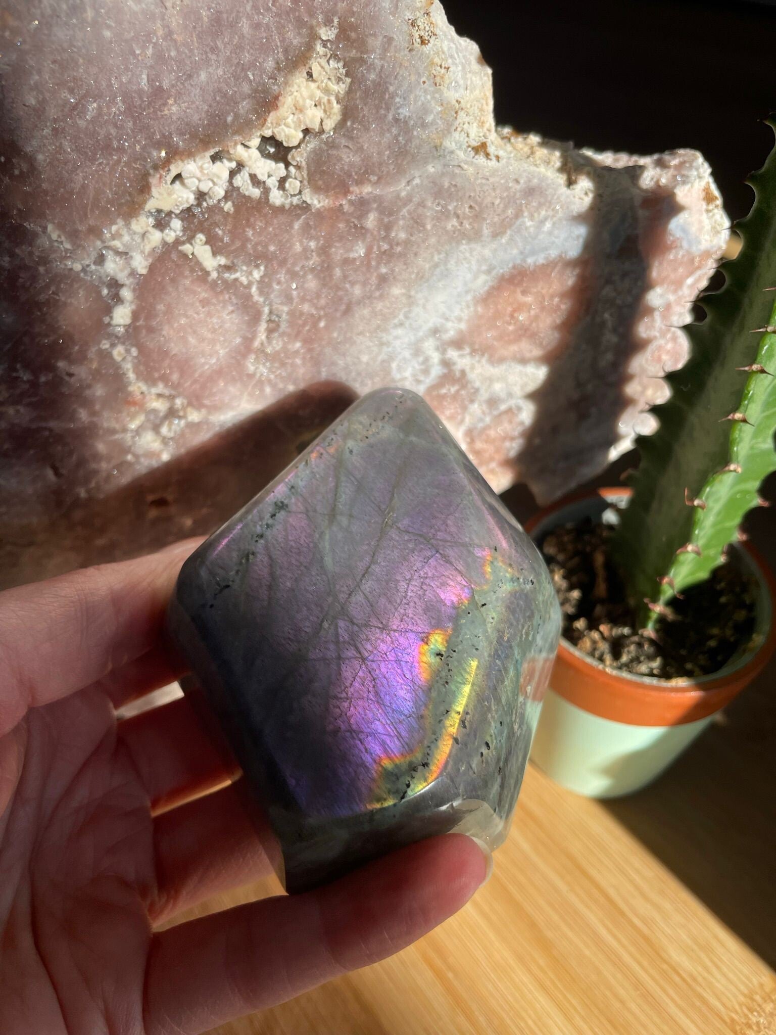 Leuk weetje: In sommige culturen werd labradoriet gezien als ‘bevroren noorderlicht’. Men geloofde dat het licht van de aurora borealis in de steen gevangen zat, bij Paarse Labradoriet lijkt dat verhaal haast waar.
