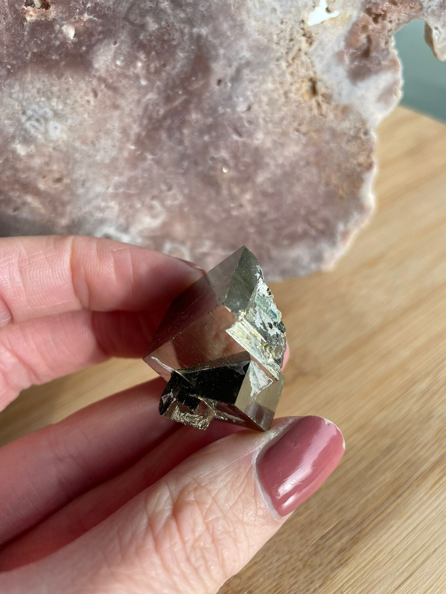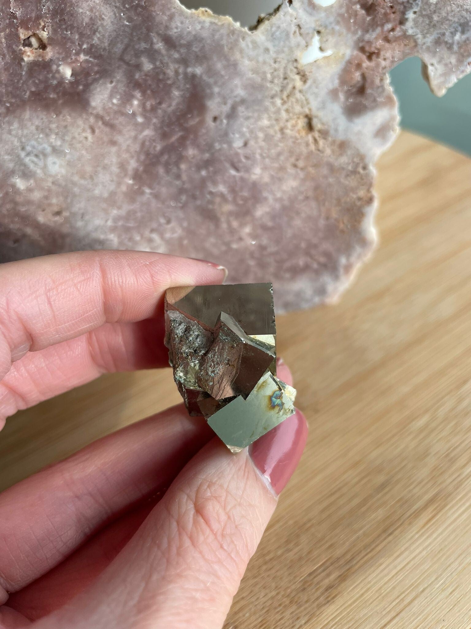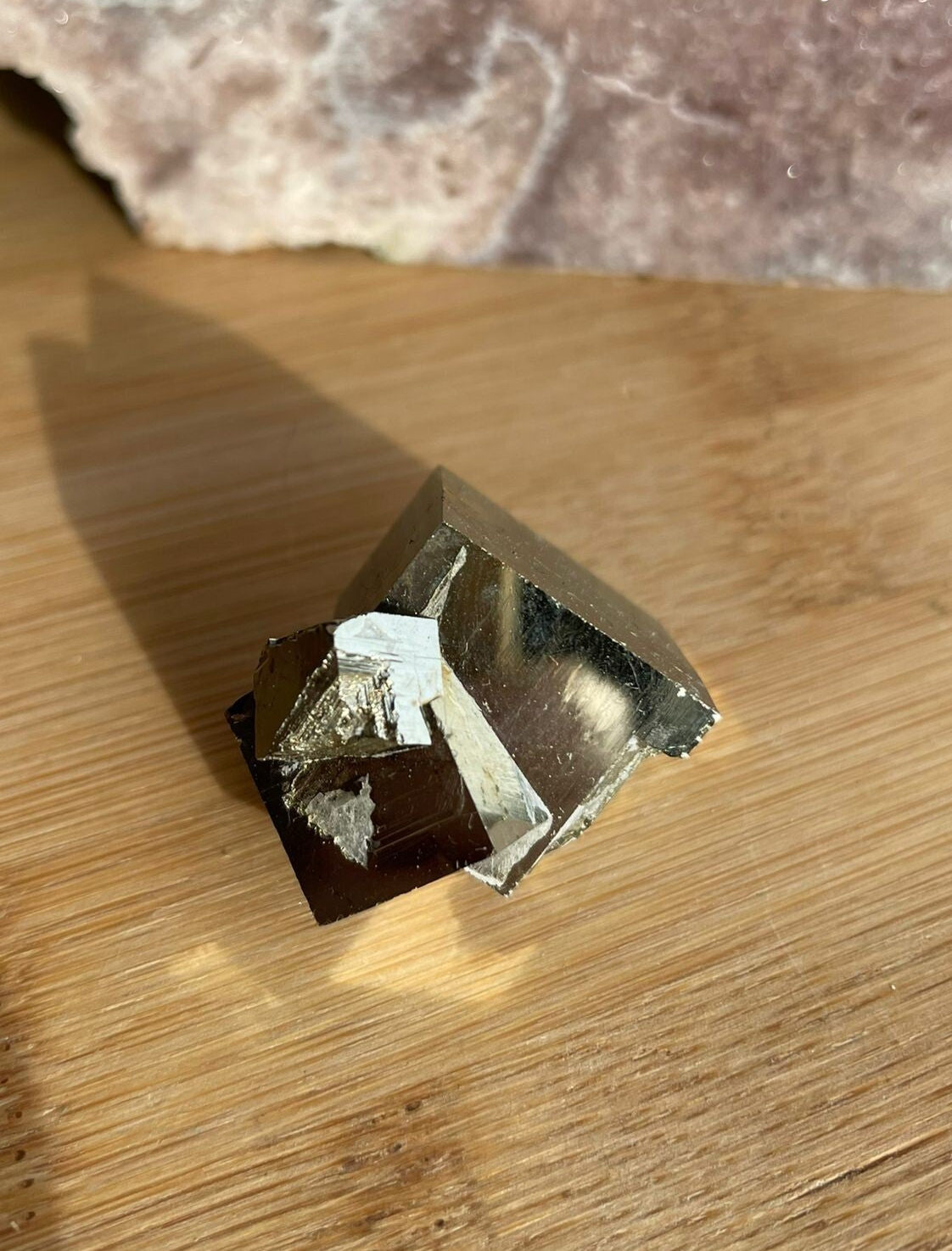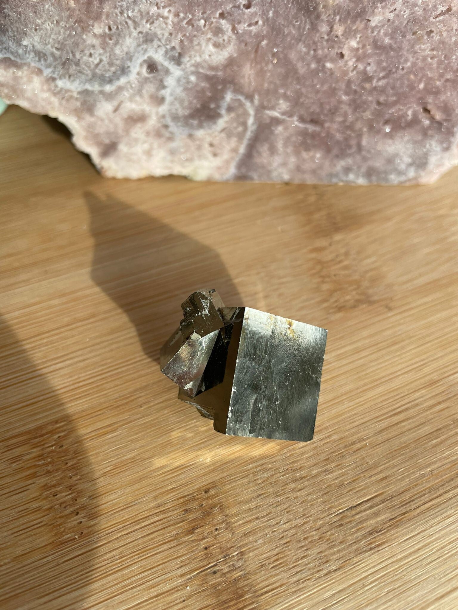 Kubus Pyriet valt direct op door zijn opvallende, regelmatige kubusvormen en glimmende metalen glans. Pyriet, ook wel "fool’s gold" genoemd, dankt zijn bijnaam aan zijn gouden kleur en glans, die op echt goud lijkt, maar een stuk vriendelijker voor je portemonnee is.