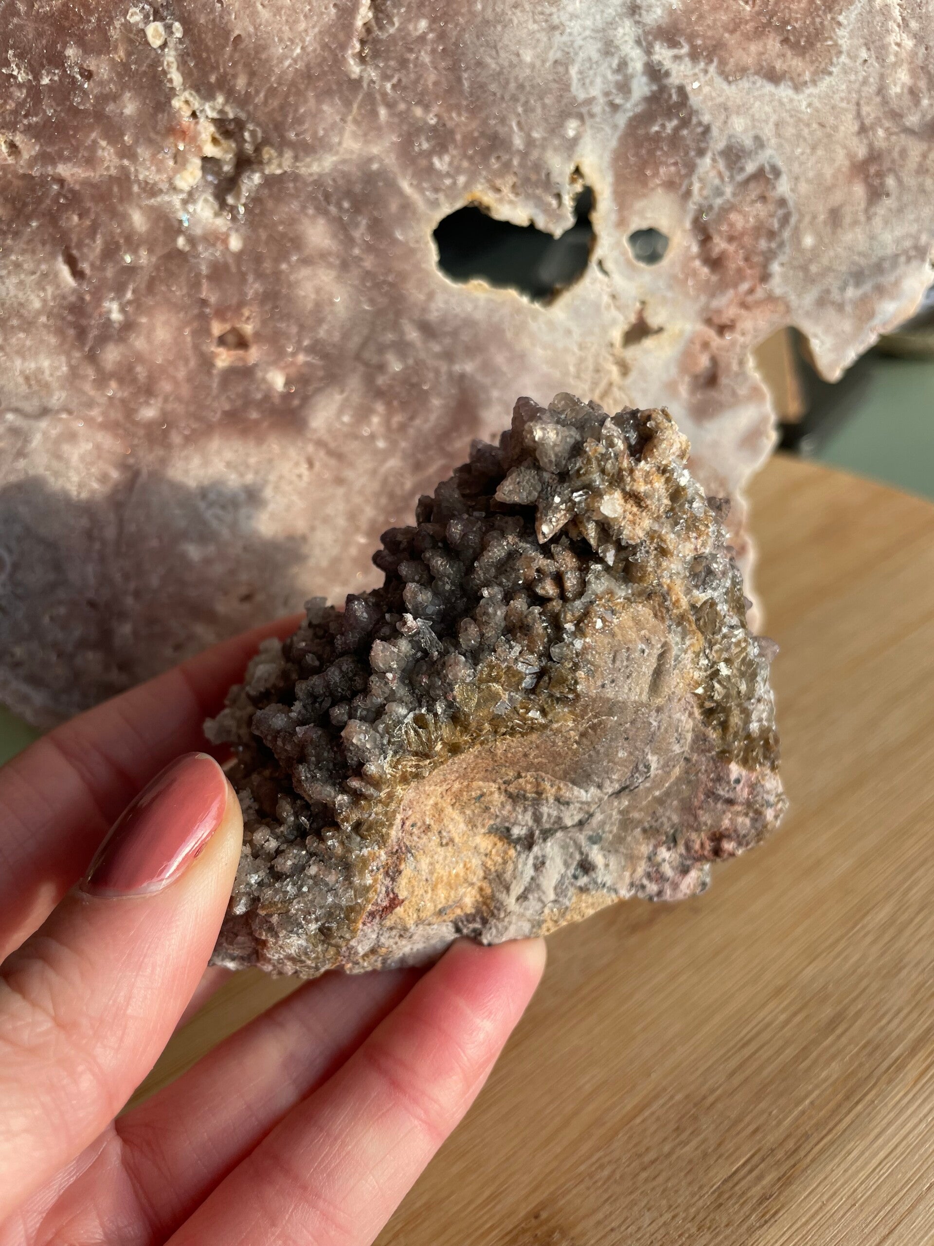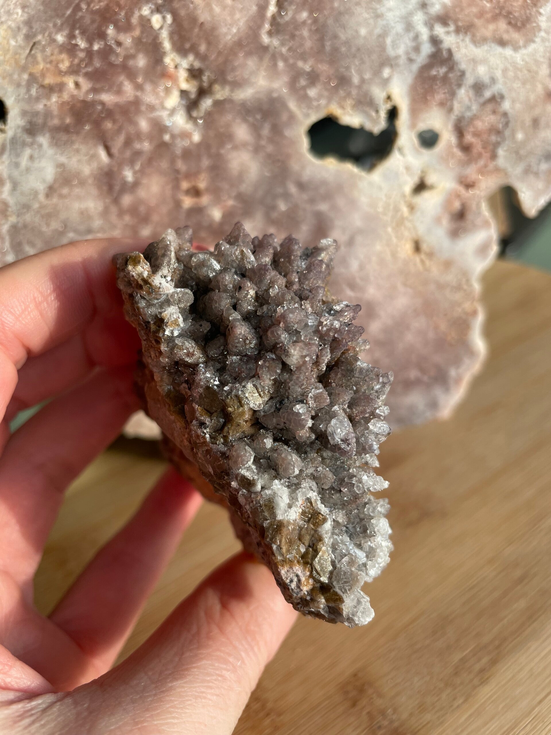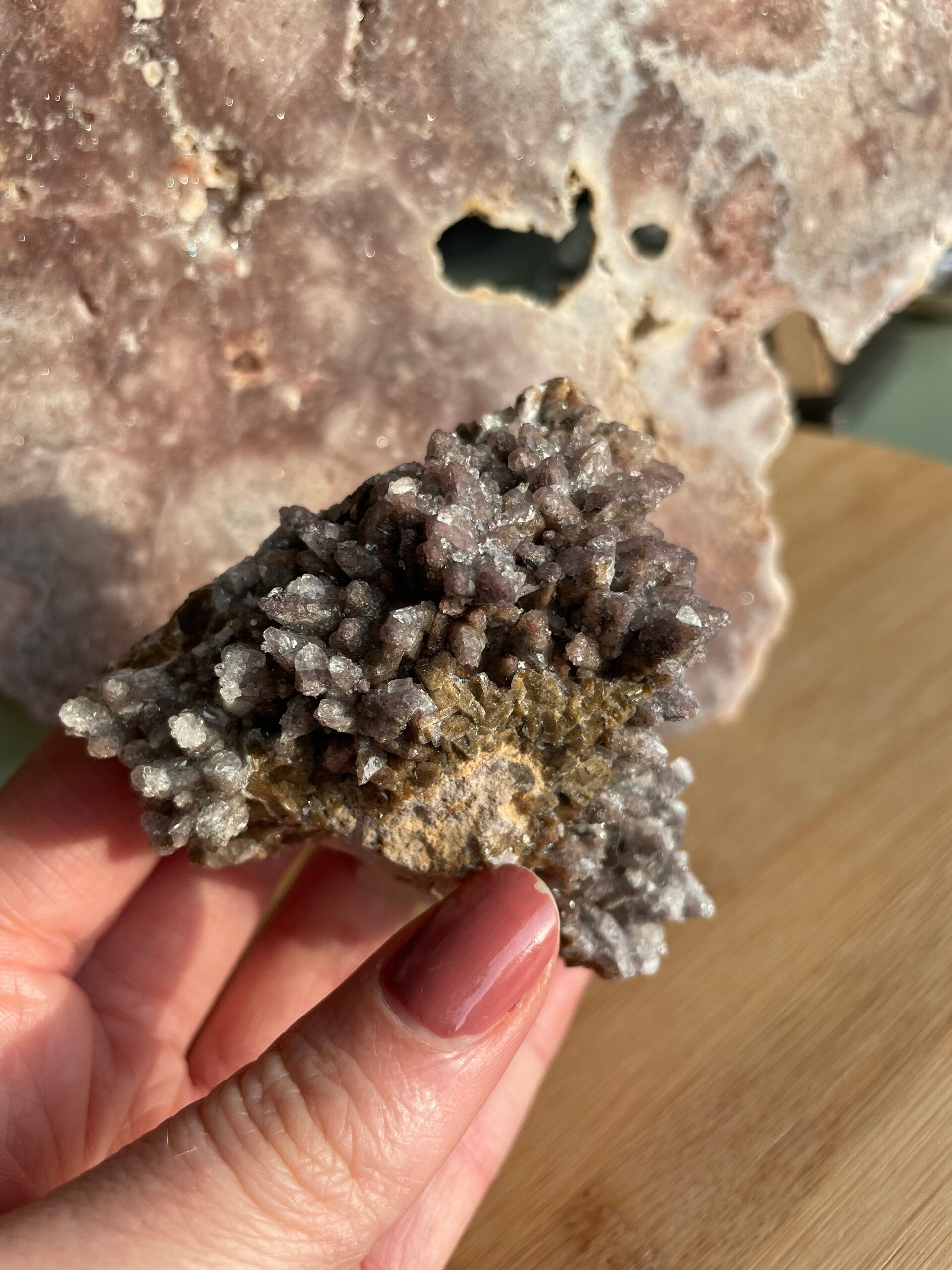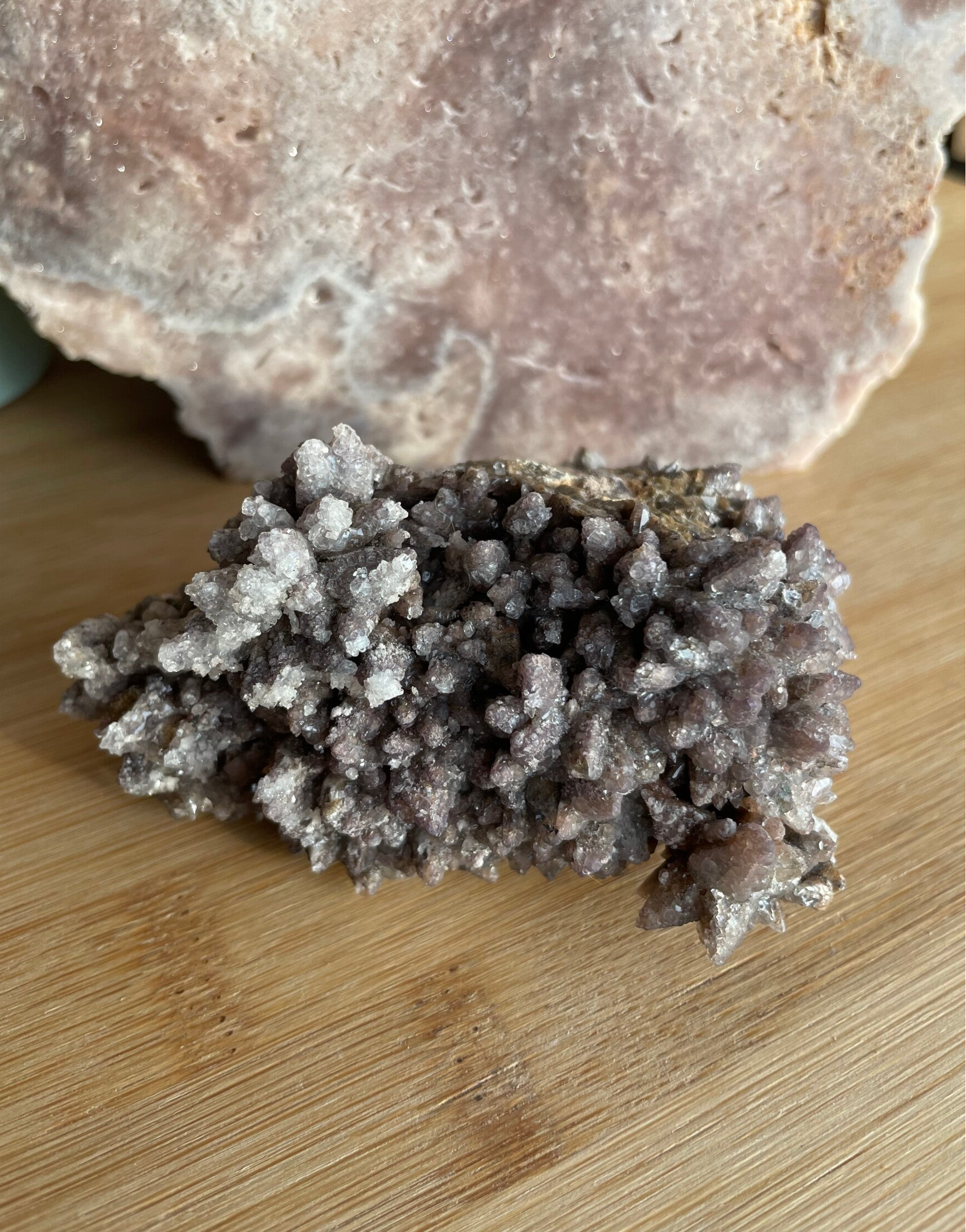 Dogtooth calciet valt op door z’n scherpe, puntige kristallen die vaak lijken op kleine hondentanden – daarom kreeg de steen ook z’n speelse naam. Elk stukje heeft een uniek patroon van kristallen die samen een prachtig, geometrisch effect vormen.