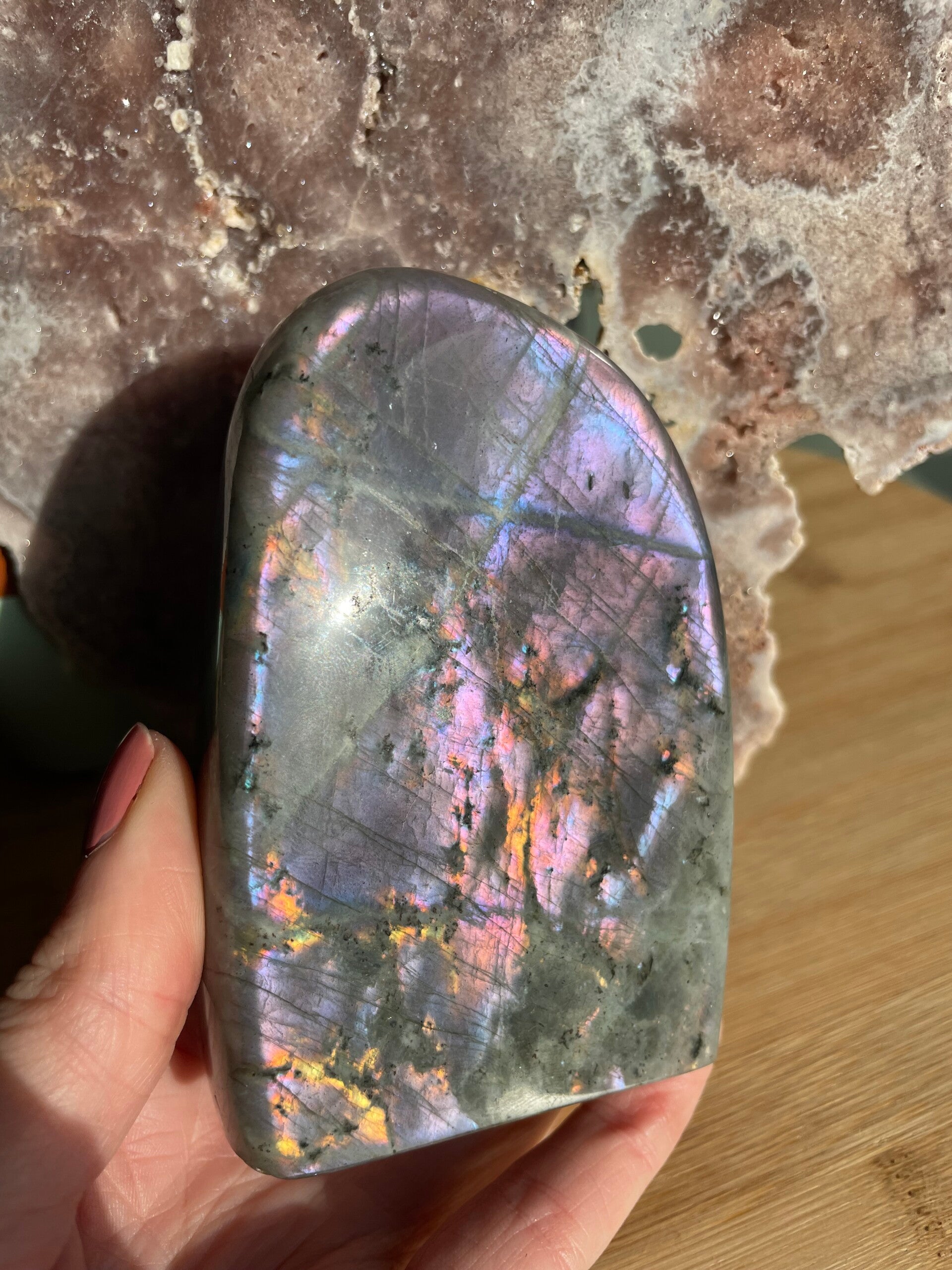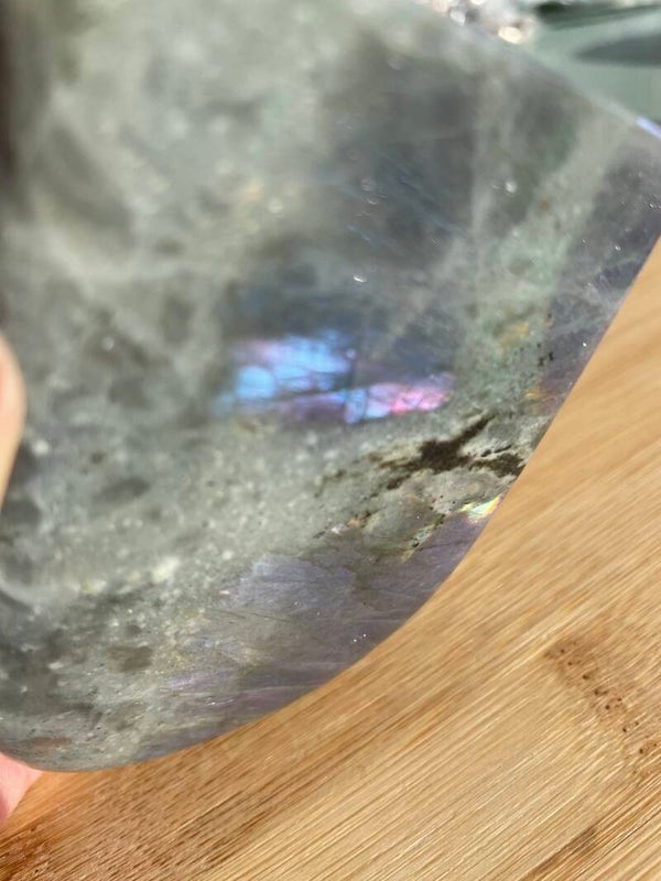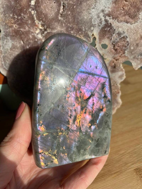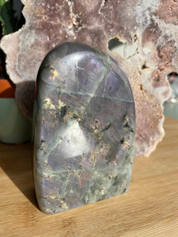 Leuk weetje: In sommige culturen werd labradoriet gezien als ‘bevroren noorderlicht’. Men geloofde dat het licht van de aurora borealis in de steen gevangen zat, bij Paarse Labradoriet lijkt dat verhaal haast waar.