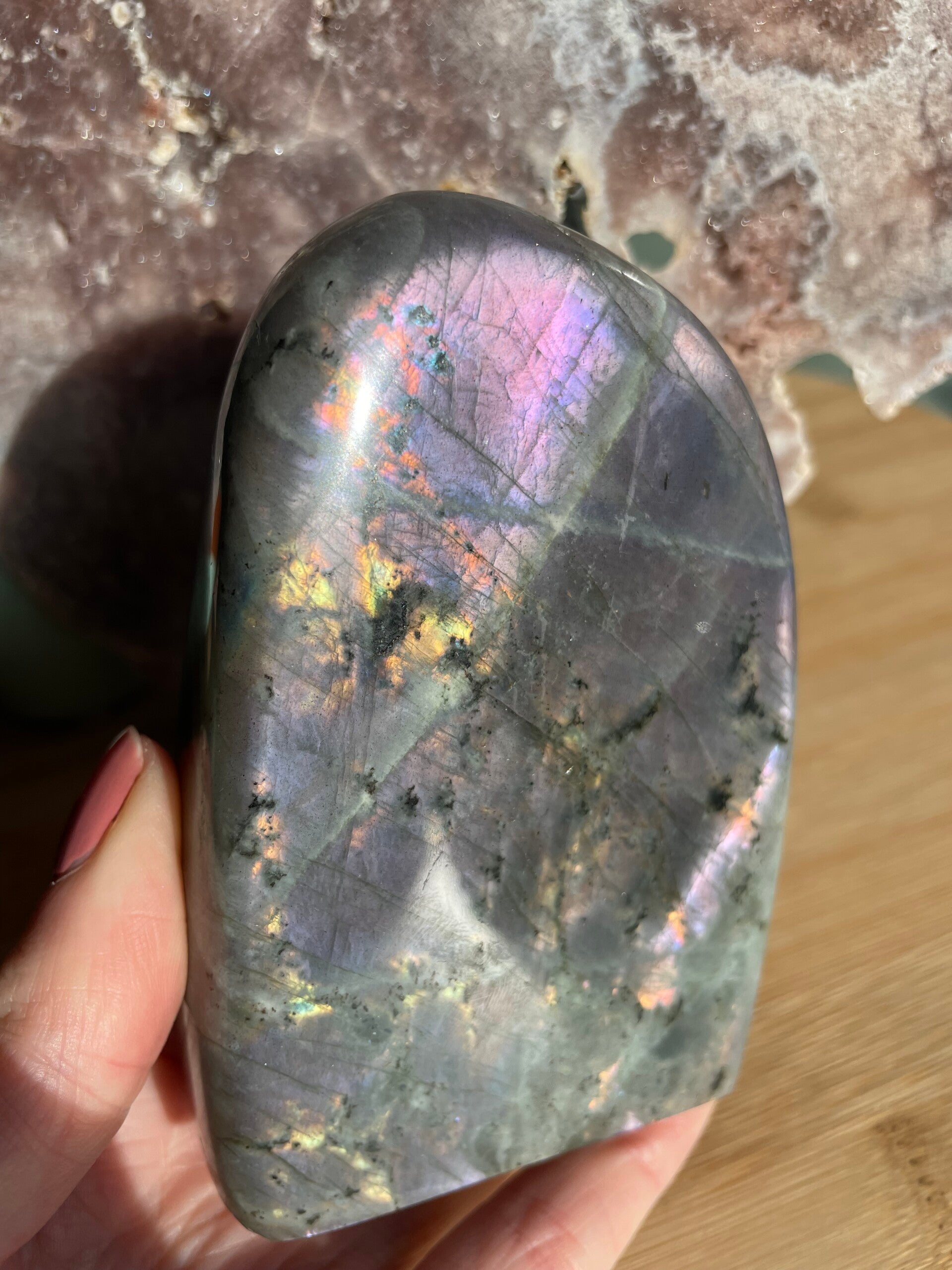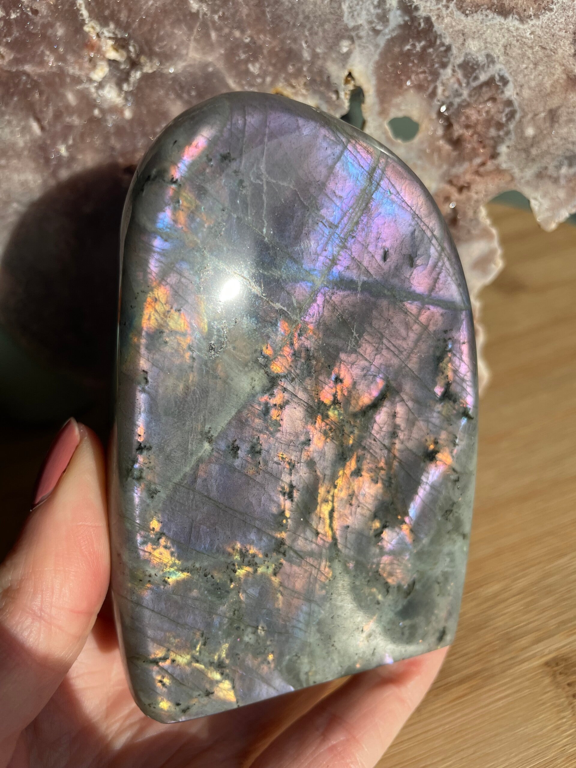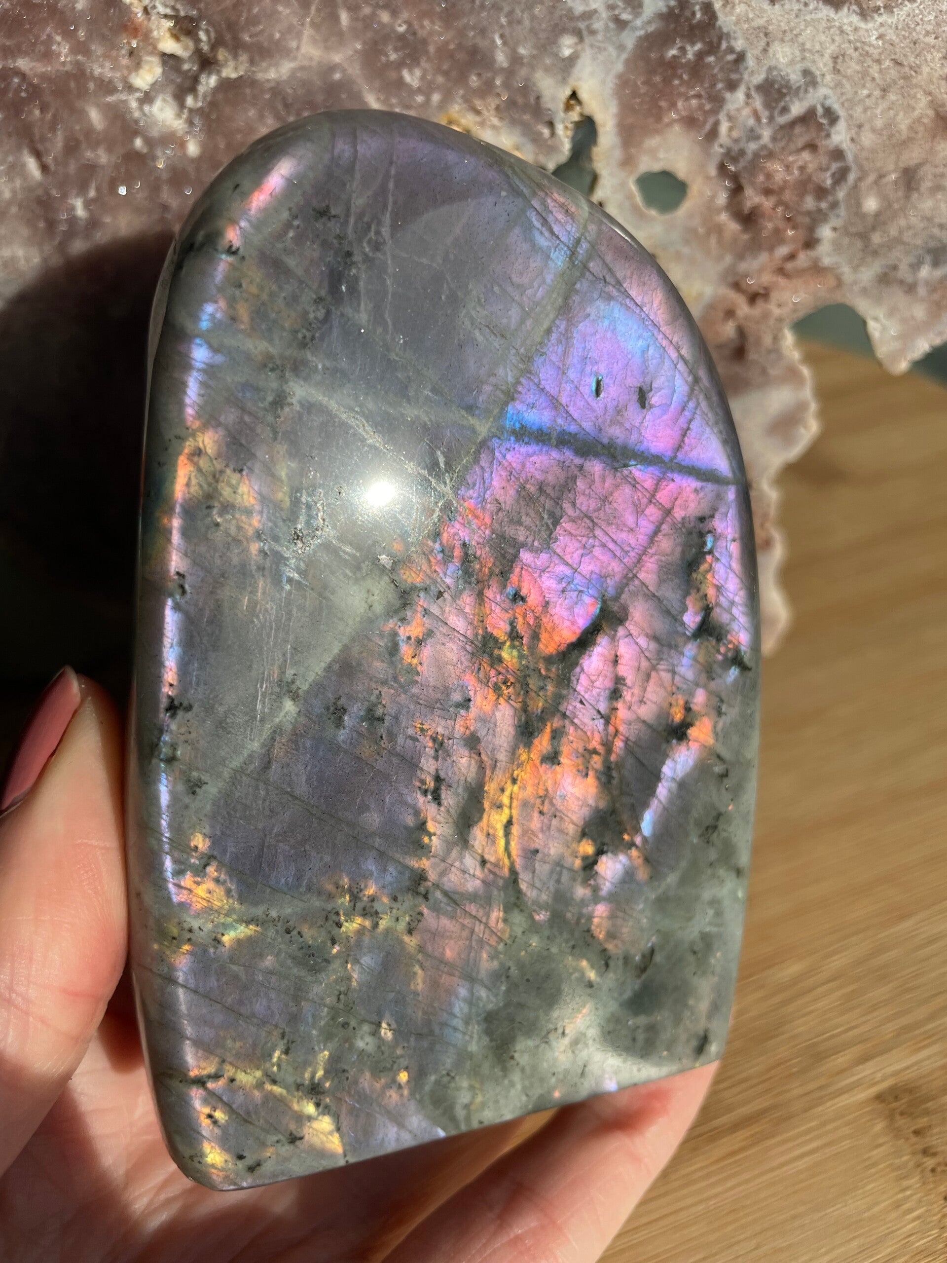 Leuk weetje: In sommige culturen werd labradoriet gezien als ‘bevroren noorderlicht’. Men geloofde dat het licht van de aurora borealis in de steen gevangen zat, bij Paarse Labradoriet lijkt dat verhaal haast waar.