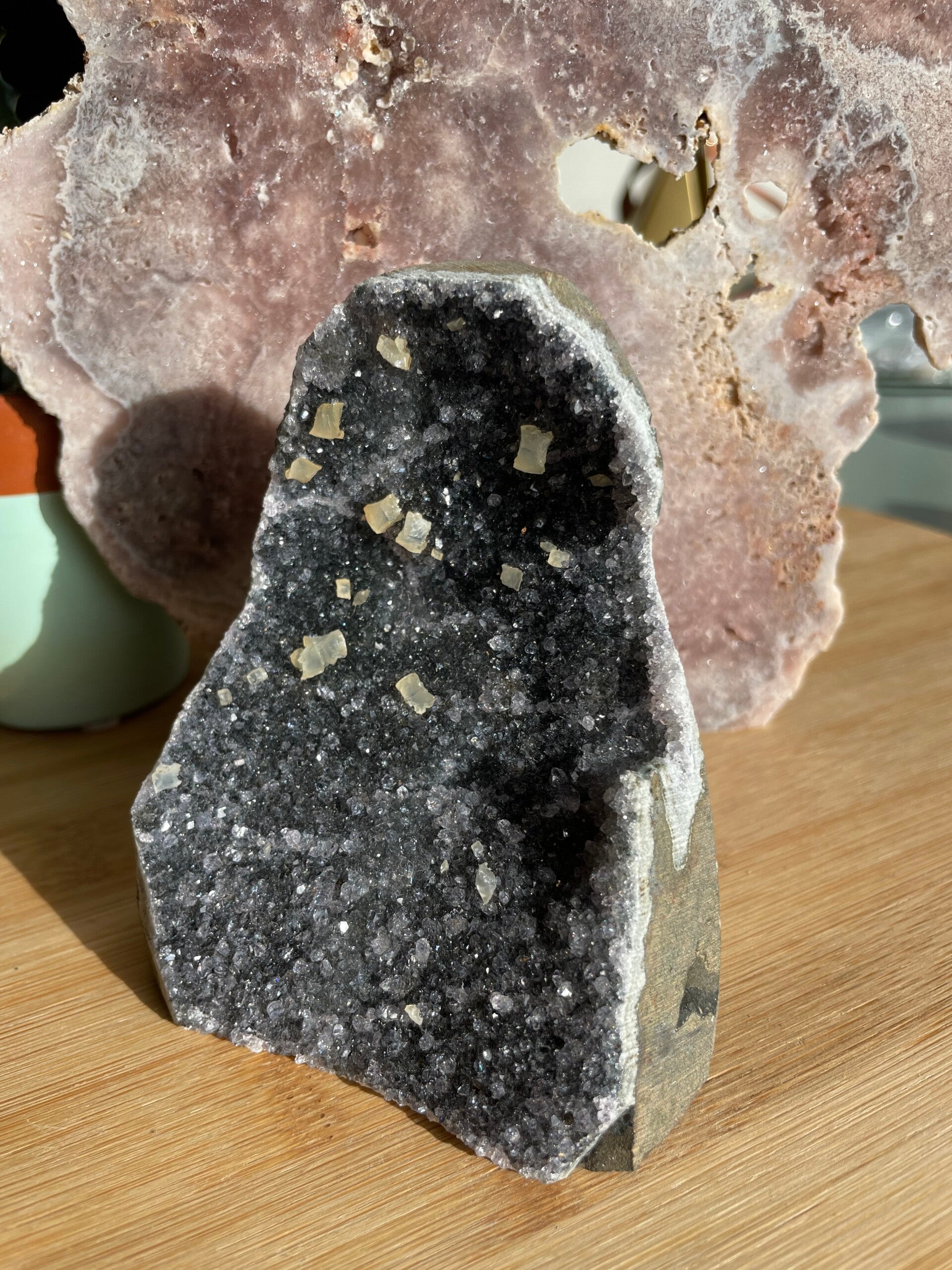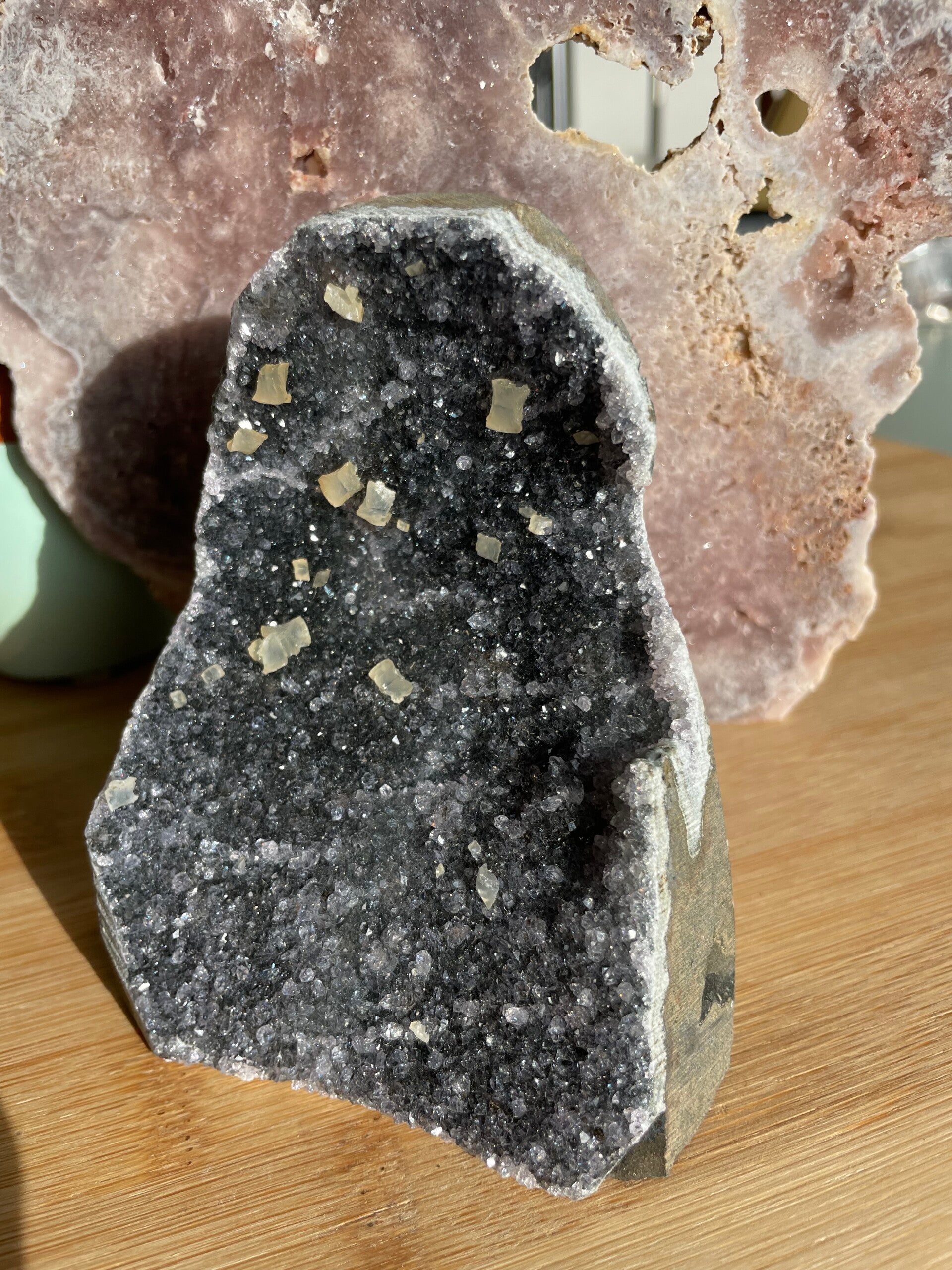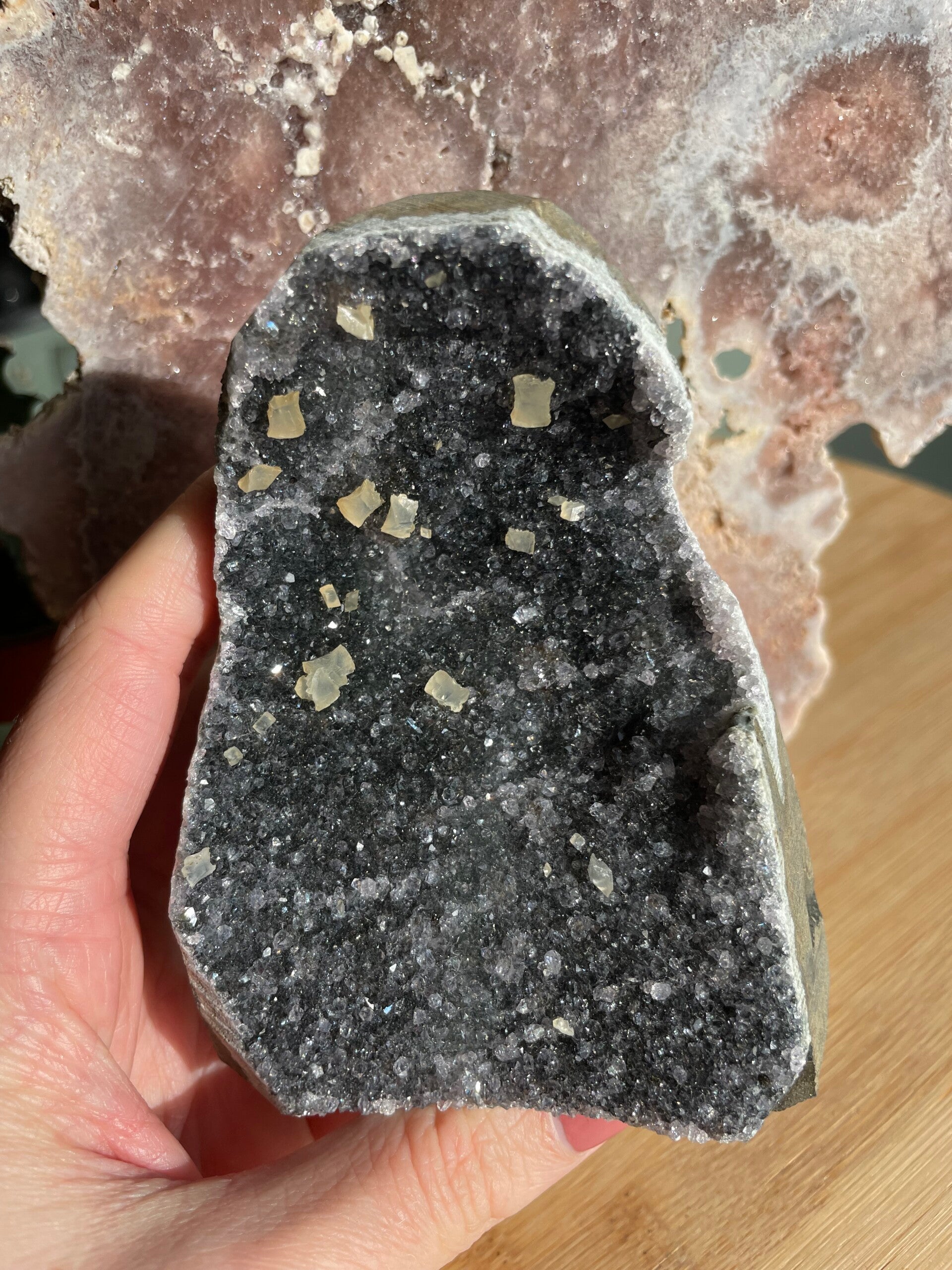 Deze bijzondere variant komt voornamelijk uit Uruguay, een land dat bekendstaat om zijn hoogwaardige, donkergekleurde amethist. De combinatie van glans, diepte en textuur maakt elk stuk uniek en zeer geliefd bij verzamelaars en liefhebbers van edelstenen.