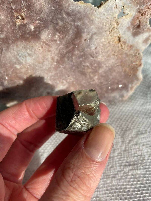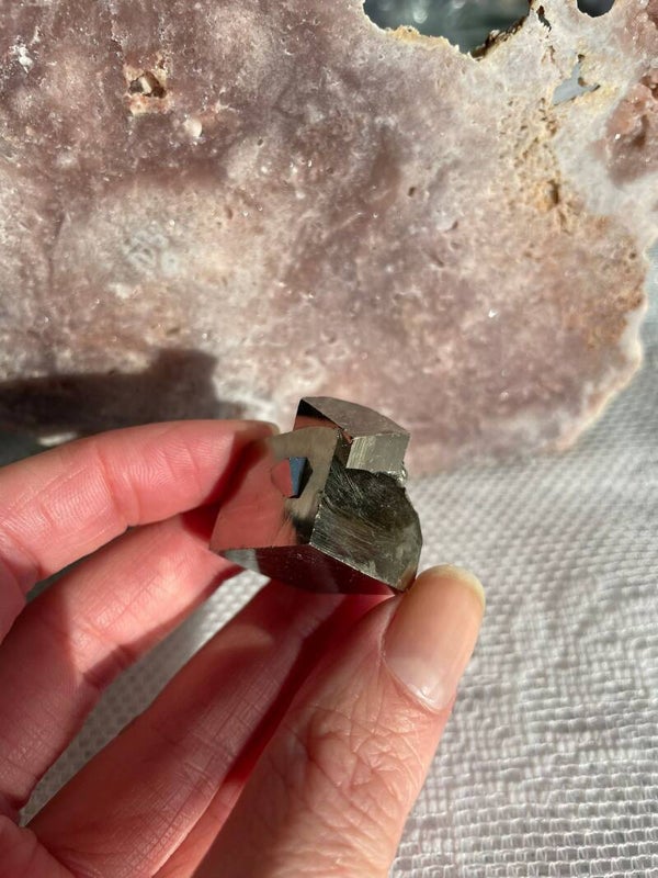 Kubus Pyriet valt direct op door zijn opvallende, regelmatige kubusvormen en glimmende metalen glans. Pyriet, ook wel "fool’s gold" genoemd, dankt zijn bijnaam aan zijn gouden kleur en glans, die op echt goud lijkt, maar een stuk vriendelijker voor je portemonnee is.