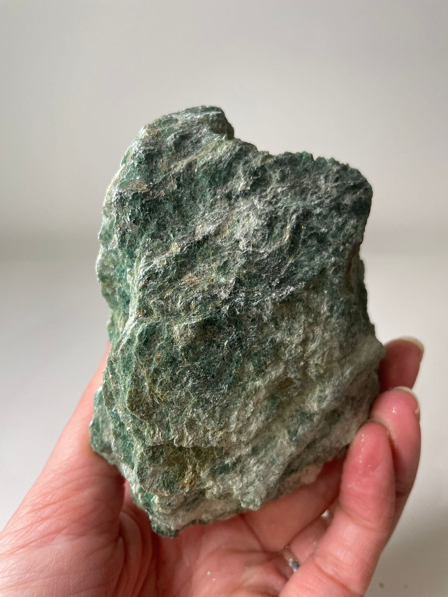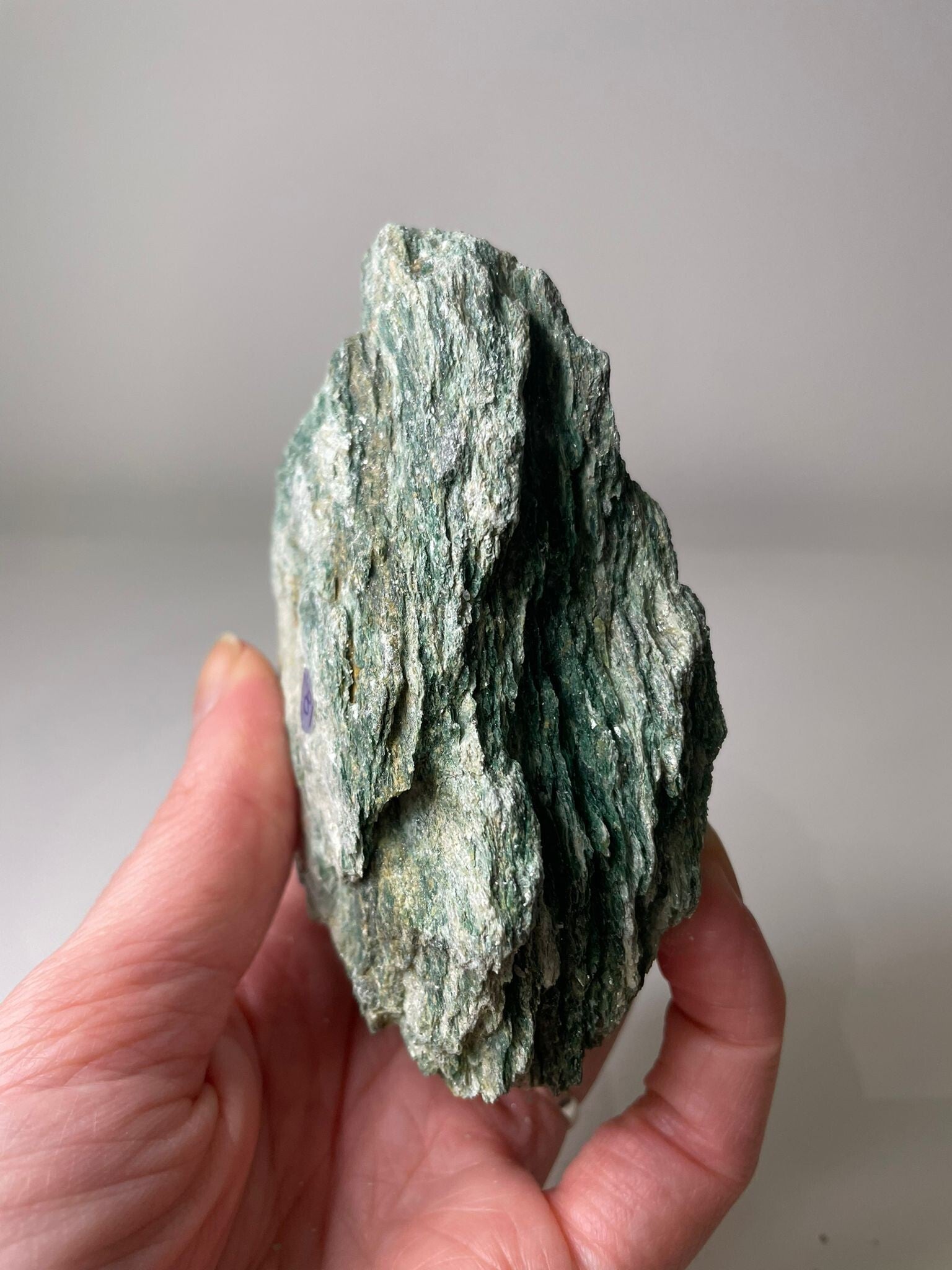 Fuchsiet is een sprankelende groene variant van het mineraal muscoviet (mica). Door het hoge chroomgehalte krijgt het die kenmerkende, levendige groene kleur en vaak een prachtige glinstering alsof er kleine glittertjes doorheen zijn gestrooid. Het is een steen die je direct doet denken aan frisheid en levenskracht.