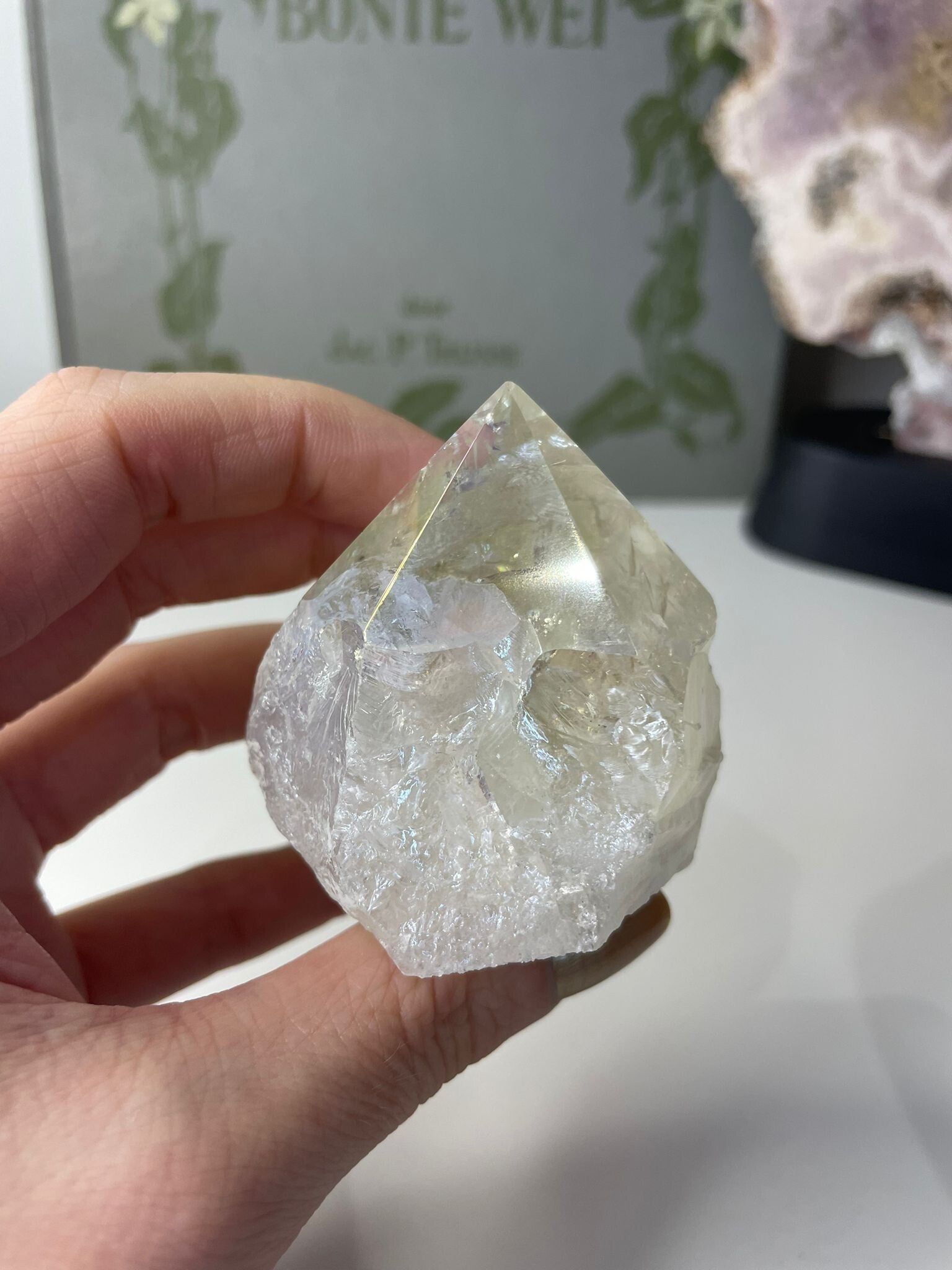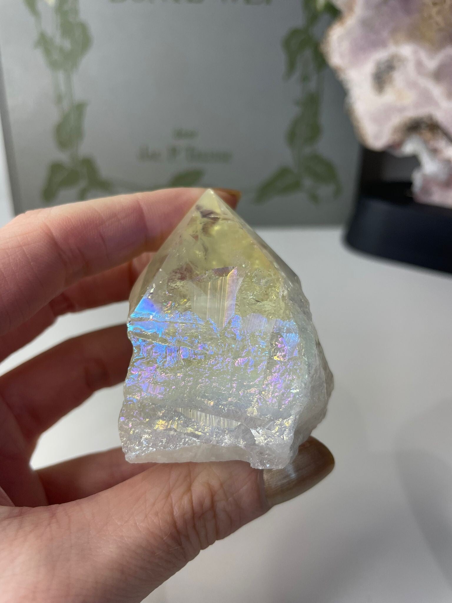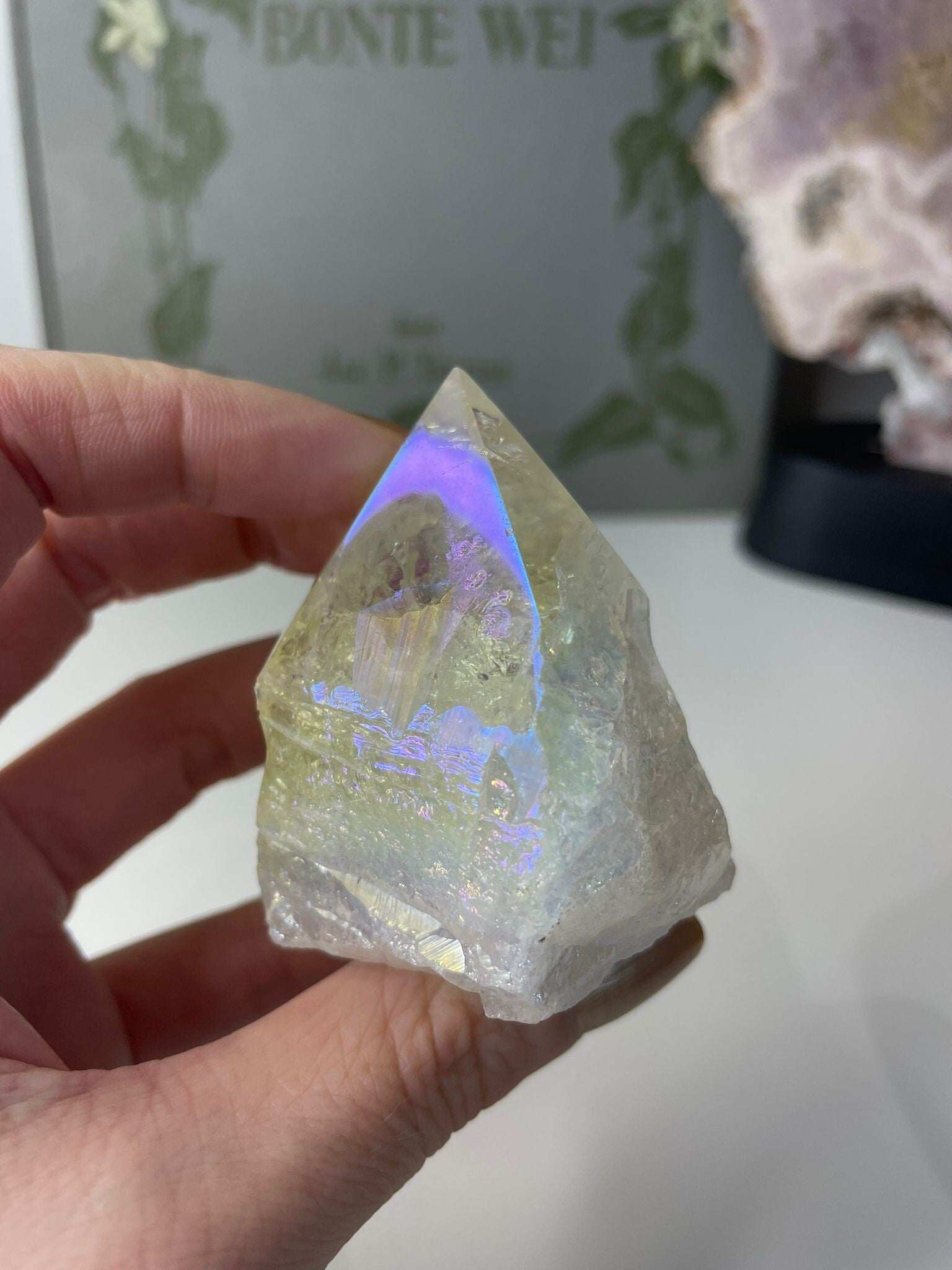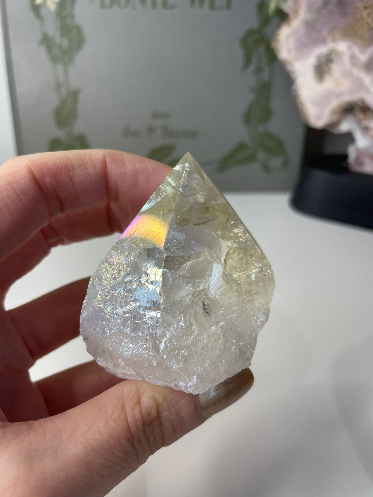 Angel Aura op bergkristal is een magische combinatie van puur bergkristal met een iriserende regenboogglans. Deze glans ontstaat door een speciaal proces waarbij het kristal met edelmetalen zoals platina of zilver wordt behandeld. Het resultaat: een bijna buitenaardse schittering, alsof je naar een regenboog in kristalvorm kijkt.