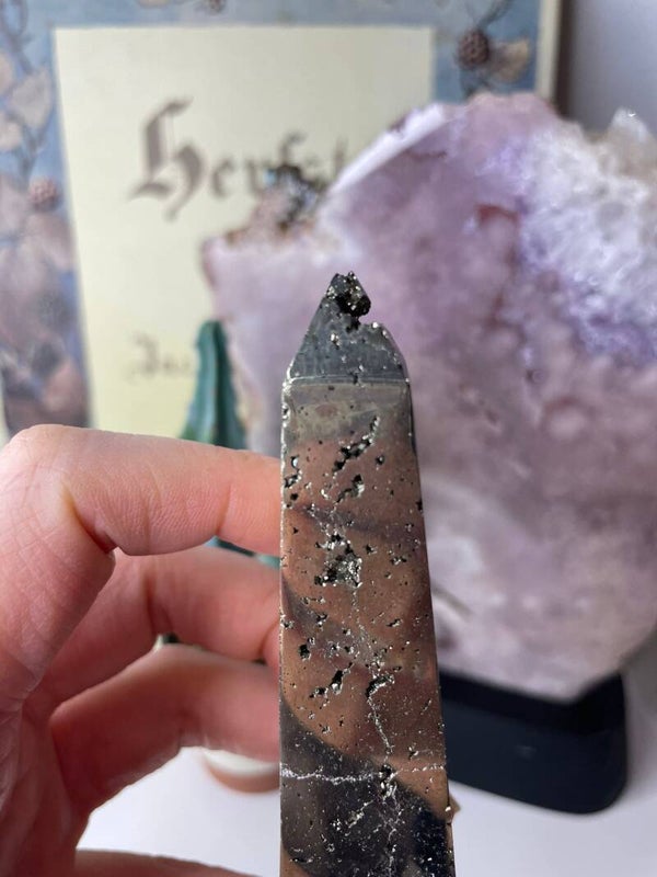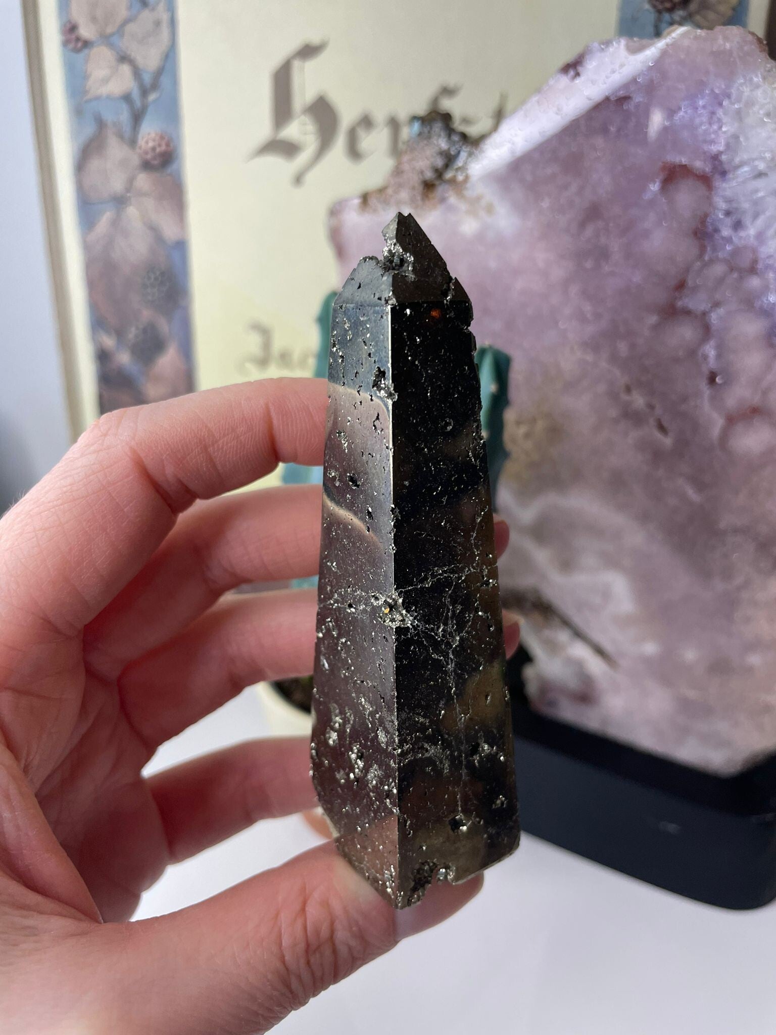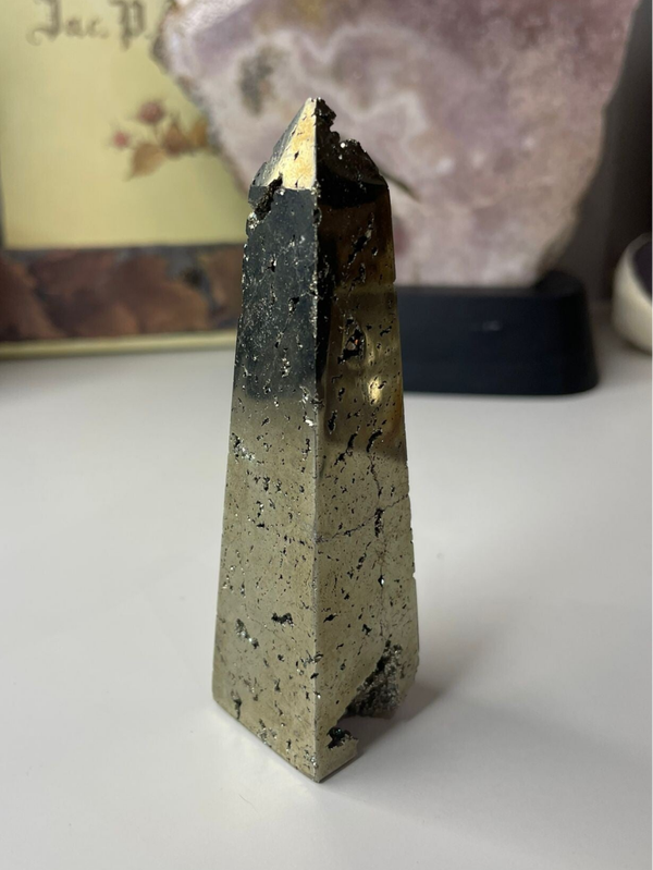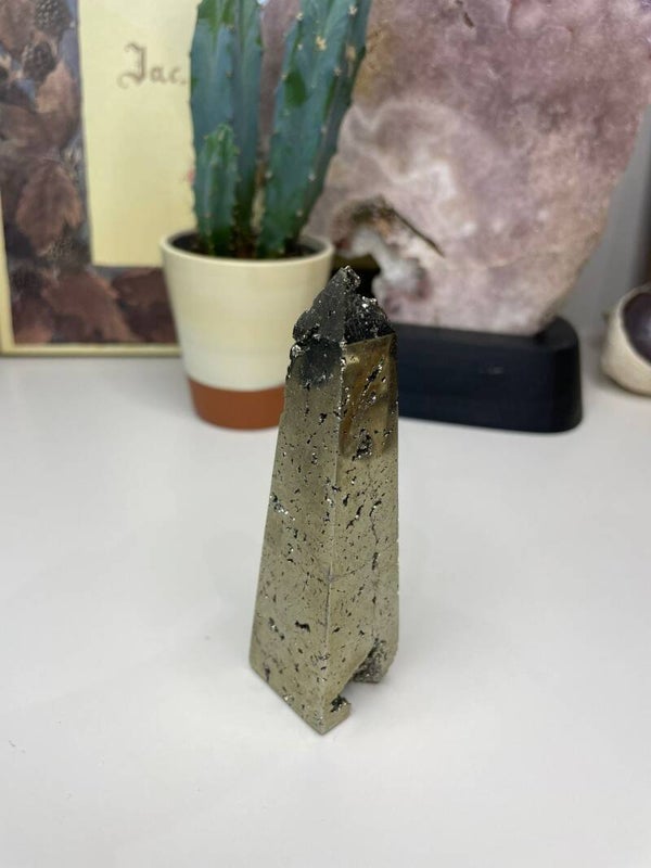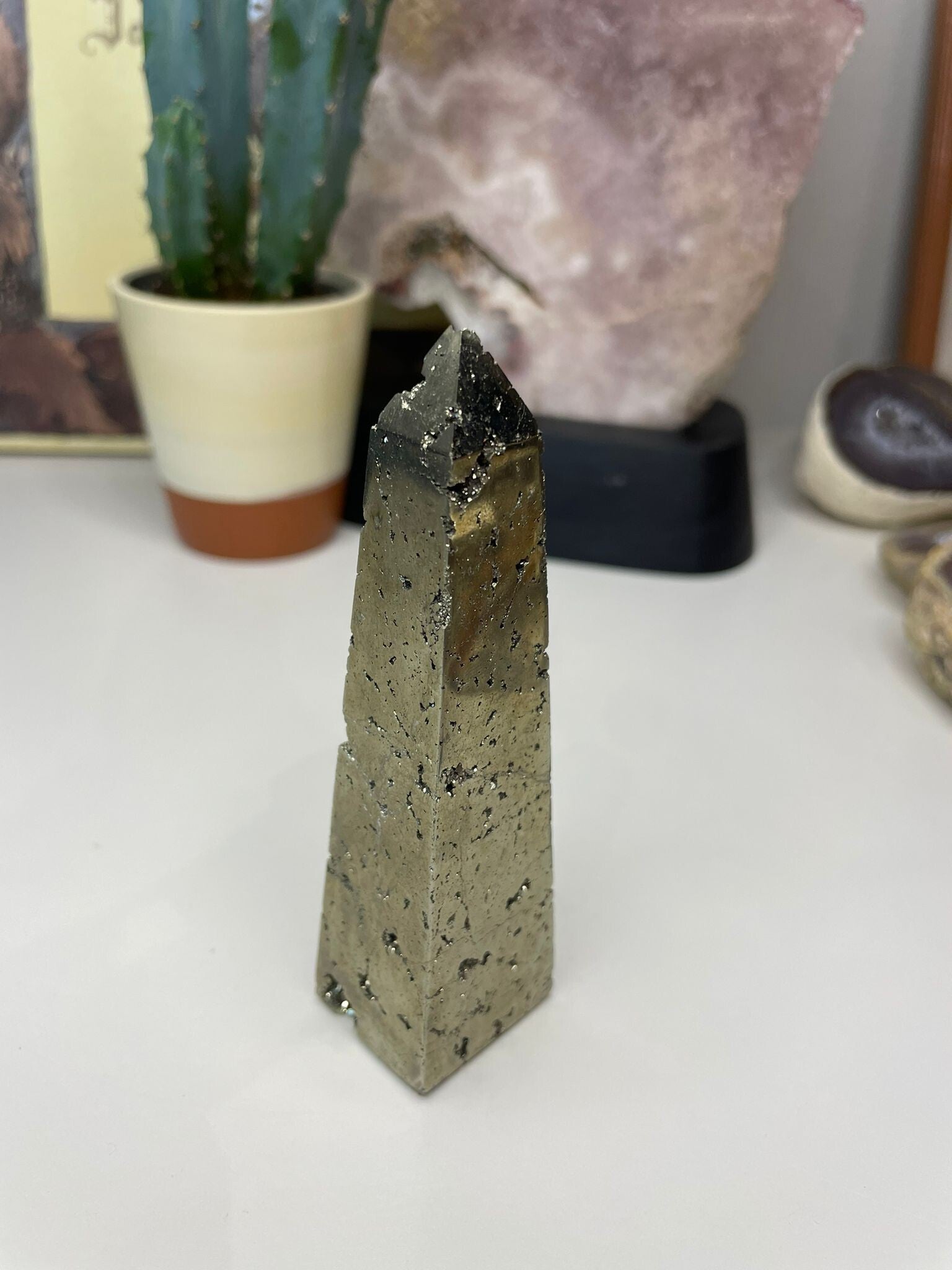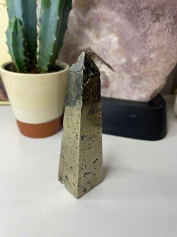 Pyriet wordt ook wel “fool’s gold” genoemd vanwege z’n glanzende, gouden kleur die vaak verward wordt met echt goud. De steen heeft een metallic glans en kubusachtige kristalvormen die elk stukje uniek maken – een echte blikvanger in je collectie.