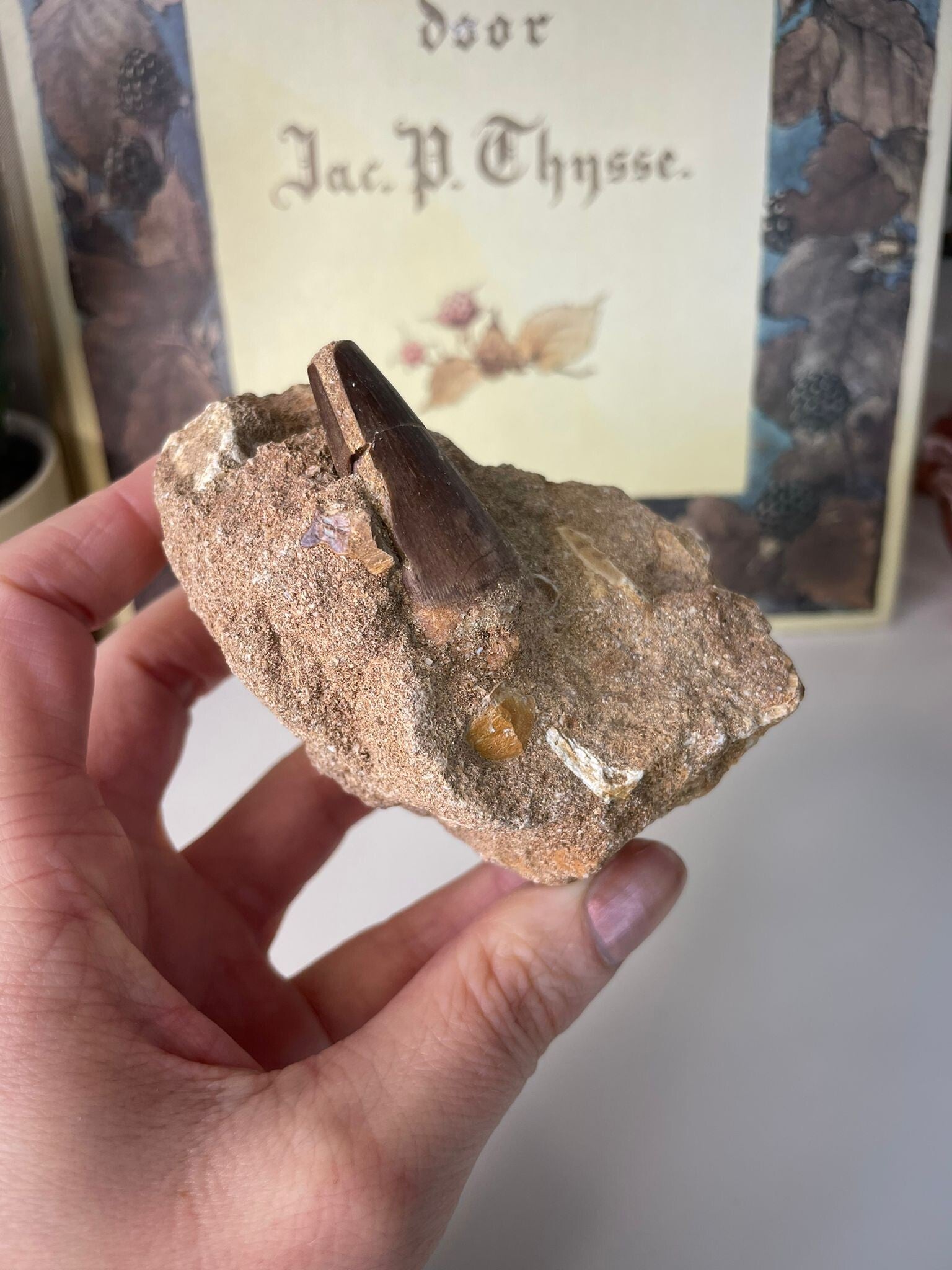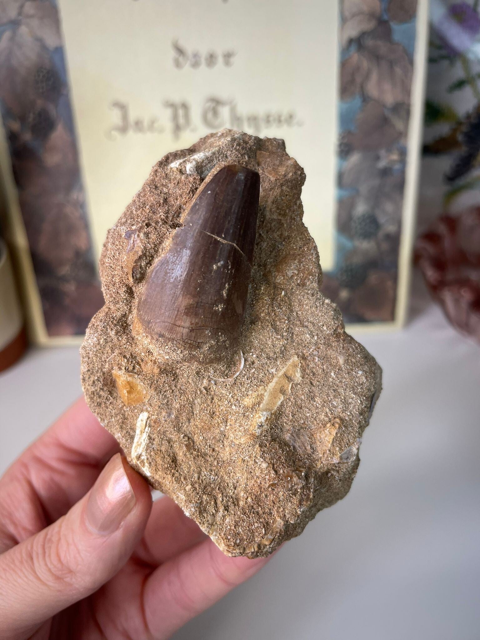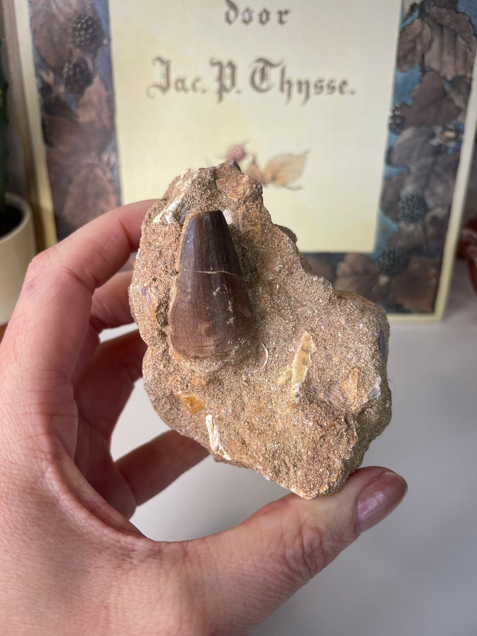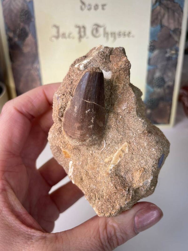 Deze fossiele tand van de Mosasaurus is letterlijk een stukje prehistorie in je hand. De Mosasaurus was een indrukwekkend zeereptiel dat zo’n 70 miljoen jaar geleden door de oceanen zwom, aan het einde van het Krijt-tijdperk. Met een lengte tot wel 18 meter was hij een van de topjagers van zijn tijd – stel je een kruising tussen een krokodil en een dolfijn voor, maar dan nog imposanter.