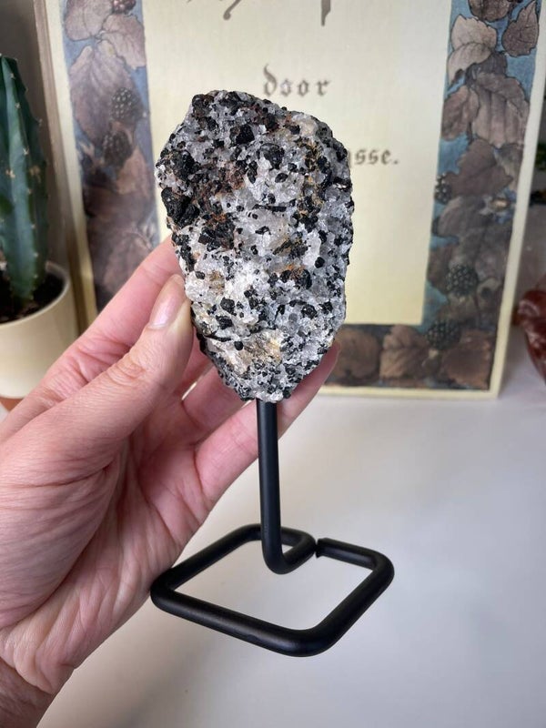 Leuk weetje: de zwarte toermalijn in deze steen heet eigenlijk schörl, de meest voorkomende vorm van toermalijn. De naam klinkt misschien chic, maar het is gewoon de stoere, donkere kern die deze combinatie zo herkenbaar maakt.