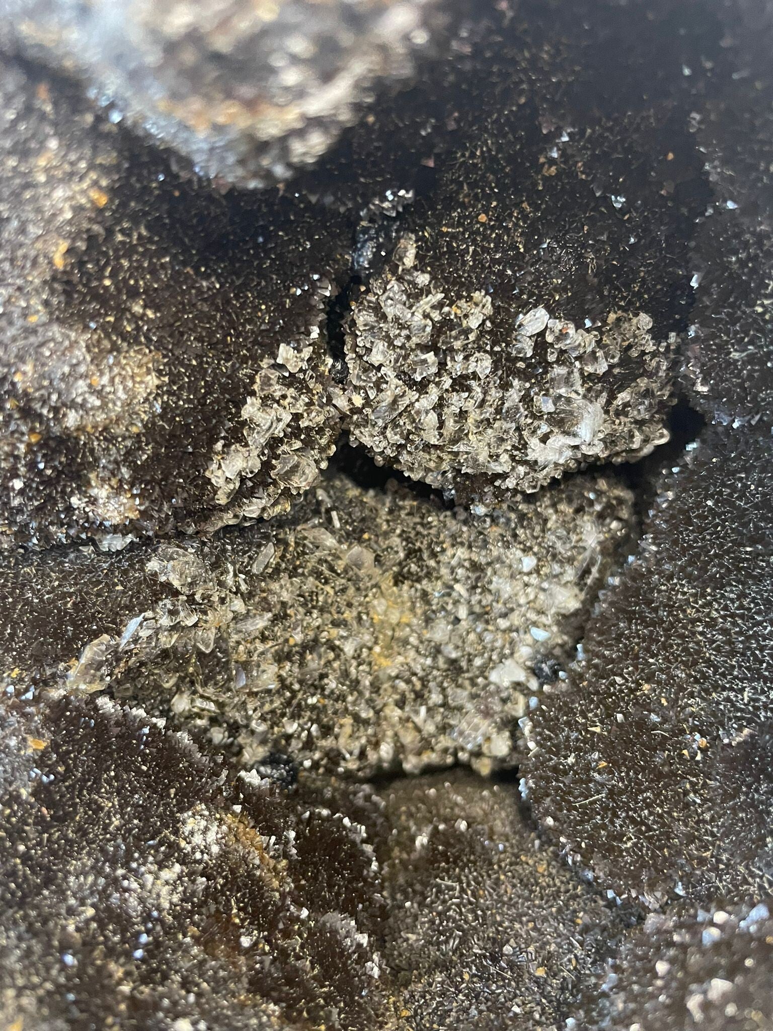 Hij heeft een "puzzel" stukje die eruit te halen is zodat je de prachtige sparkly binnenkant met kleine kristalletjes ziet!