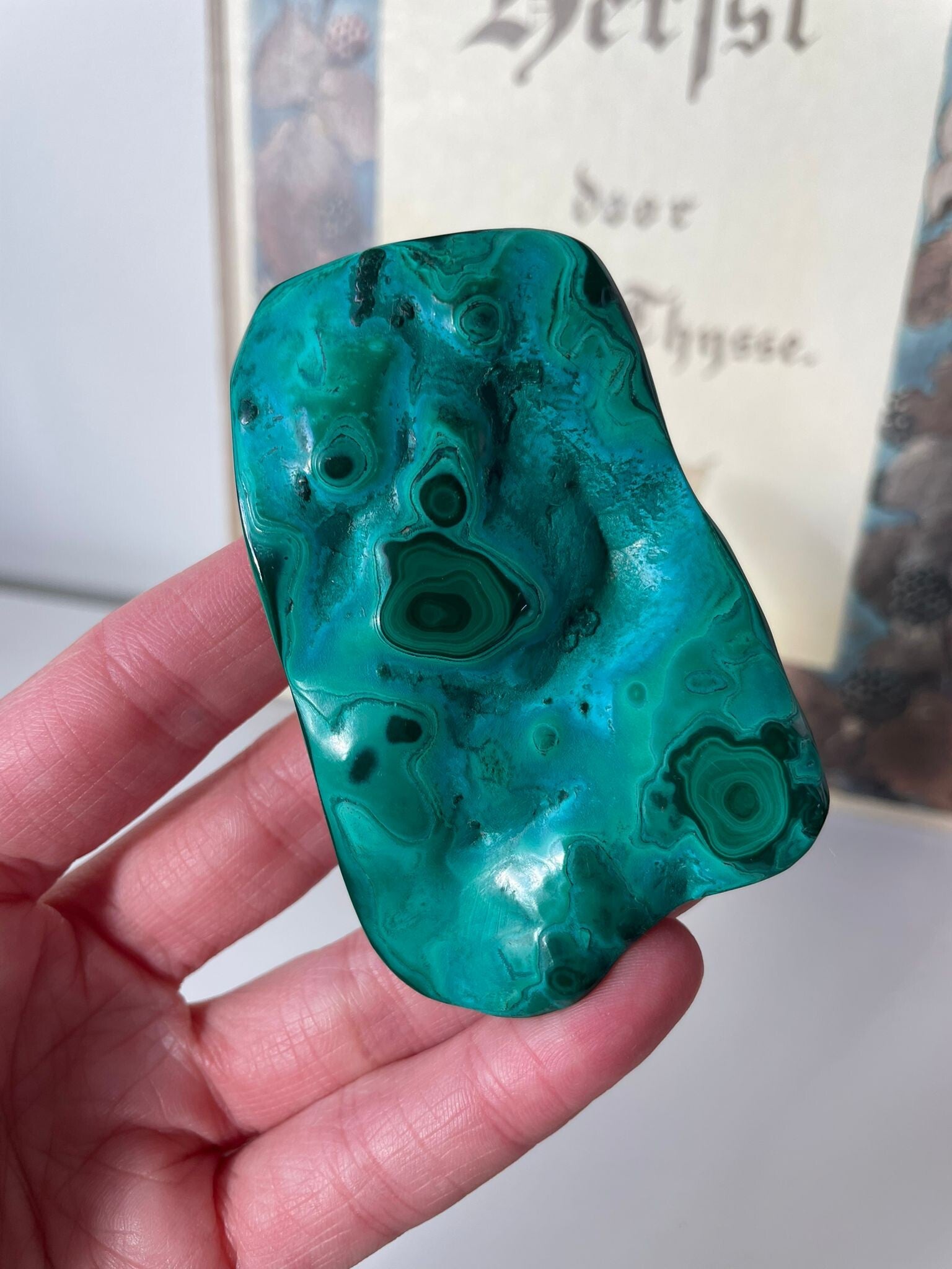 Malachiet herken je meteen aan de diepe, groene kleur met prachtige kringen en strepen die bijna hypnotiserend zijn om naar te kijken. Elke steen heeft een uniek patroon, alsof de natuur met penseelstreken aan het werk is geweest. Het is een echte eyecatcher in iedere collectie.