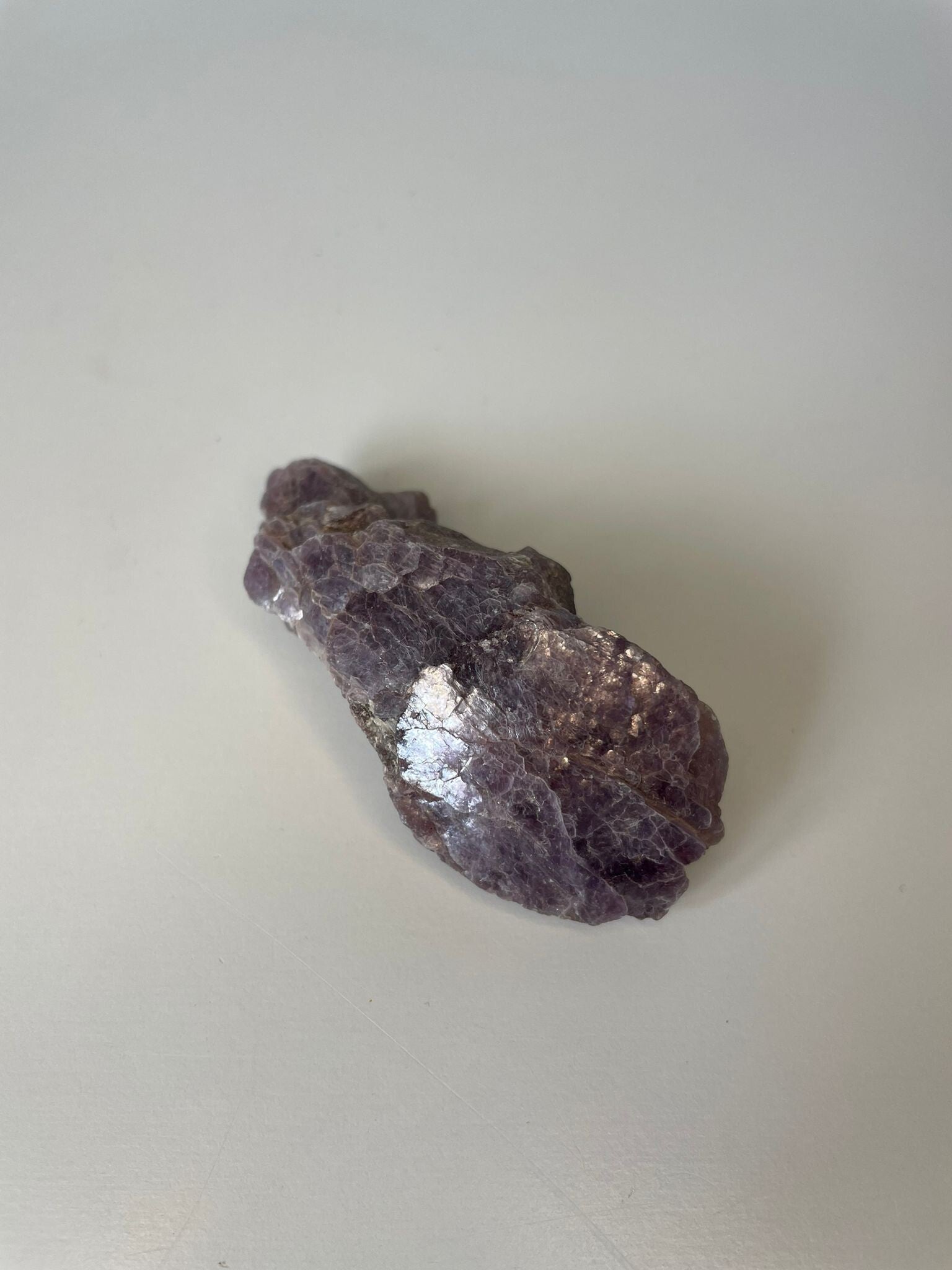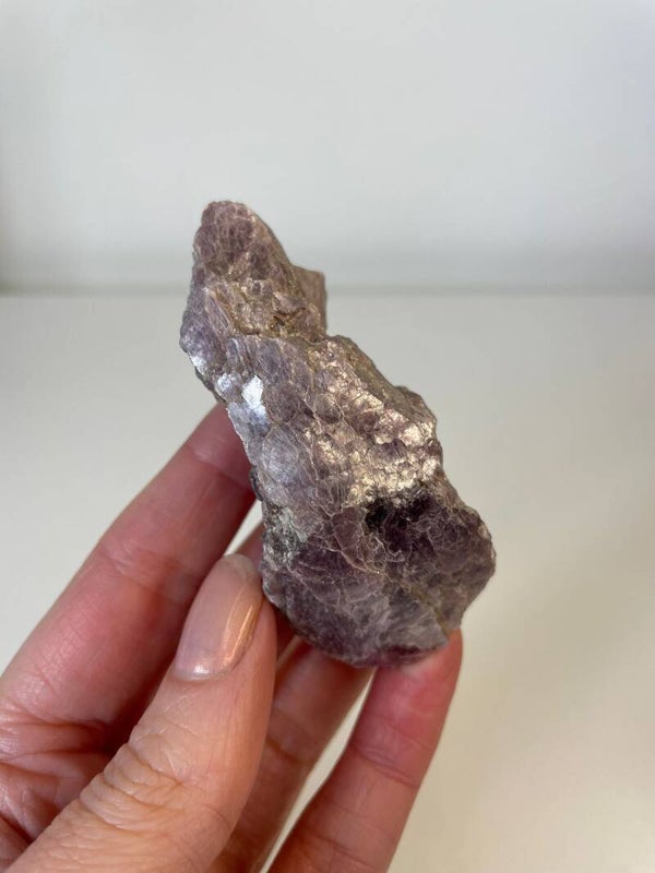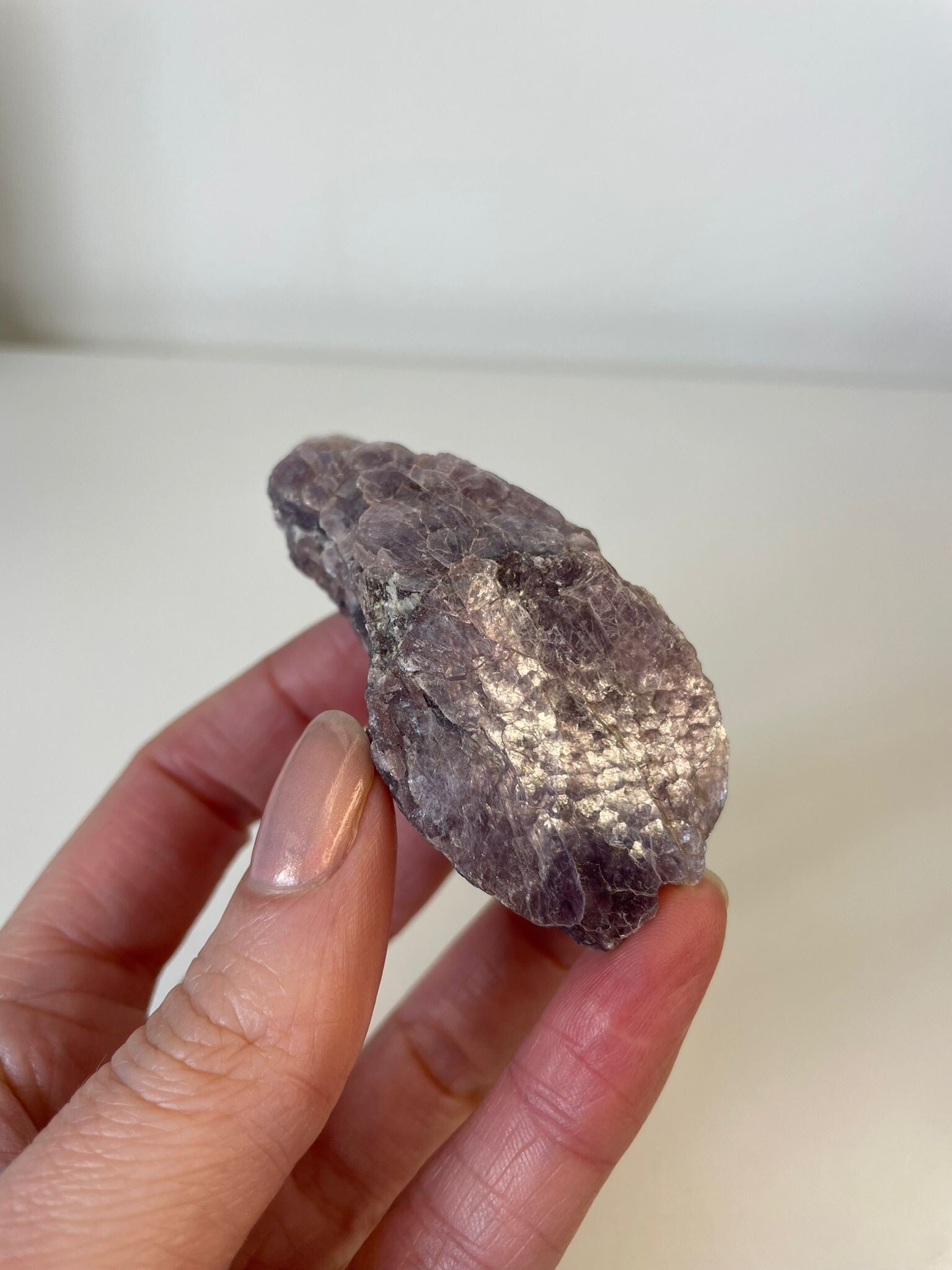 Paarse Mica is zo’n steen waar je even naar blijft kijken, laag over laag, met een zachte metallic glans die lijkt te bewegen in het licht. Deze bijzondere steen bestaat uit dunne plaatjes die moeiteloos over elkaar heen schuiven, waardoor hij een bijna zijdeachtige glans krijgt. De paarse kleur komt van natuurlijke sporen van lithium in het mineraal.